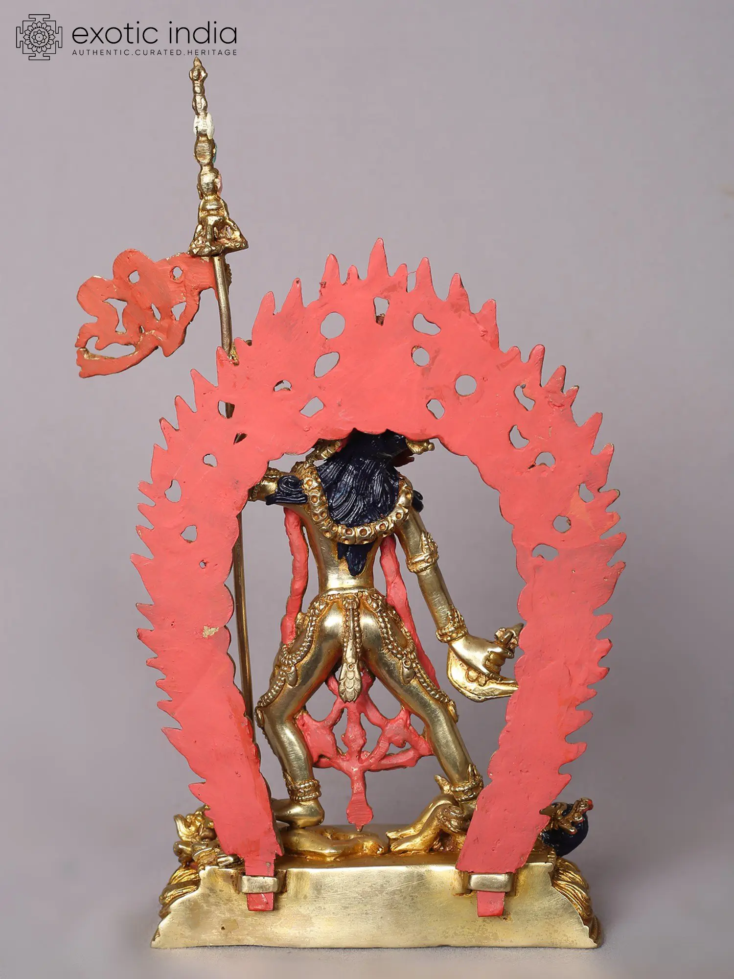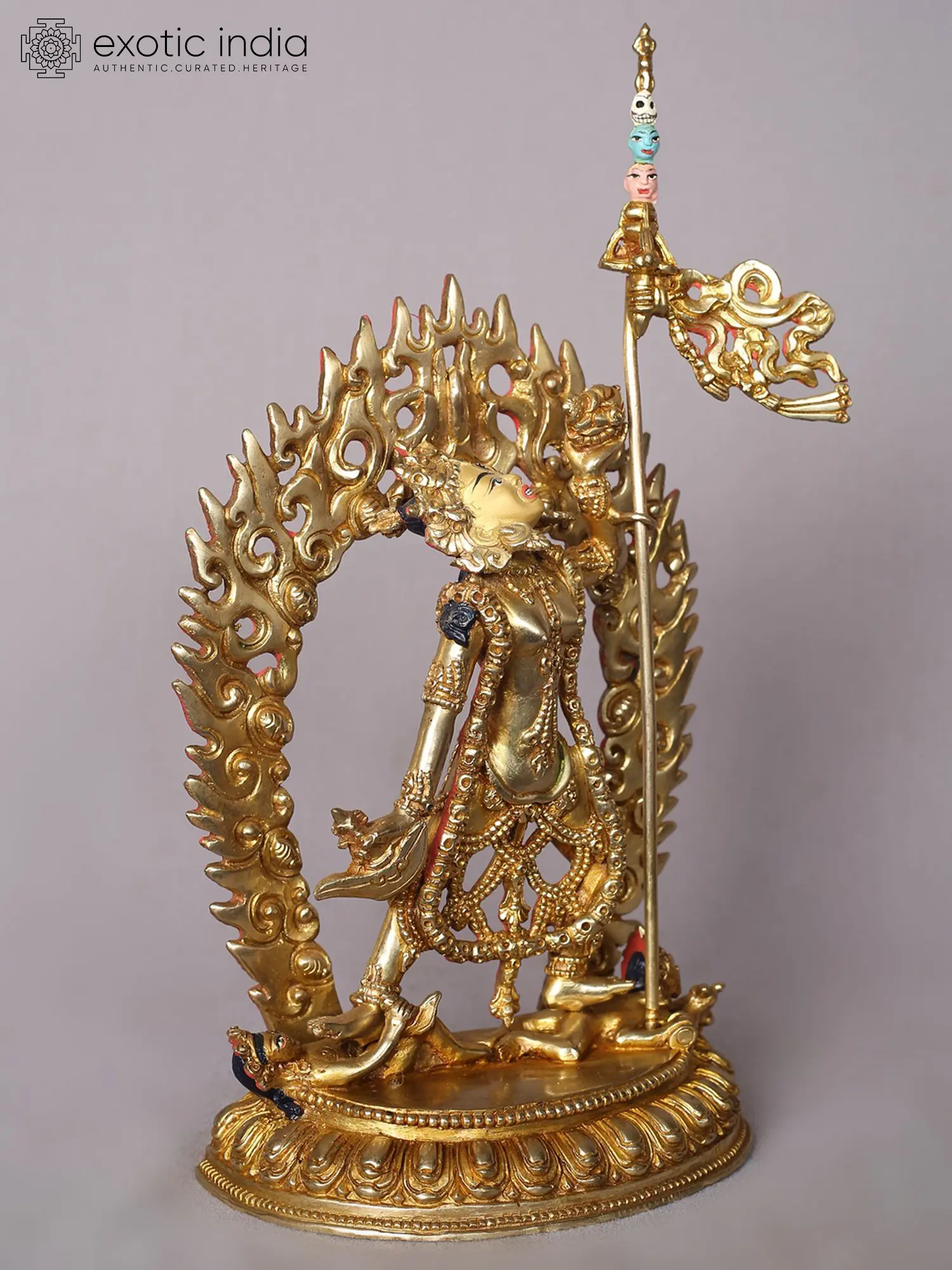 Adorned with a necklace made of skulls and wielding a skull cup along with a flaying knife, Vajrayogini's symbolism runs deep. The necklace of skulls represents the Sanskrit alphabet's letters and signifies the purification of speech. The knife, in its symbolic role, severs worldly attachments. She is enveloped by flames, representing her wrathful nature and fierce transformative power.