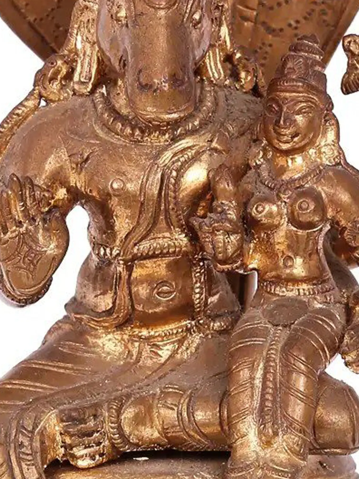 Cloaked in regal splendour, adorned with the royal Kireedam Mukut and celestial jewellery, Hayagriva wields the Sudarshan Chakra and Panchajanya with divine grace. His right hand extends in Abhaya Mudra, a symbol of fearlessness and courage. In this celestial tableau, Goddess Lakshmi, the epitome of purity with a lotus face, graces his lap. She cradles a lotus, the emblem of purity and prosperity. Together, they epitomise the holy synthesis of intellectual brilliance and material riches, inviting you to delve into the infinite realms of enlightenment and abundance.