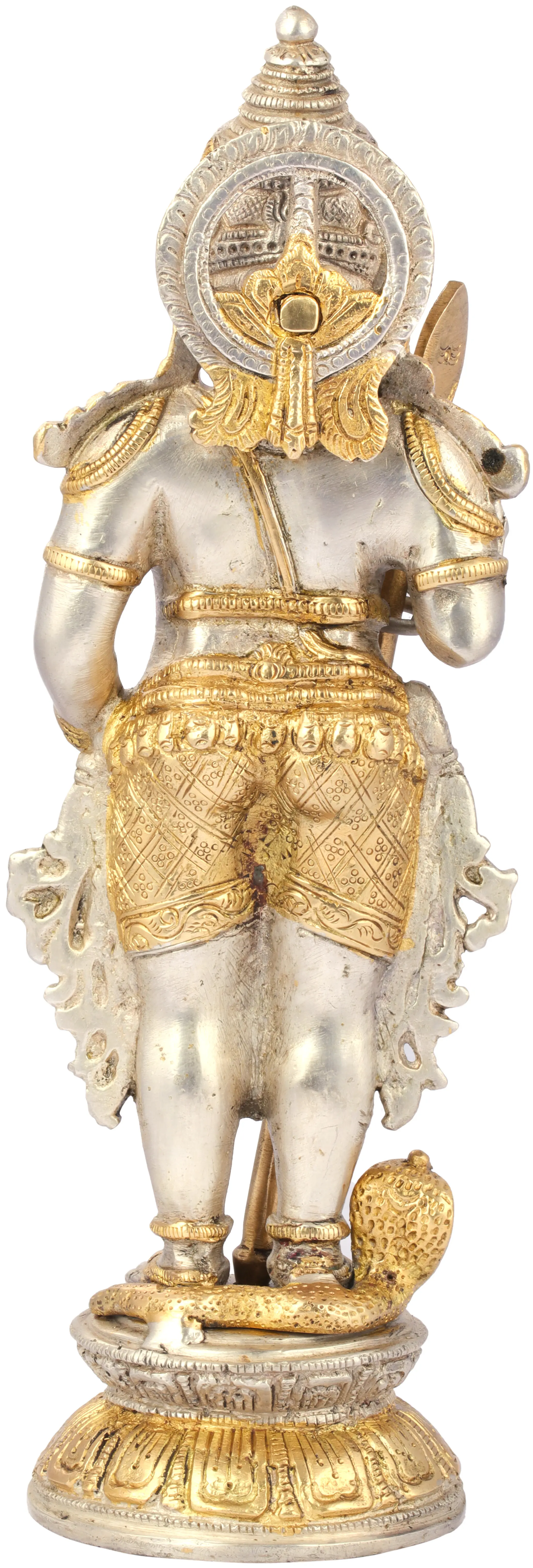 Kumara Karttikeya's magnificent Brass Statue represents grace and heroism. Lord Kartikeya stands in the Kati Hasta stance, commanding the three planets. Kumara Karttikeya symbolizes the commander of the gods' young and heroic demeanor. His Vel represents his mother, Goddess Parvati's grace. The lotus pedestal represents his regal rank. This brilliant silver-finished sculpture represents courage, knowledge, and valor, making it a symbol of power and heavenly protection, inspiring followers with his warrior spirit.