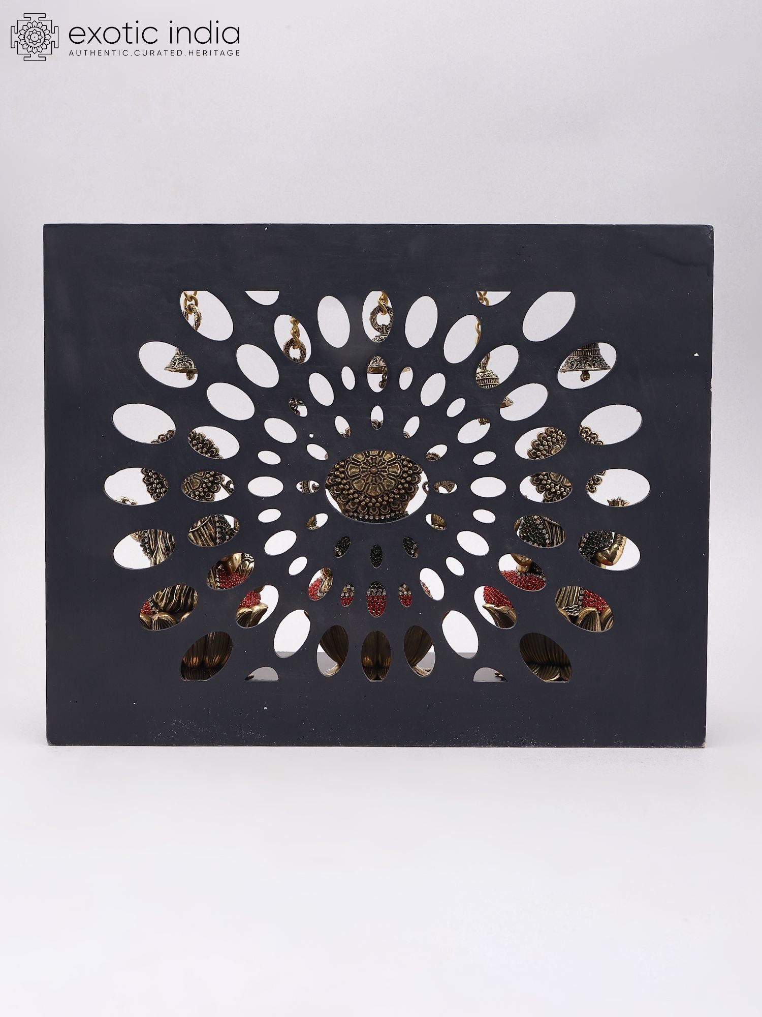 17" Divine Trinity: Lakshmi, Ganesha, Saraswati Brass Sculptures with Bells | Wood Framed Wall Hanging