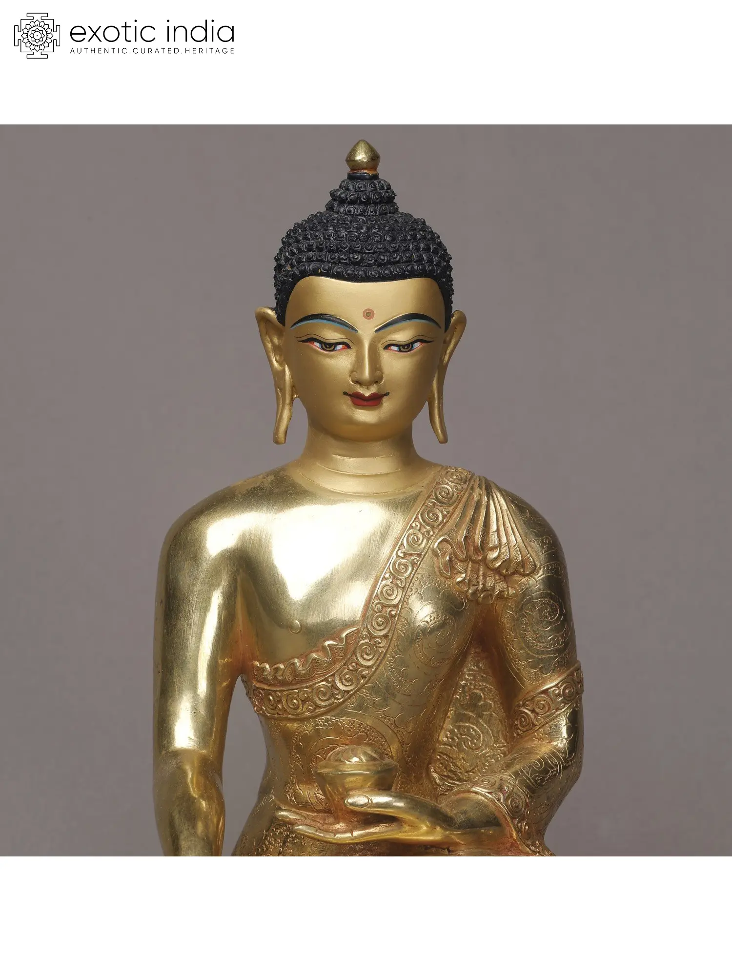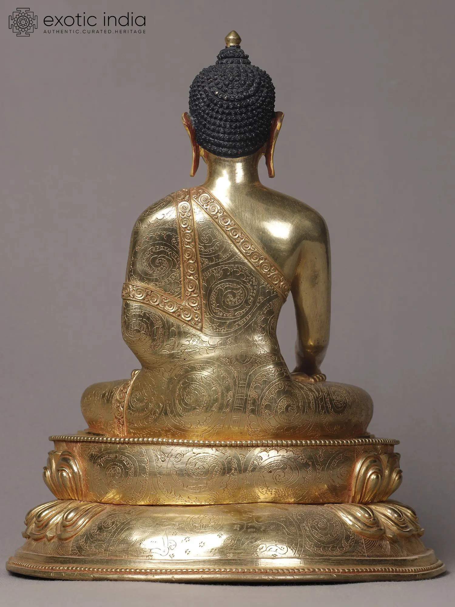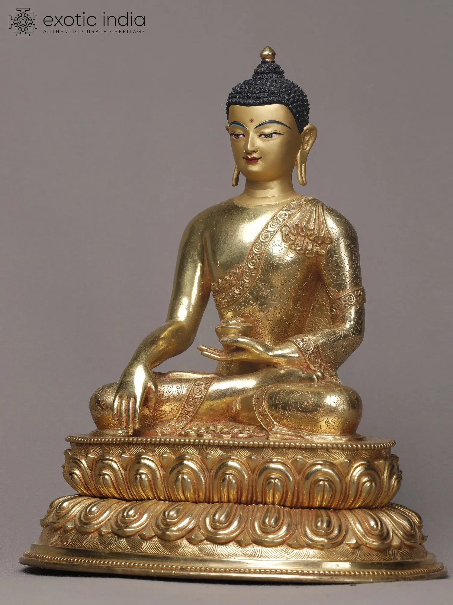 An image of the Buddha in a Buddhist monastery is the central deity around whom all the rituals and meditation of the followers are centered. It is through meditating in front of a Buddha icon- moving from his outer gloriousness to his inner splendor that a person can begin their journey to Enlightenment. Emanating tranquility and glowing as if from within, this large Nepalese Buddha Shakyamuni gilded copper icon is one such Buddha-murti that holds the path to Ultimate Wisdom. The mudra in this icon is Bhumisparsha, which captures the powerful story of Buddha's victory over Mara- the demon of basal desires, as his final roar before becoming the Enlightened One.
