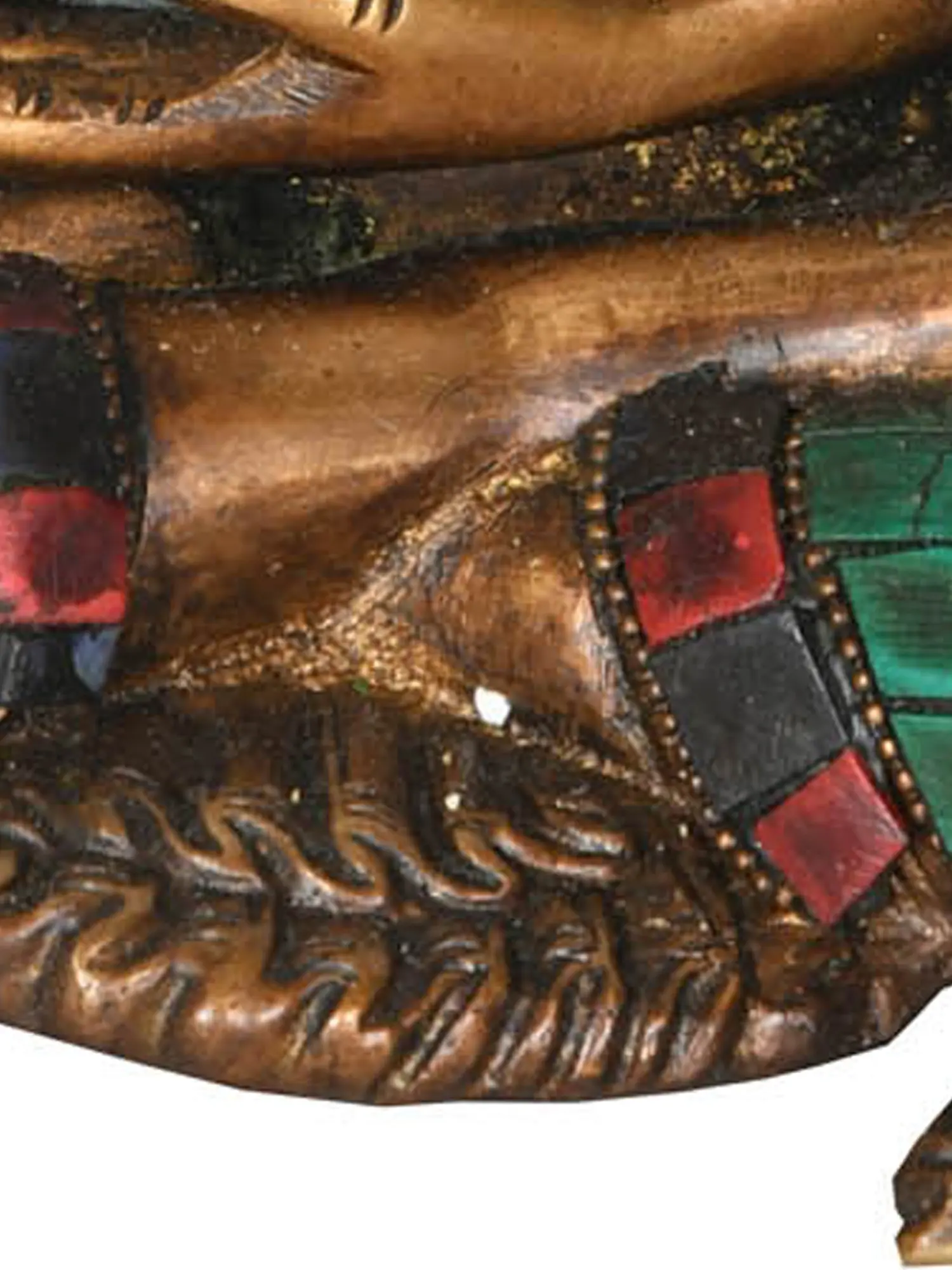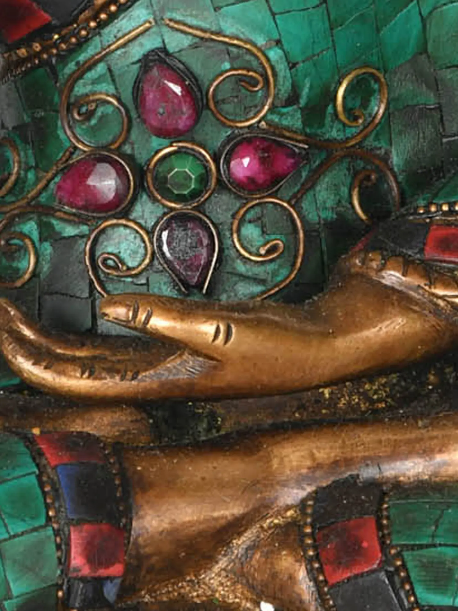 The artistry extends beyond the masterful brass casting. The statue is adorned with vibrant inlay work, featuring mosaic-like tiles of rich green, accented with deep red and black stones. These colorful embellishments not only enhance the visual appeal but also hold symbolic significance in Tibetan Buddhism. The emerald green often represents growth, harmony, and enlightenment, while the ruby red can symbolize compassion and vitality. The careful placement of these stones, interspersed with delicate golden swirls, creates a stunning visual tapestry that draws the eye and deepens the spiritual resonance of the piece. Each element, from the perfectly sculpted urna on Buddha's forehead to the subtle modeling of his robes, is a testament to the skilled hands that brought this sacred image to life.
