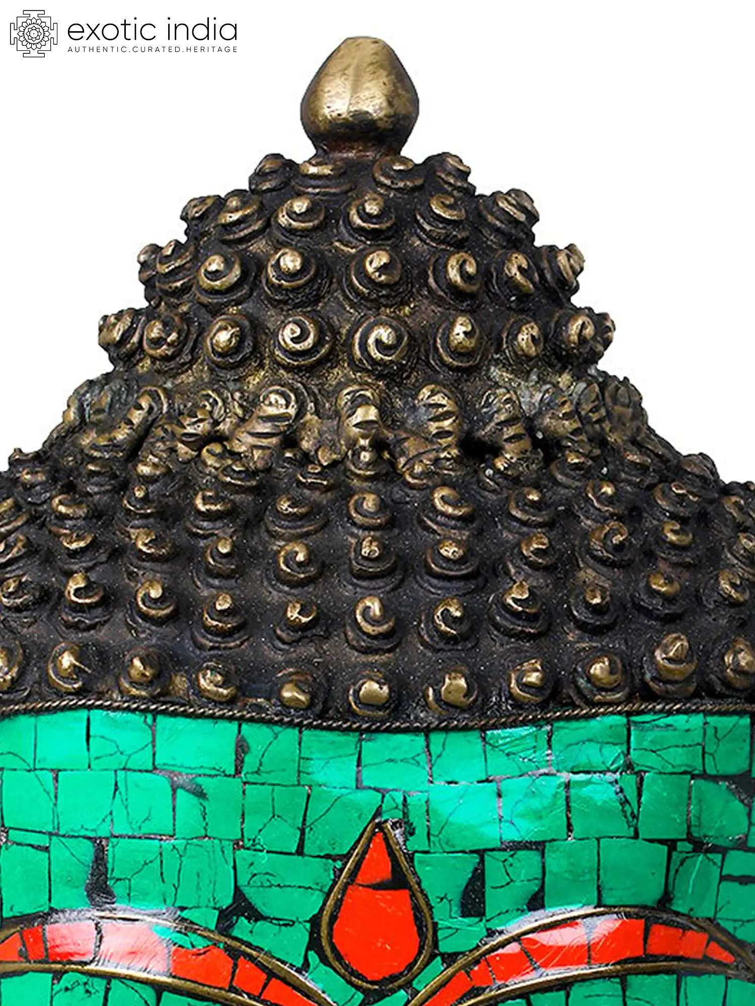 This particular Buddha head showcases the rich artistic heritage of Tibetan Buddhism. The bold use of color, particularly the striking green against the rich tones of brass and coral-like accents, is characteristic of Tibetan thangka paintings and mandalas. The decorative elements on the base and ears, with their floral motifs and geometric patterns, further echo the intricate artistry found in Tibetan monasteries and sacred objects. The elaborate curls of hair, rendered in burnished brass, are typical of depictions of the Buddha in this tradition, symbolizing the vastness of his enlightenment. The overall impression is one of both powerful spirituality and exquisite artistry, designed to inspire devotion and contemplation.