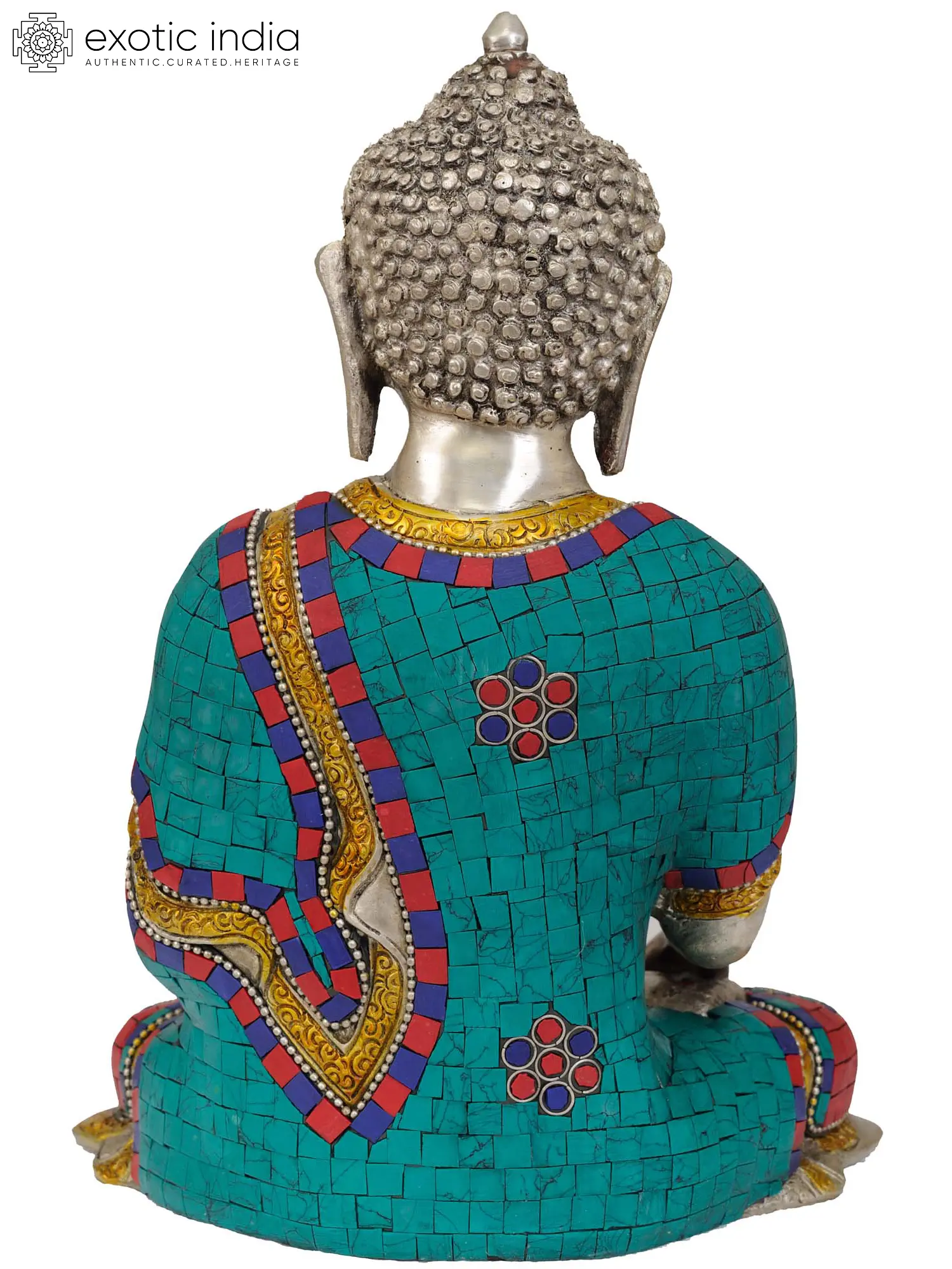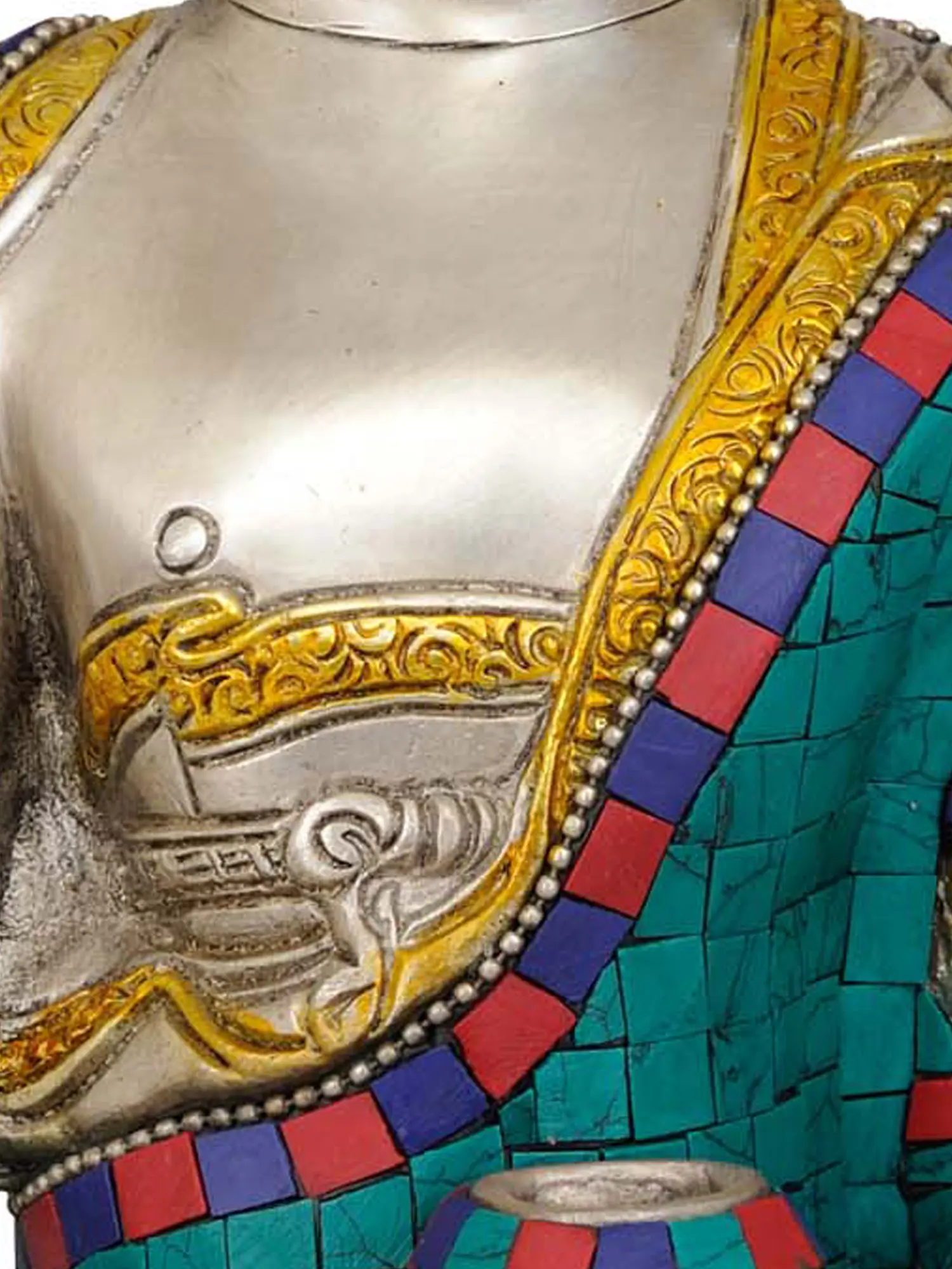 Crafted by skilled artisans in India, this statue is a testament to traditional artistry and spiritual devotion. The use of brass provides a durable and lustrous base, which is then meticulously inlaid with vibrant stone accents. These colorful tesserae, predominantly in shades of turquoise, red, and deep blue, are arranged in intricate patterns, enhancing the richness and visual appeal of the robe. The golden borders, adorned with delicate detailing, further elevate the sculpture, drawing the eye to the divine presence it represents. The thoughtful inclusion of smaller Buddha figures within the robe’s design adds layers of symbolism, perhaps alluding to the continuous lineage of awakened beings or the universal accessibility of the Dharma.