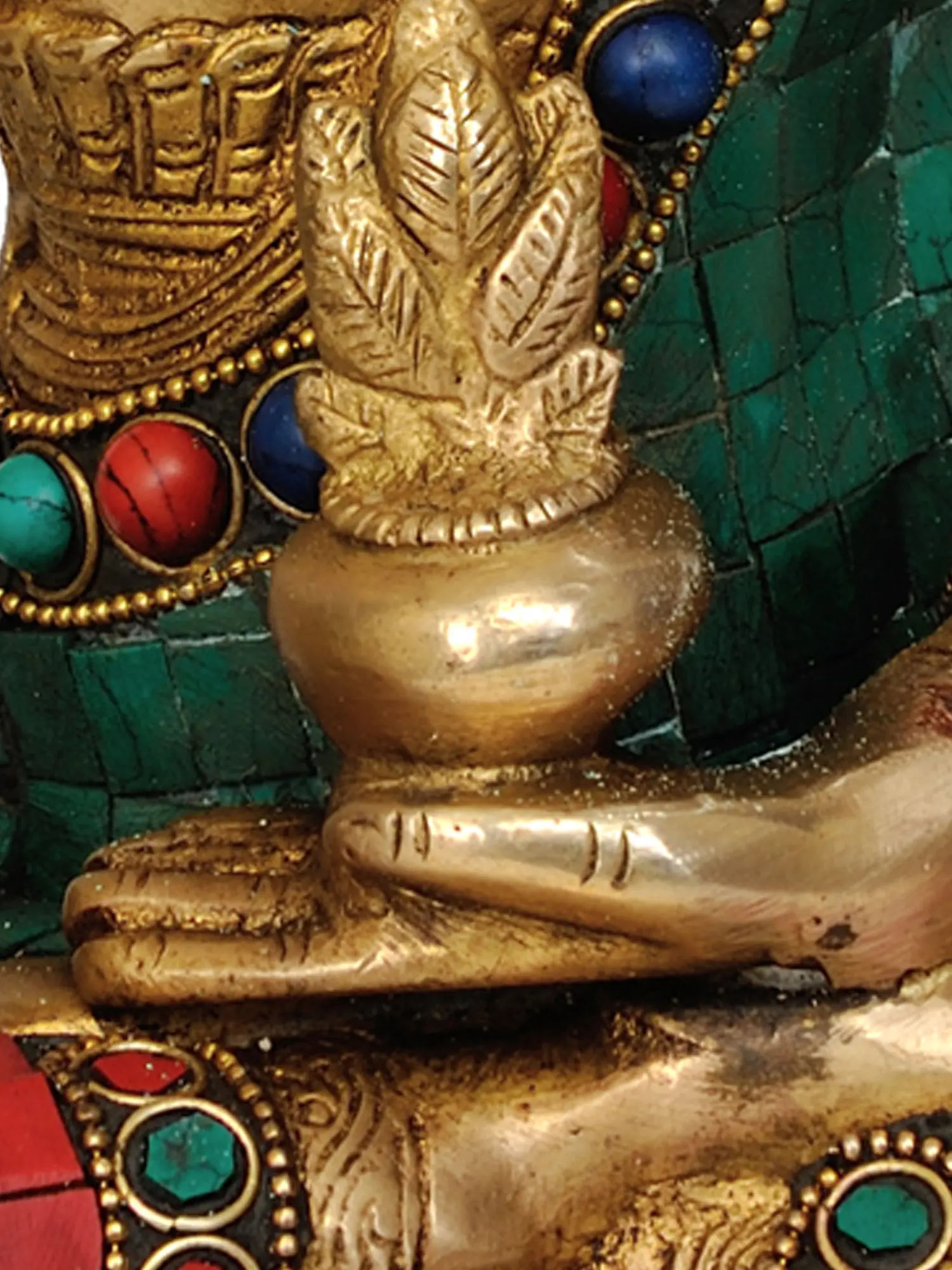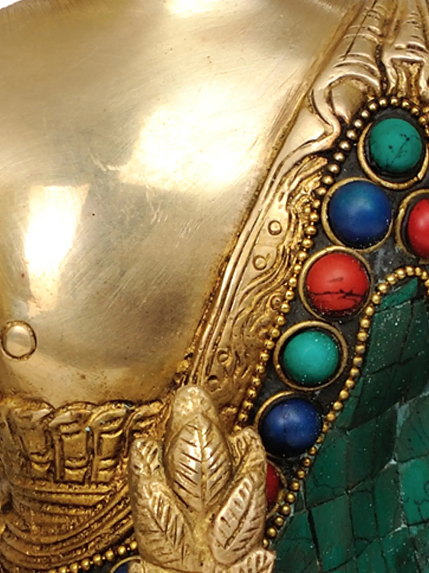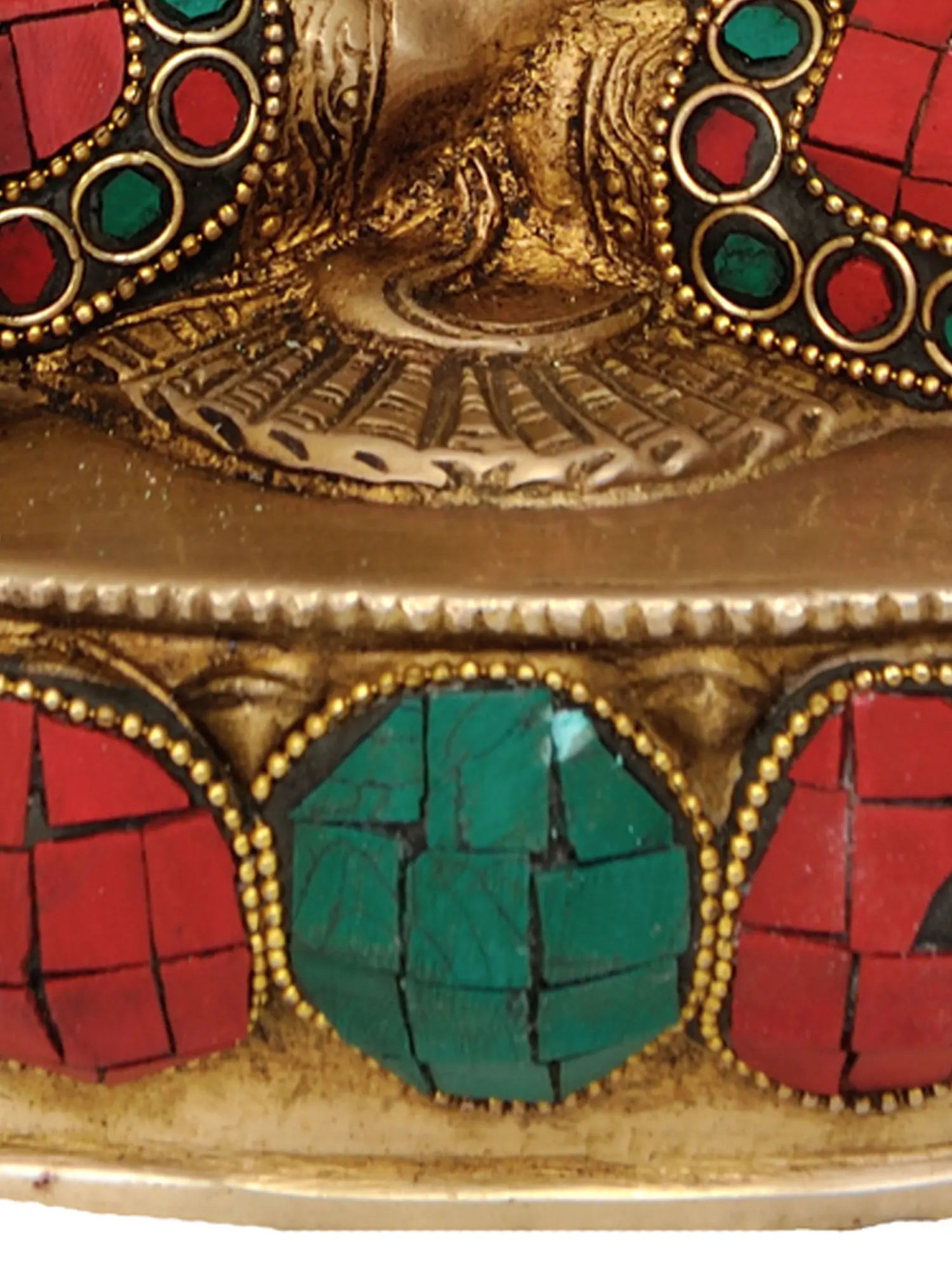 Handcrafted with meticulous attention to detail in India, this statue is a testament to the enduring legacy of Indian artistry. The smooth, lustrous brass serves as the perfect medium to convey the serenity and inner peace of the Buddha. The traditional robe is richly adorned with vibrant inlays of turquoise, coral, and lapis lazuli, meticulously set within intricate brass work. These precious stones not only add a touch of opulence but also carry symbolic significance in various spiritual traditions, representing wisdom, vitality, and spiritual insight. The rich green of the turquoise and the deep red of the coral evoke the lushness of nature and the vibrancy of life, while the deep blue of the lapis lazuli hints at the boundless expanse of the cosmos. The base of the statue, also embellished with this striking mosaic of color and brass, further enhances its visual appeal and spiritual aura.