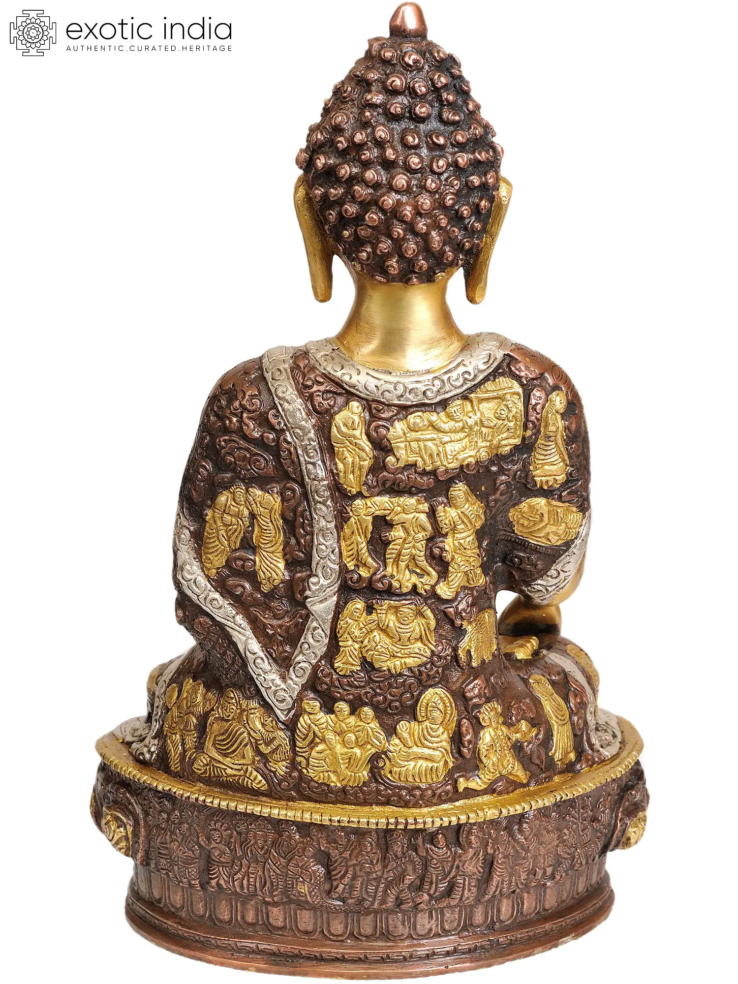 11" Lord Buddha in the Bhumisparsha Mudra (Robes Decorated with Scenes from the Life of Buddha) In Brass | Handmade | Made In India