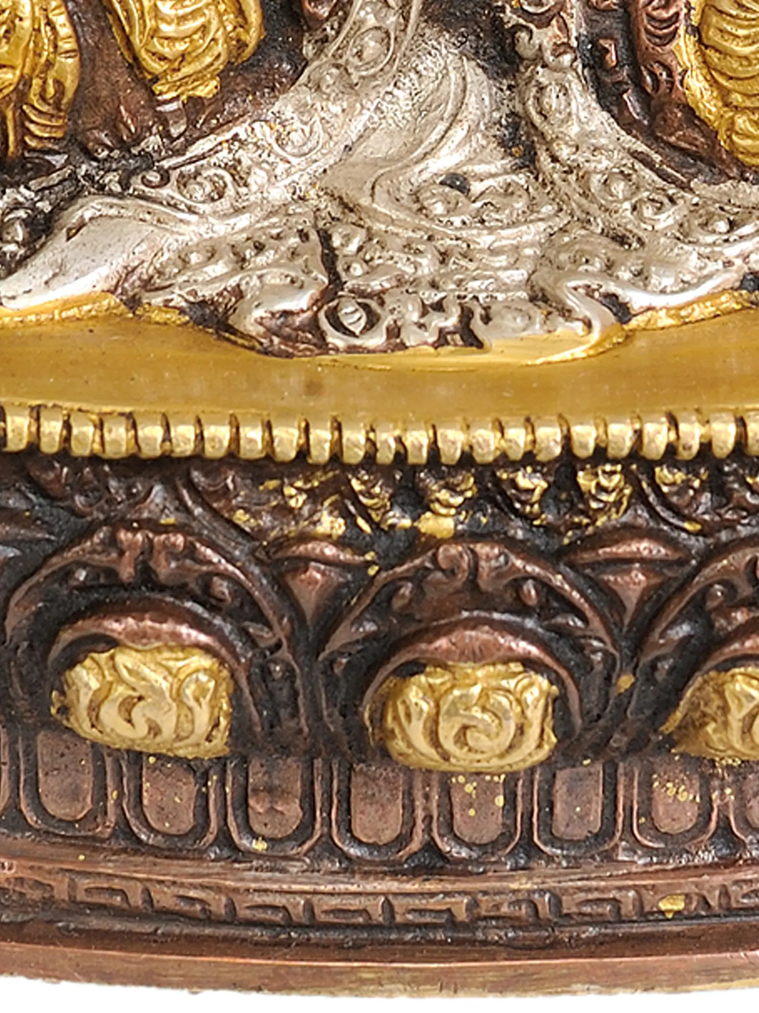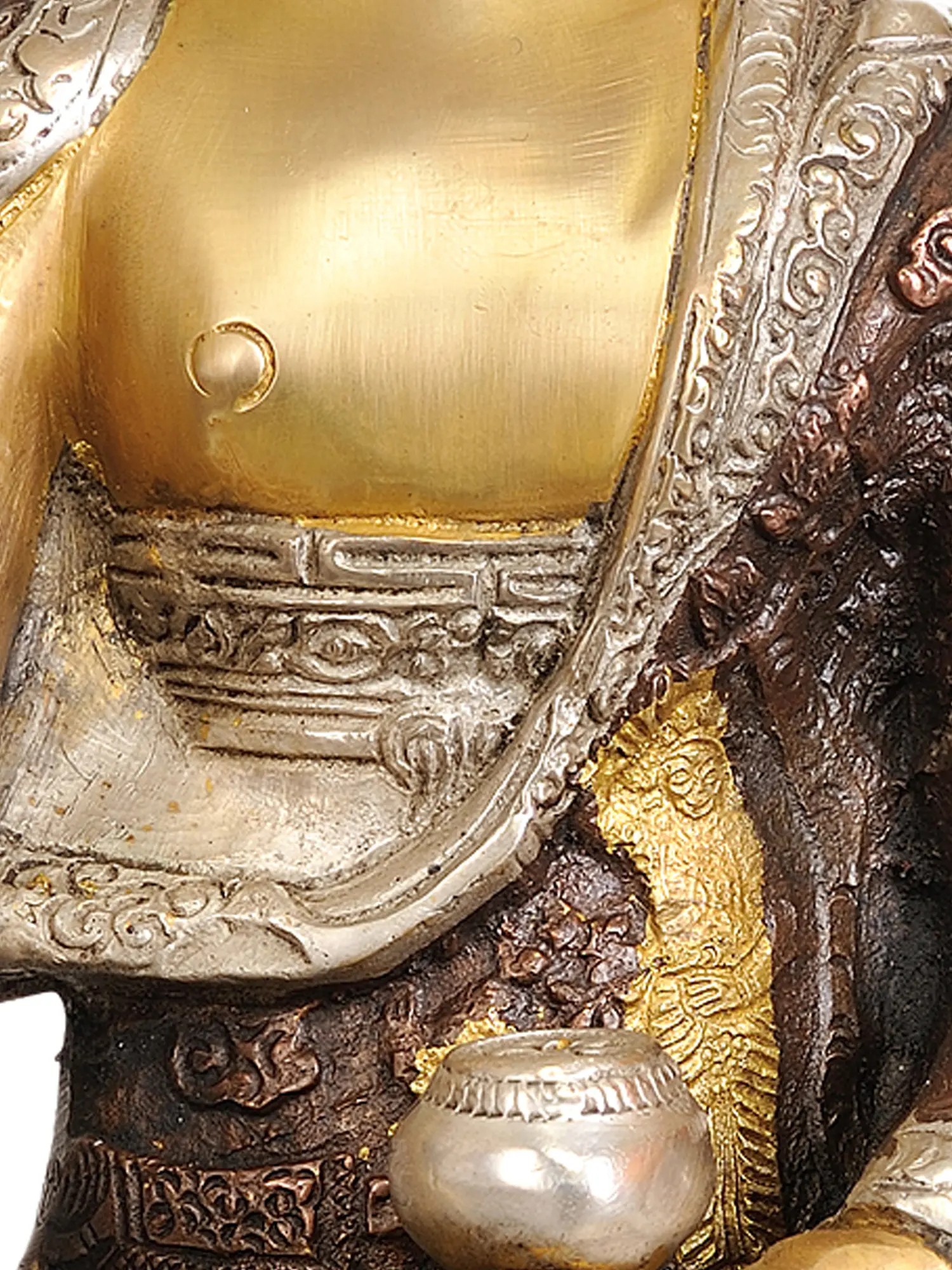 Handmade in India by skilled artisans, this statue is a testament to generations of craftsmanship. Cast in durable brass, it possesses a timeless beauty that will grace any space for years to come. The robes of the Buddha are not merely cloth but a canvas of narrative artistry. Intricately decorated with scenes from the life of Buddha, these panels offer glimpses into his journey towards enlightenment – from his birth as a prince to his renunciation, his austerities, and his ultimate awakening. The rich detailing on the robes, enhanced by contrasting patinas, adds depth and visual interest, inviting contemplation of the sacred stories depicted.
