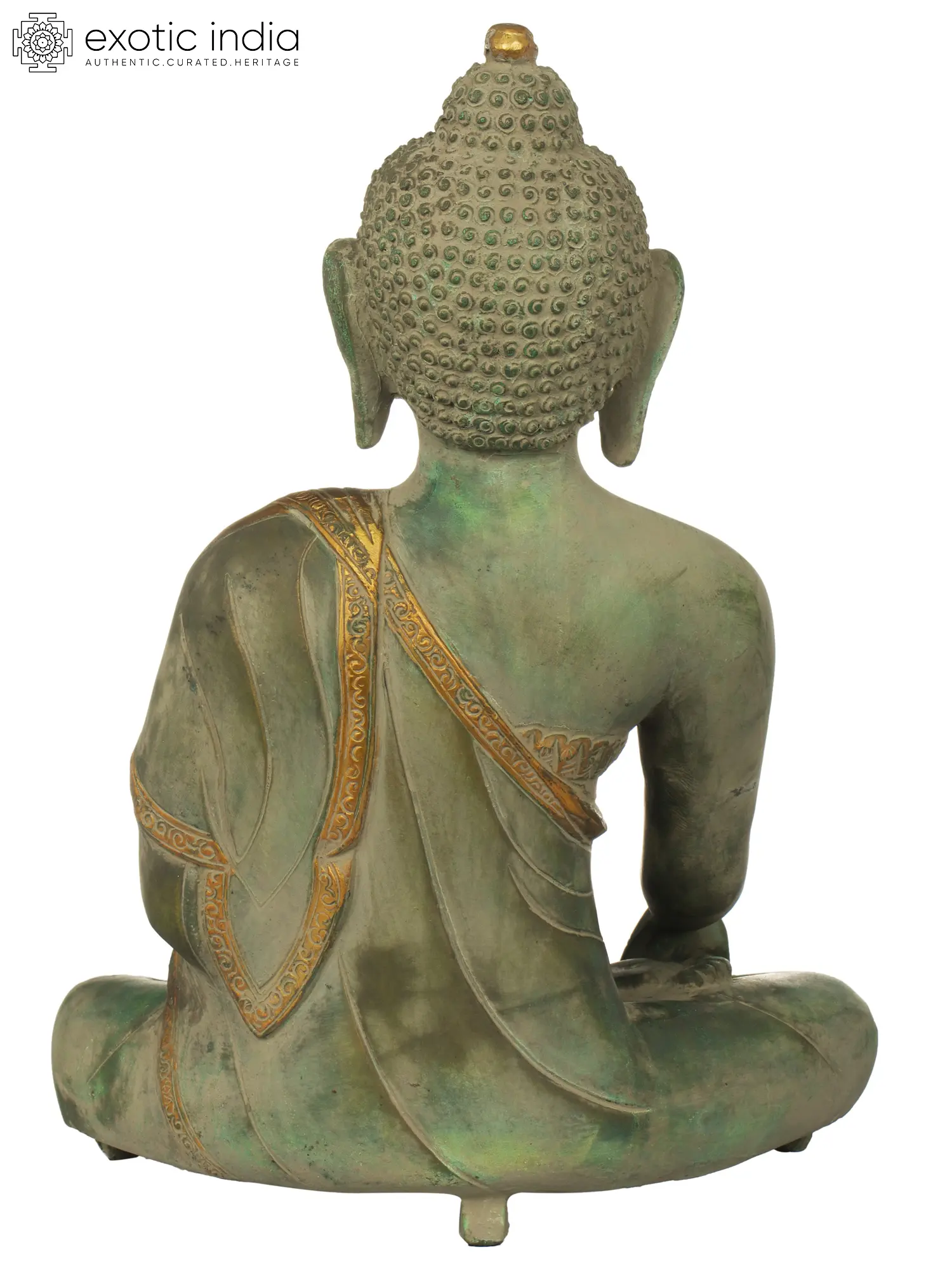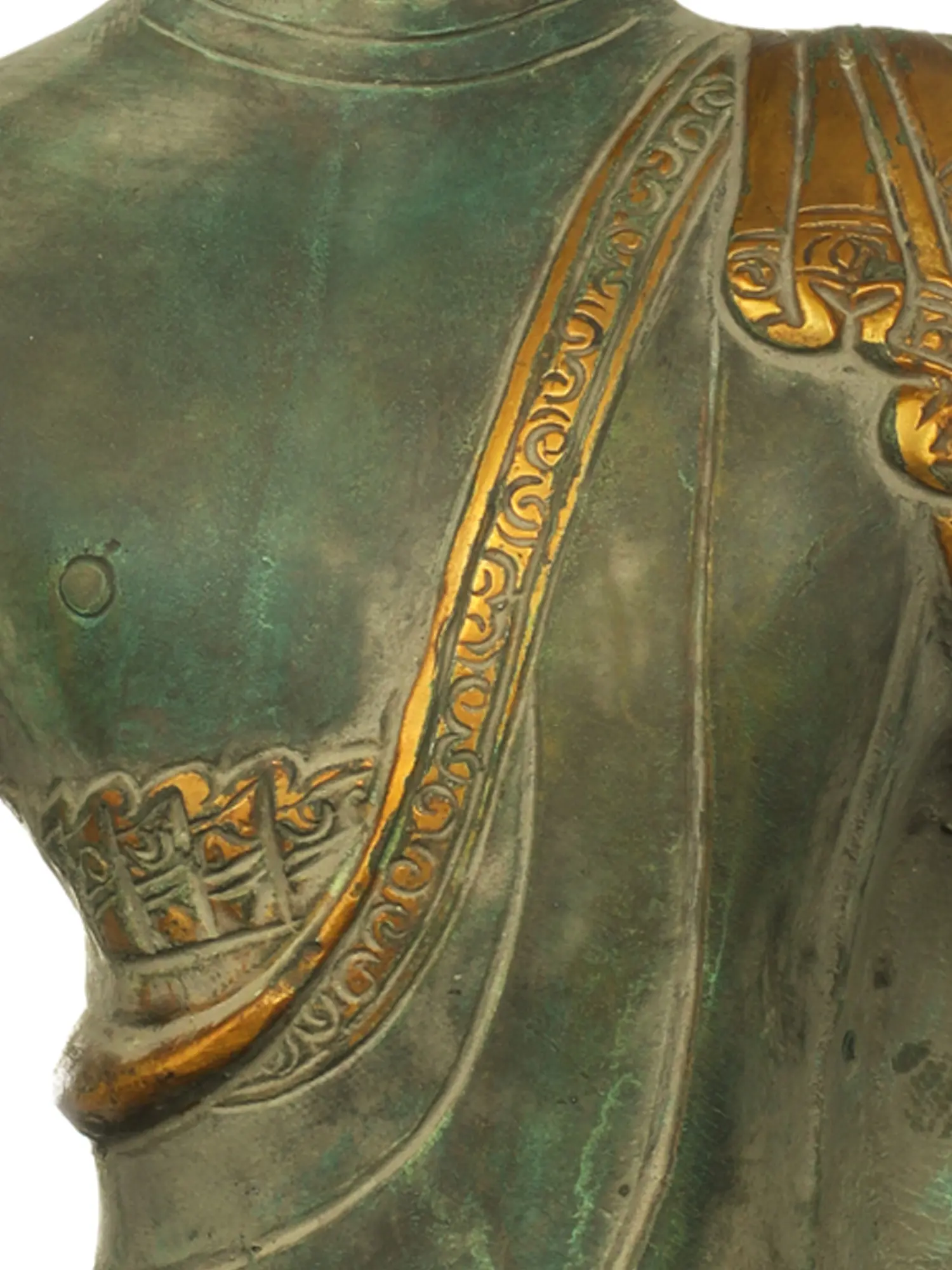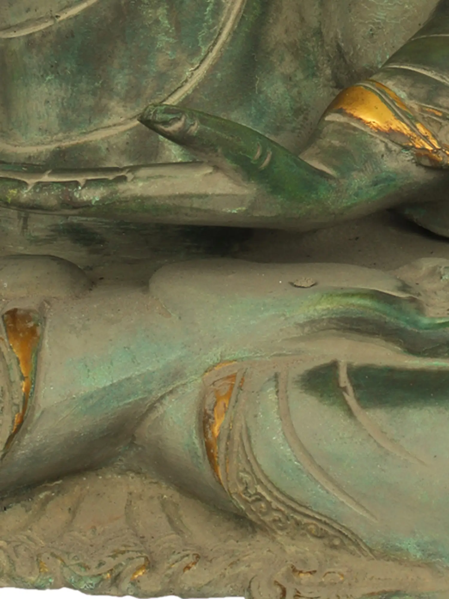 Handcrafted in India, a land steeped in spiritual heritage, this brass statue embodies centuries of artistic tradition and devotion. The use of brass, a metal known for its durability and ability to capture fine details, ensures that this representation of the Buddha will endure for generations. The subtle green patina, reminiscent of aged bronze, evokes a sense of timelessness and spiritual depth, inviting contemplation and reflection. This sculpture serves as a powerful reminder of the Buddha's teachings and the potential for inner peace and liberation that resides within each of us. It is a piece that will enrich any space with its spiritual presence and artistic merit.