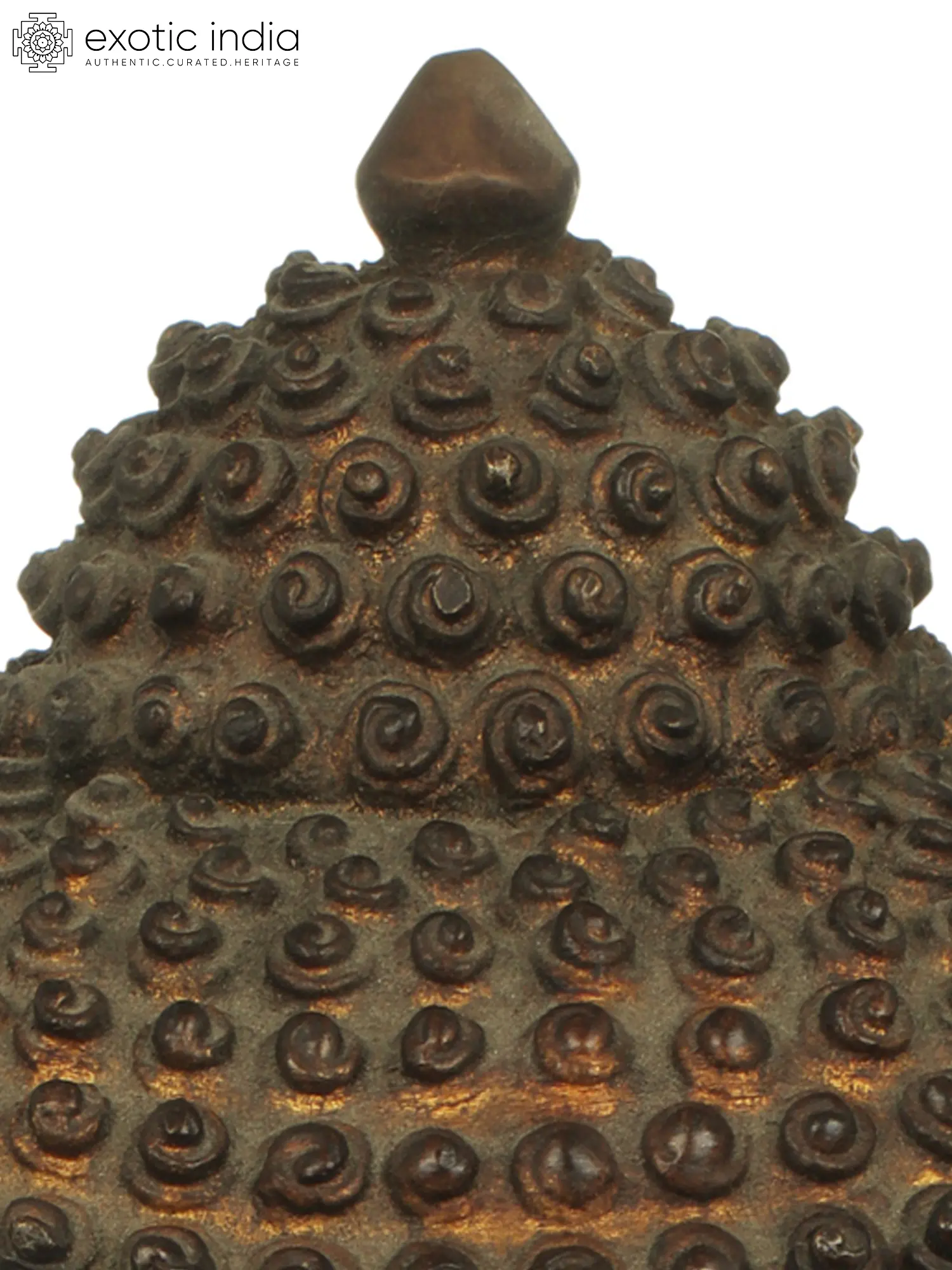 The intricate details of this mask are a testament to the artisan's dedication. The cranial protuberance, known as the *ushnisha*, signifies Buddha's heightened spiritual awareness and wisdom. Each coil of hair is meticulously rendered, with a vibrant lime green patina adding a unique visual appeal and highlighting the form. The urna, the spiral mark between Buddha's eyebrows, is said to represent his third eye, symbolizing his omniscience. The elongated earlobes are a reminder of his princely past, adorned with ornate brass earrings that hint at his detachment from material possessions. The gentle curve of his lips suggests a state of inner bliss and contentment, a silent invitation to embrace serenity. The contrasting dark patina of the neck and base provides a striking visual anchor, drawing the viewer's attention to the luminous face of the Buddha.