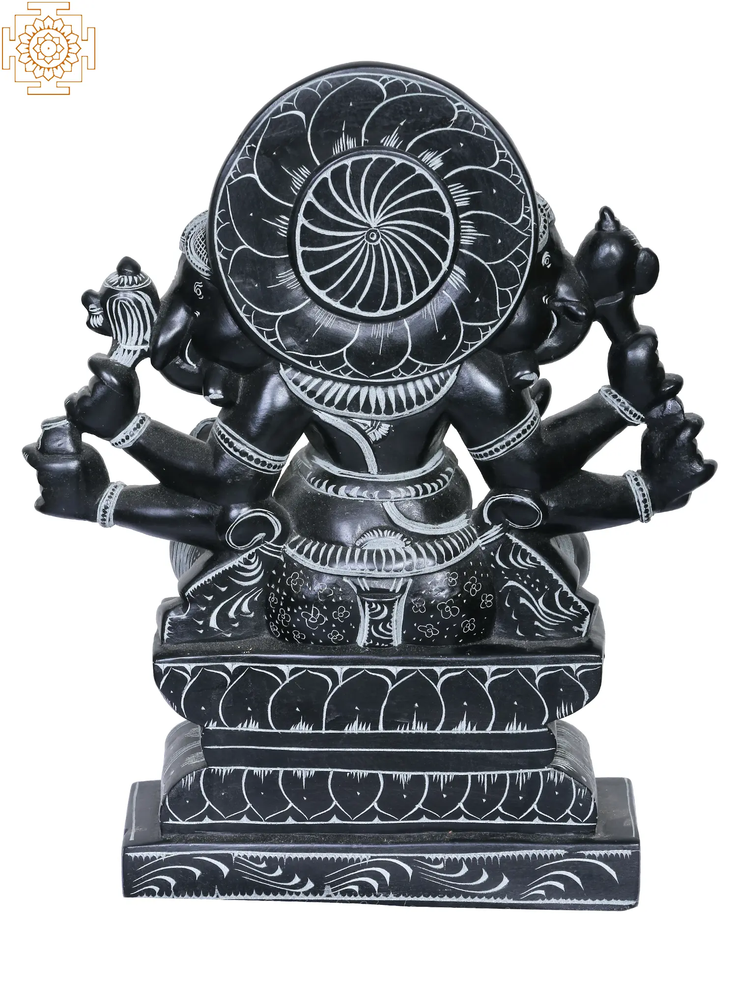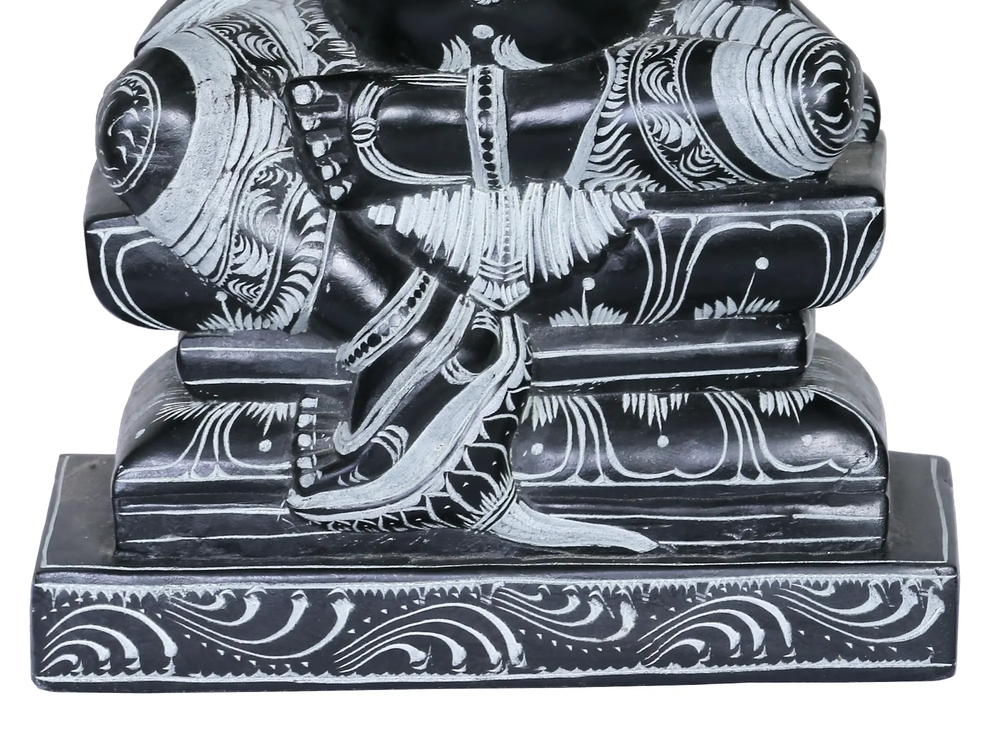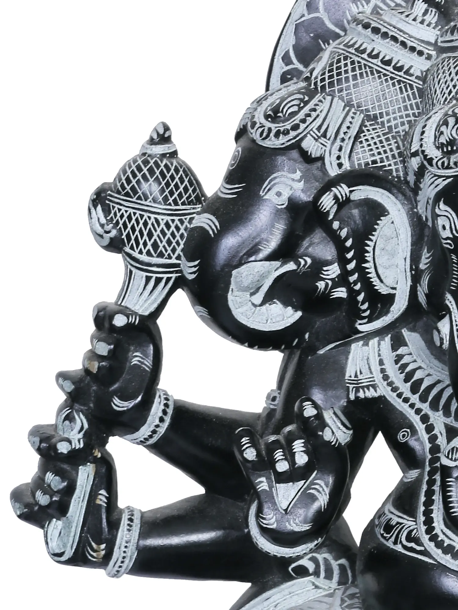 This magnificent stone carving is a testament to the enduring spirit and divine presence of Lord Ganesha, the beloved elephant-headed deity of Hinduism. Crafted from dark, lustrous stone, this piece captures the essence of Ganesha's benevolent power and his role as the remover of obstacles, the patron of arts and sciences, and the intellect personified. The intricate detailing, rendered in stark contrast with the dark stone, speaks to the skill of the artisans who brought this divine form to life. Each curve, each hand gesture, and each element held within his multiple arms tells a story, inviting contemplation and devotion.