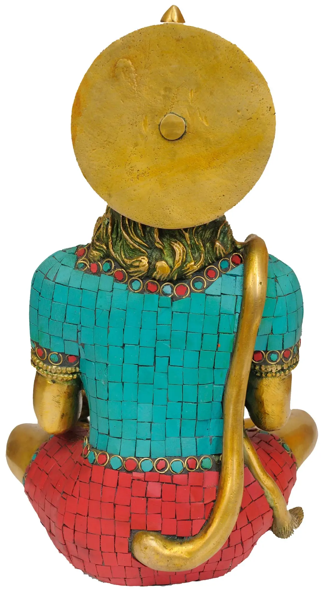 This brass statue of Lord Hanuman, with Lord Rama depicted in His heart, brings forth the endless devotion of Lord Hanuman towards Lord Rama and his total surrender to Raghunandan. Sitting in the Dhyani (meditating) mudra tall, adorned with intricately inlaid stones on His attire and crown, the statue emanates a mesmerizing aura.
