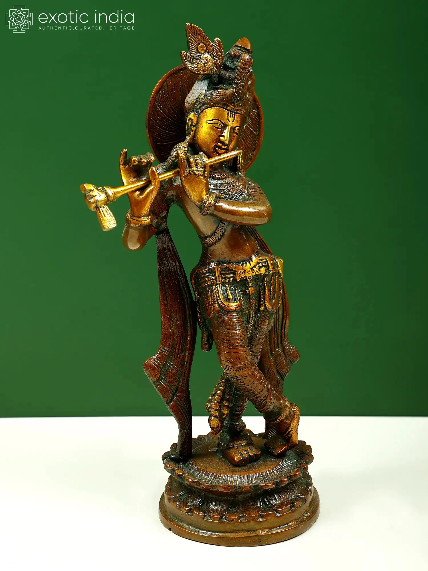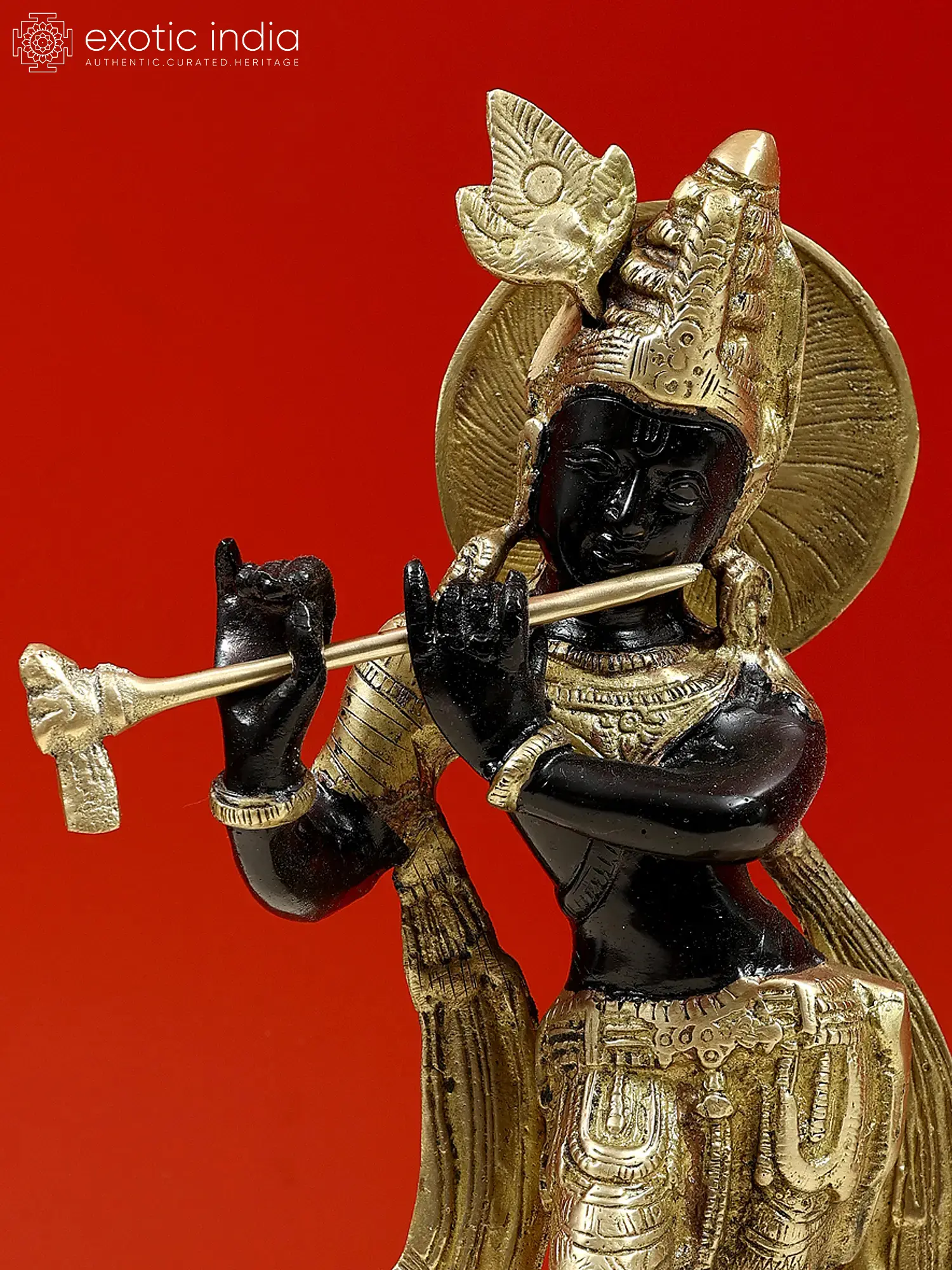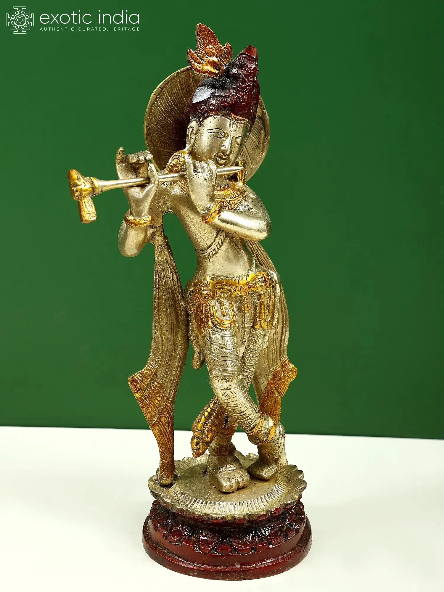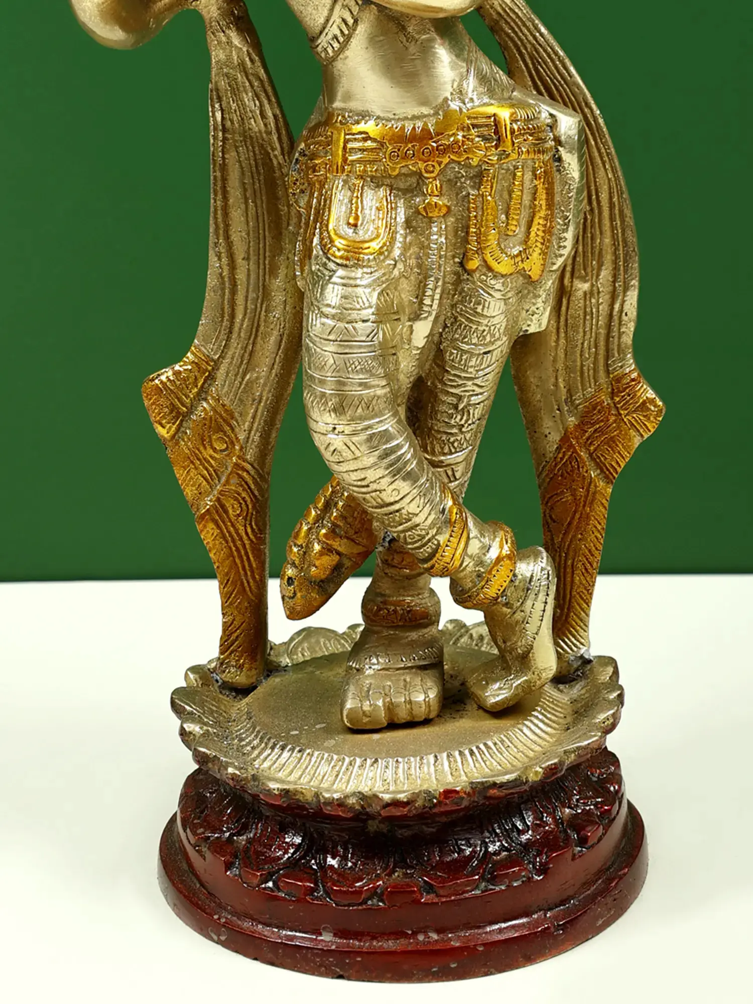 This exquisite brass sculpture captures the divine charm and eternal grace of Lord Krishna, the beloved deity of Hindu tradition. Standing at eleven inches tall, the figure is rendered with meticulous detail, showcasing the artistry and devotion embedded in its creation. The lustrous brass medium lends a timeless quality to the depiction, exuding warmth and spiritual depth. Krishna, often portrayed as the divine flutist, is shown here in his iconic Tribhanga pose, a graceful triple bend of the body that signifies joy and playful abandon. His eyes are softly closed, lost in the enchanting melody emanating from his flute, a sound said to captivate all of creation.
