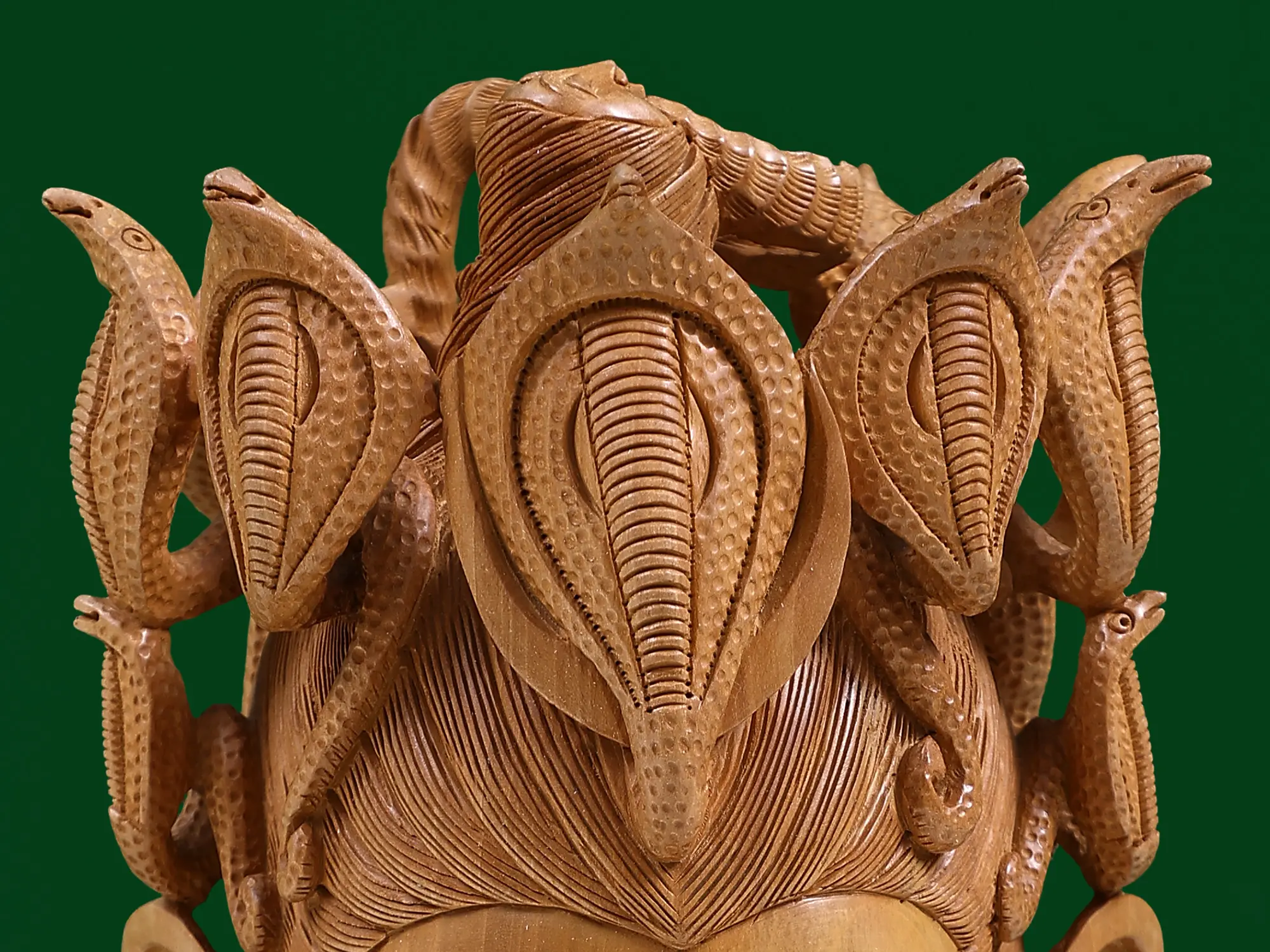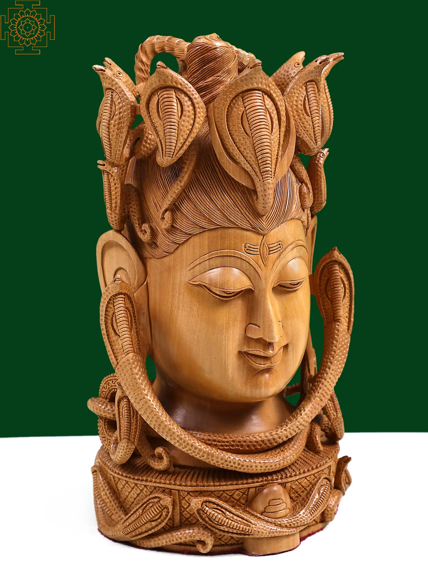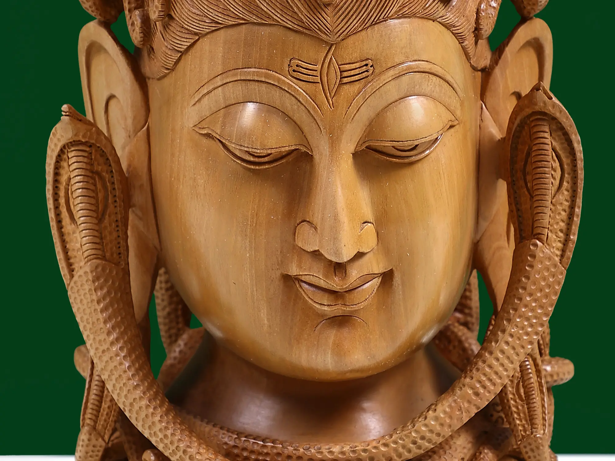 Bring the serene yet potent presence of Lord Shiva into your home with this exquisite wooden sculpture. Carved with meticulous detail, this piece captures the essence of Mahadeva, the destroyer and transformer, in a moment of profound contemplation. The natural grains of the wood lend a warm, earthy texture, inviting a sense of peace and grounding. This magnificent head is adorned with the iconic serpent, Vasuki, coiled around Shiva's neck and crown. In Hindu mythology, Vasuki is the king of all nagas and is intrinsically linked with Shiva. It is believed that when the gods and demons churned the cosmic ocean (Samudra Manthan), Vasuki was used as the rope. The venom that emerged was consumed by Shiva, saving the universe and earning him the epithet "Neelkantha" (the one with a blue throat). The serpents surrounding Shiva's head represent his control over primal forces and his transcendence over fear and death. They are a symbol of cosmic energy, protection, and the cycle of creation and destruction.
