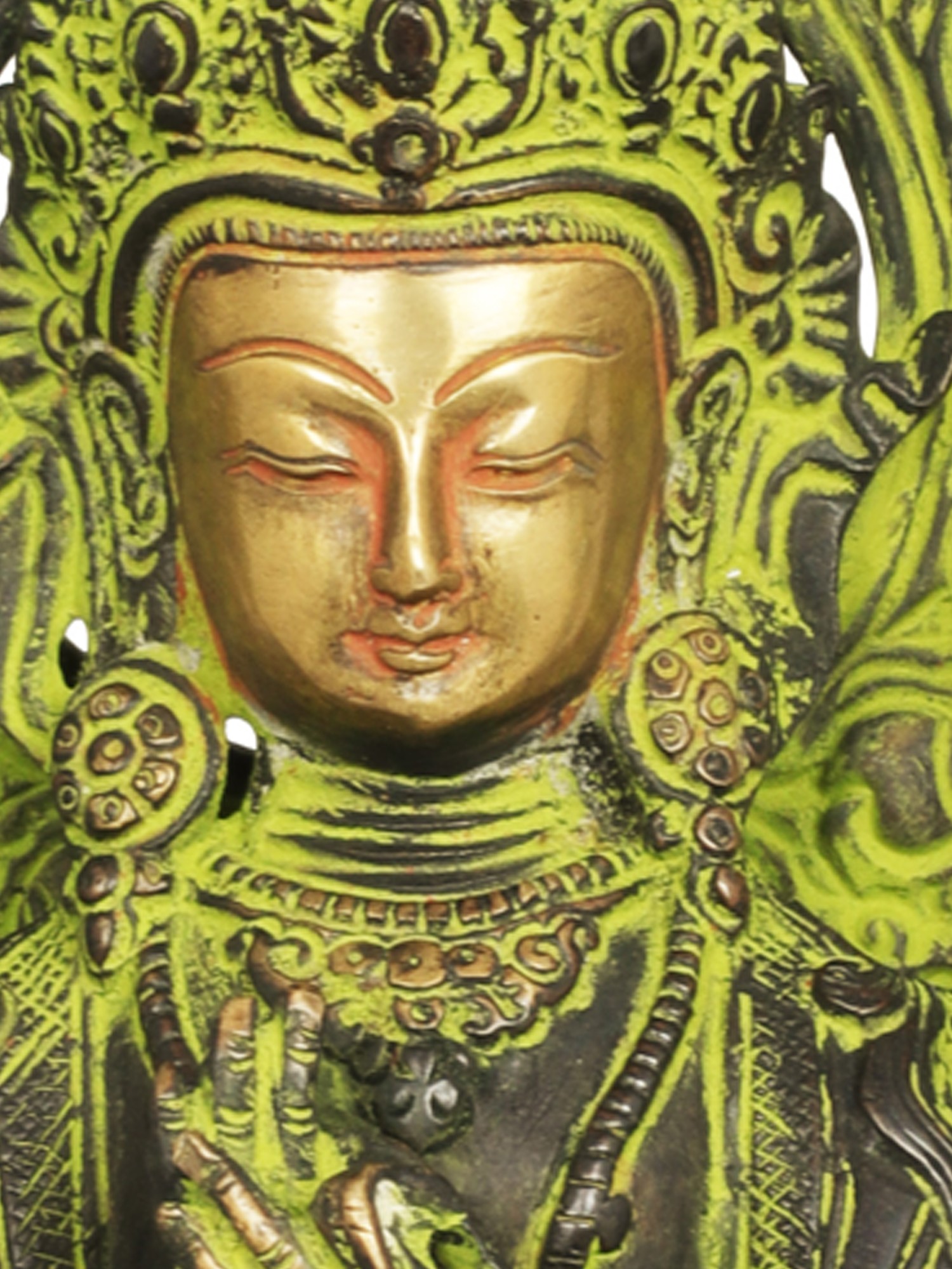 Shown with an extremely sweet and gentle countenance, Maiterya here holds in his right hand the stem of a lotus flower. The bloom of this blossom supports the Buddhist wheel of spiritual instruction. His left hand similarly bears a vase at the shoulder level, signifying immortality. Maitreya’s throne is tapering and edged; his feet resting on a lotus base. The folds of the dhoti clinging to his legs are rendered realistically.