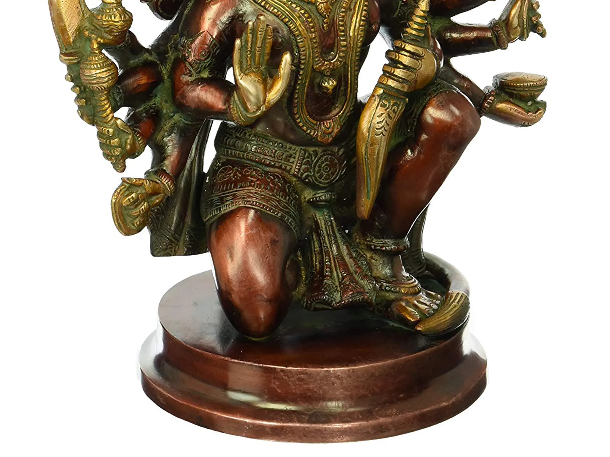 This striking sculpture is cast in solid brass, a metal revered in Indian culture for its purity and auspiciousness. The artist's hand has painstakingly shaped the metal to bring forth the divine aura of Lord Hanuman. The multi-faceted heads, each with distinct features and expressions, are masterfully rendered, creating a sense of awe and power. The numerous arms, adorned with various divine attributes such as a sword, mace, discus, and a pot, further emphasize his prowess and readiness to protect. The intricate detailing on his attire, the musculature of his form, and the serene yet powerful expression on his primary face all speak to the exceptional skill of the Indian craftsman. The subtle patination adds depth and character, highlighting the contours and making this piece a timeless work of art. ––––––––––––––––––––