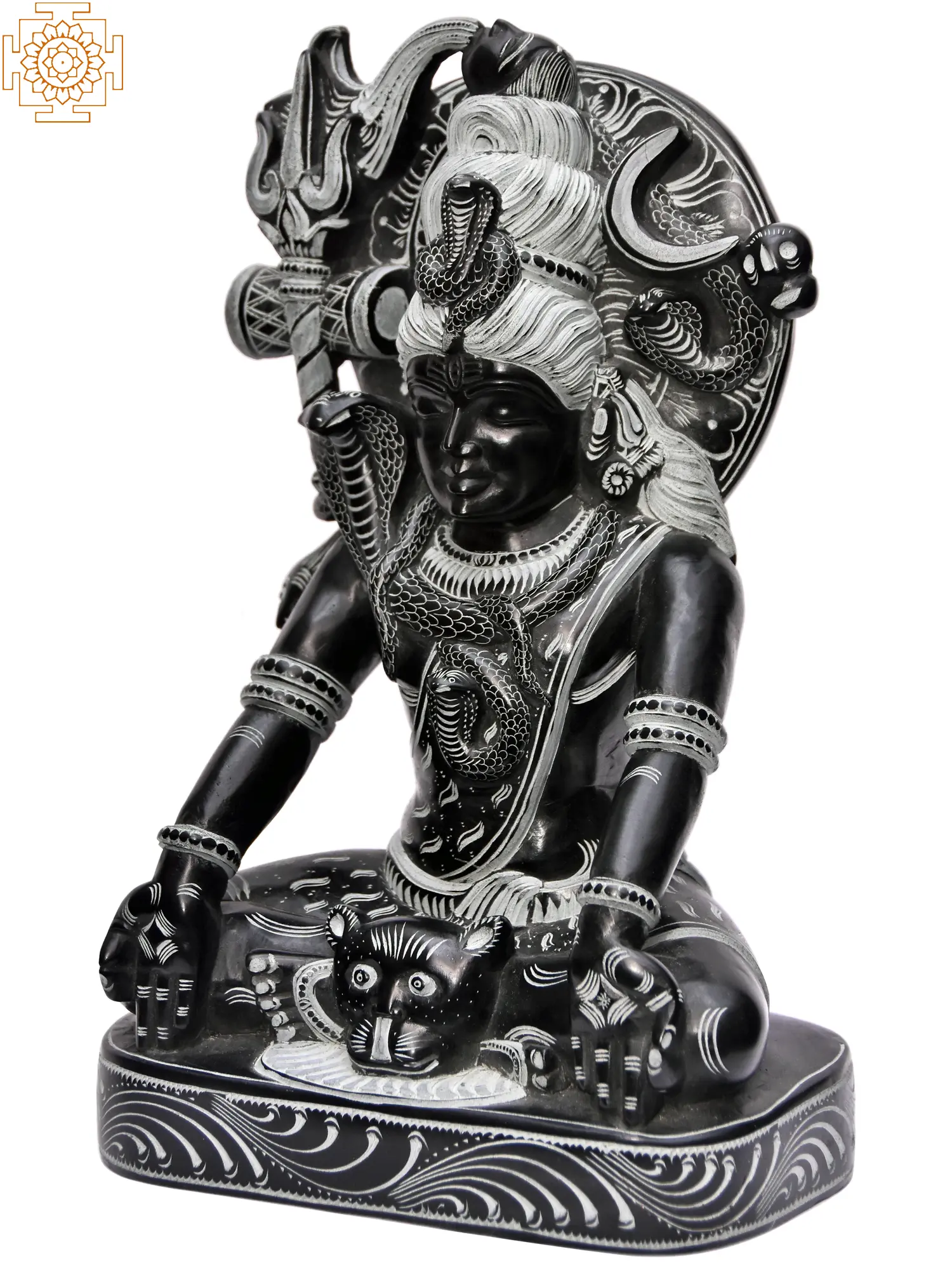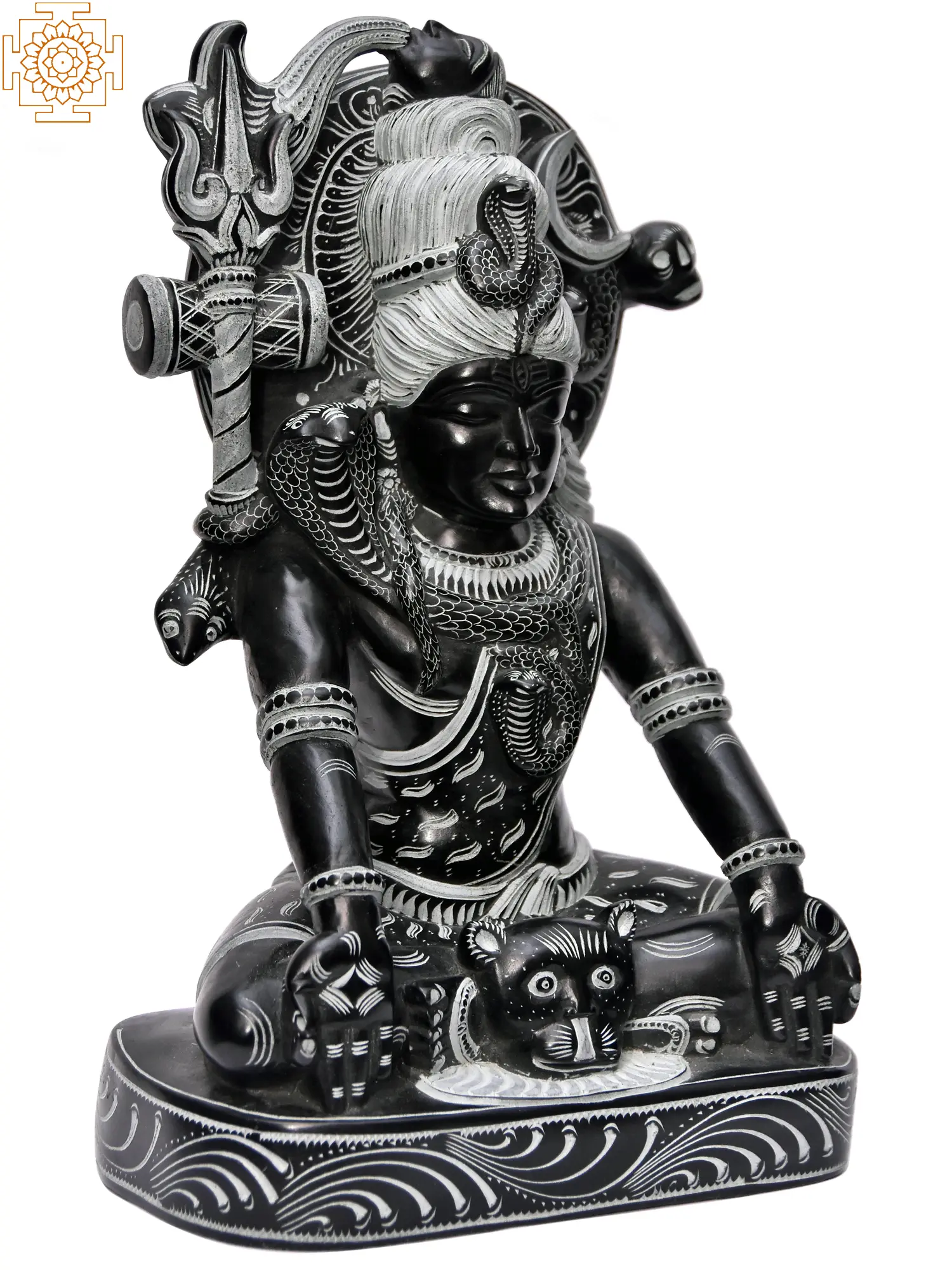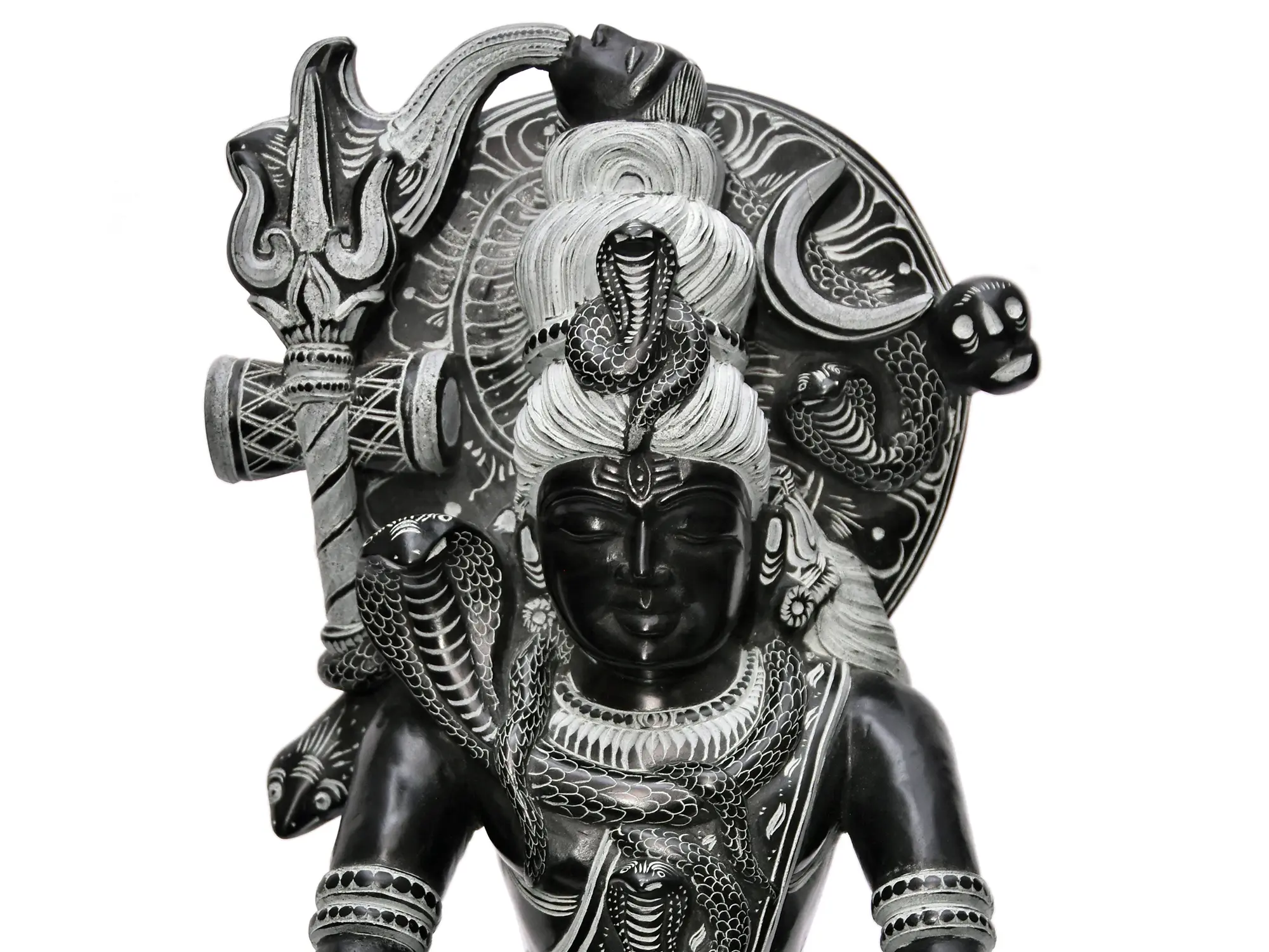 Lord Shiva, one of the principal deities of Hinduism, is revered as the Supreme Being. His meditative posture signifies his power to withdraw from the external world and delve into introspection, a state of profound consciousness that brings about cosmic balance. The cobras coiled around his neck, most notably Vasuki, represent the cyclical nature of time and the mastery over primal energies. In Hindu mythology, Vasuki played a crucial role in the churning of the cosmic ocean (Samudra Manthan), symbolizing the transformation that arises from intense effort and potent forces. The trishul, Shiva's iconic trident, represents the three gunas (Sattva, Rajas, Tamas) and also the power of creation, preservation, and destruction, essential for the cosmic dance of existence. ––––––––––––––––––––
