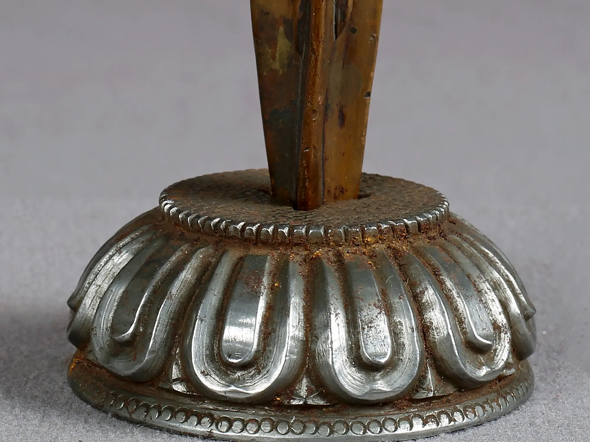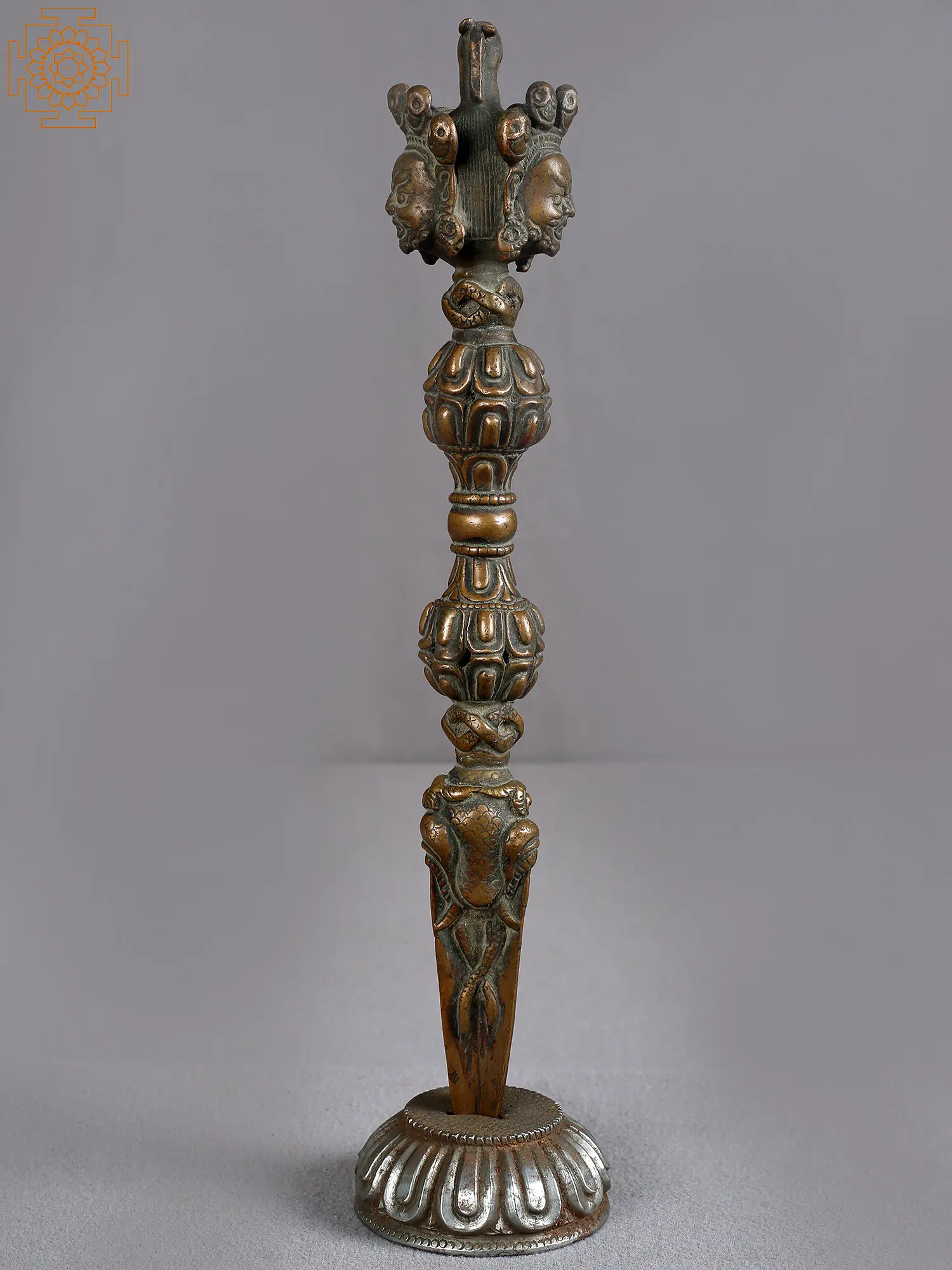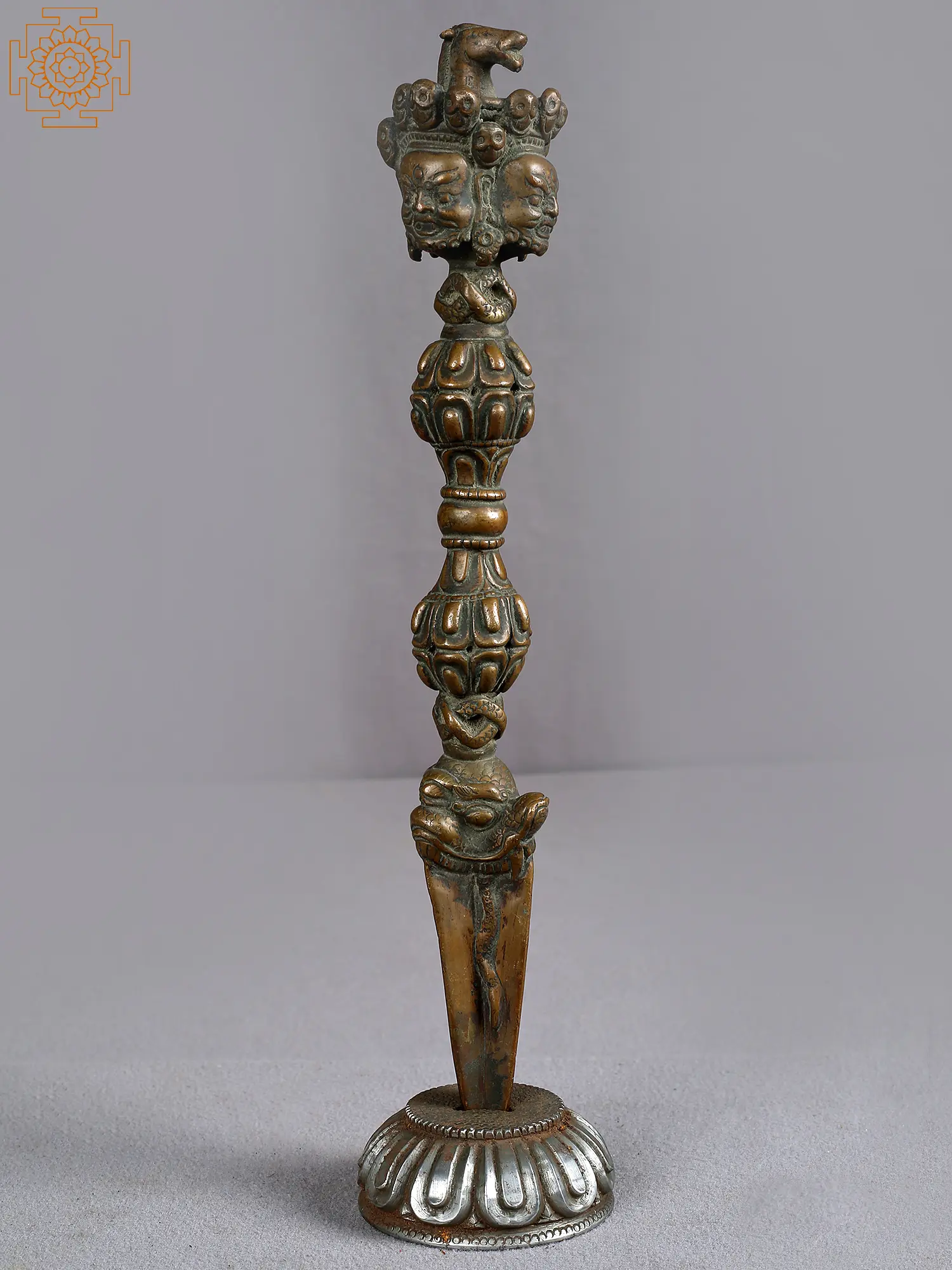 "Cut through the illusions." The Phurpa, a ritual dagger, is a potent symbol of Vajrakilaya, a fierce deity in Tibetan Buddhism. Crafted in Nepal, this Phurpa embodies the spirit of transformation. Its three-sided blade represents the three poisons of ignorance, attachment, and aversion, which we must conquer to attain enlightenment. The demon-headed hilt signifies the destruction of negative forces. Intricately detailed and handcrafted, this Phurpa carries the power to dispel negativity and protect your spiritual journey. Embrace its energy and let it guide you towards clarity and wisdom.