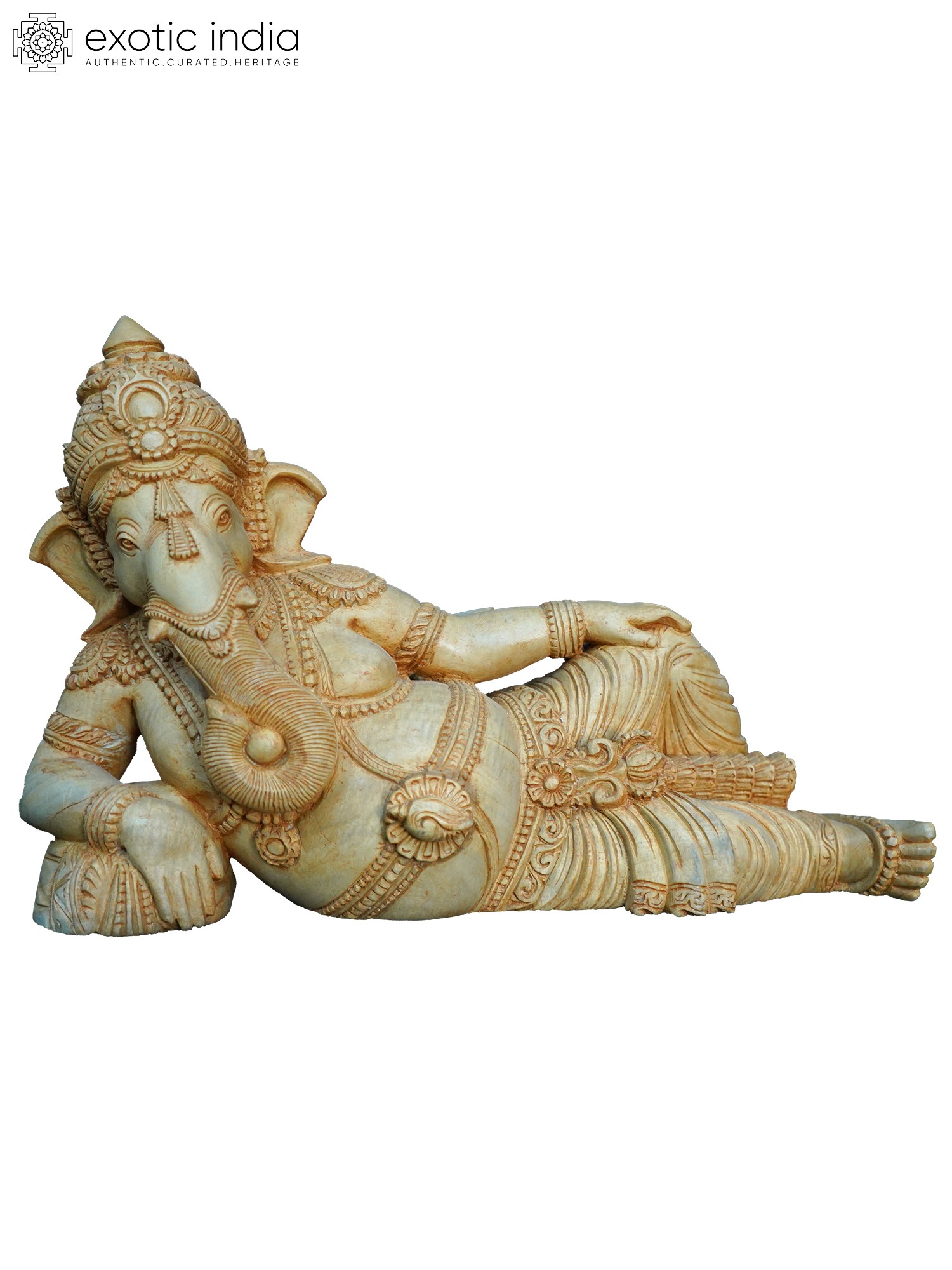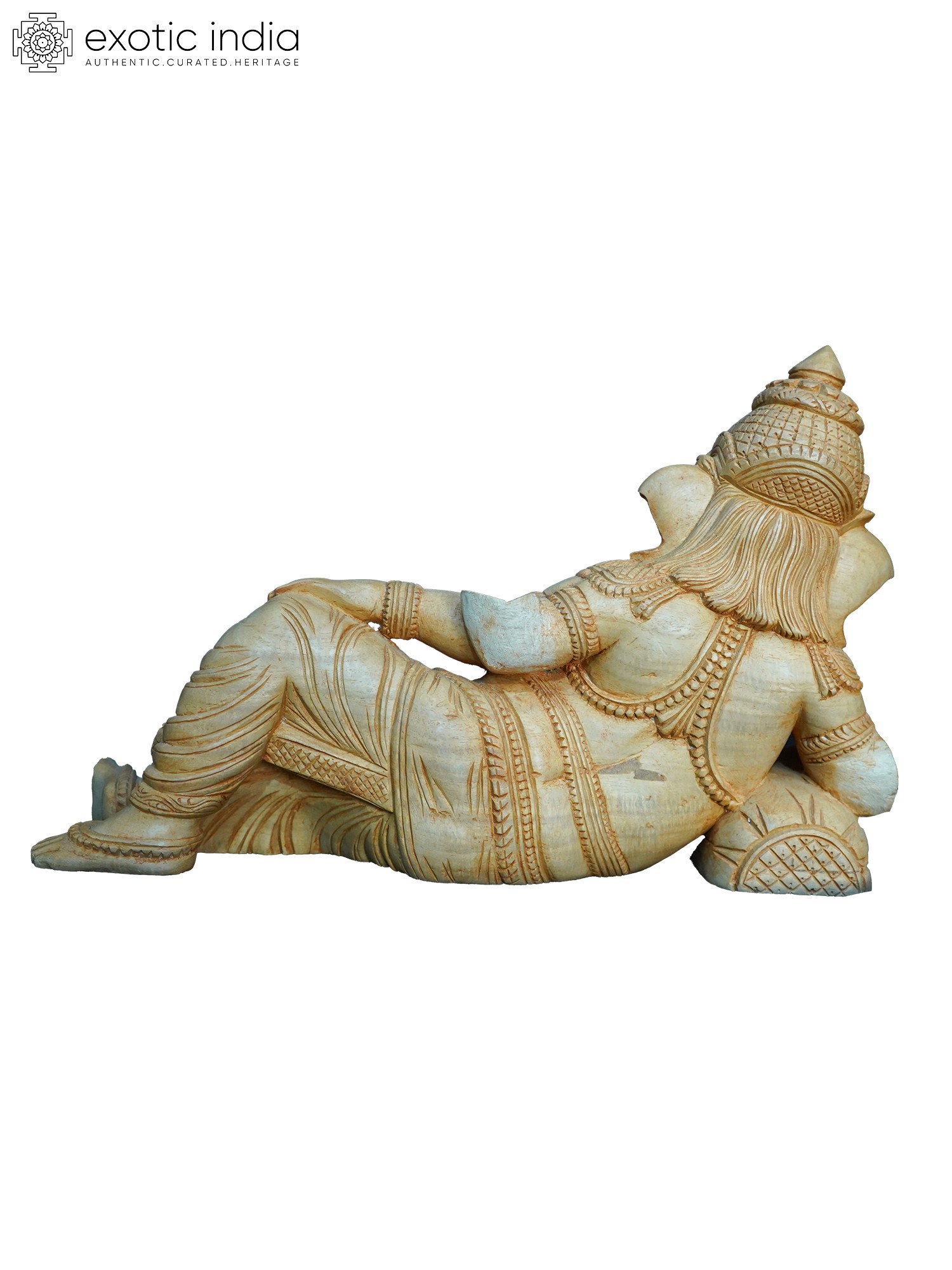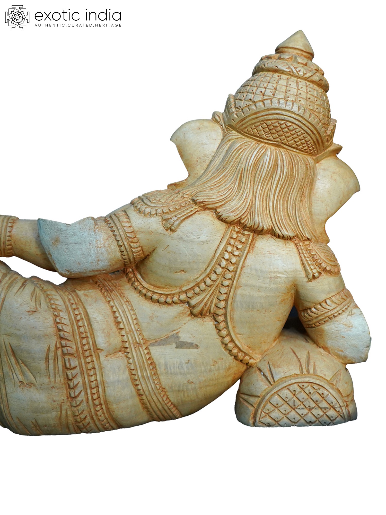 This divine representation is sculpted from white wood, chosen for its smooth texture and subtle grain, which lends itself beautifully to detailed carving. The skilled artisans have meticulously rendered Ganesha's form, capturing the relaxed posture and the intricate details of his adornments. Note the gentle curve of his reclining body, the folds of his dhoti, and the elaborate headdress, each element carefully shaped and refined. The light color of the wood enhances the overall aesthetic, creating a sense of purity and calm. The handcrafted nature of this statue ensures that each piece is unique, bearing the subtle marks of the artisan's hand, making it a truly special addition to your home or sacred space.