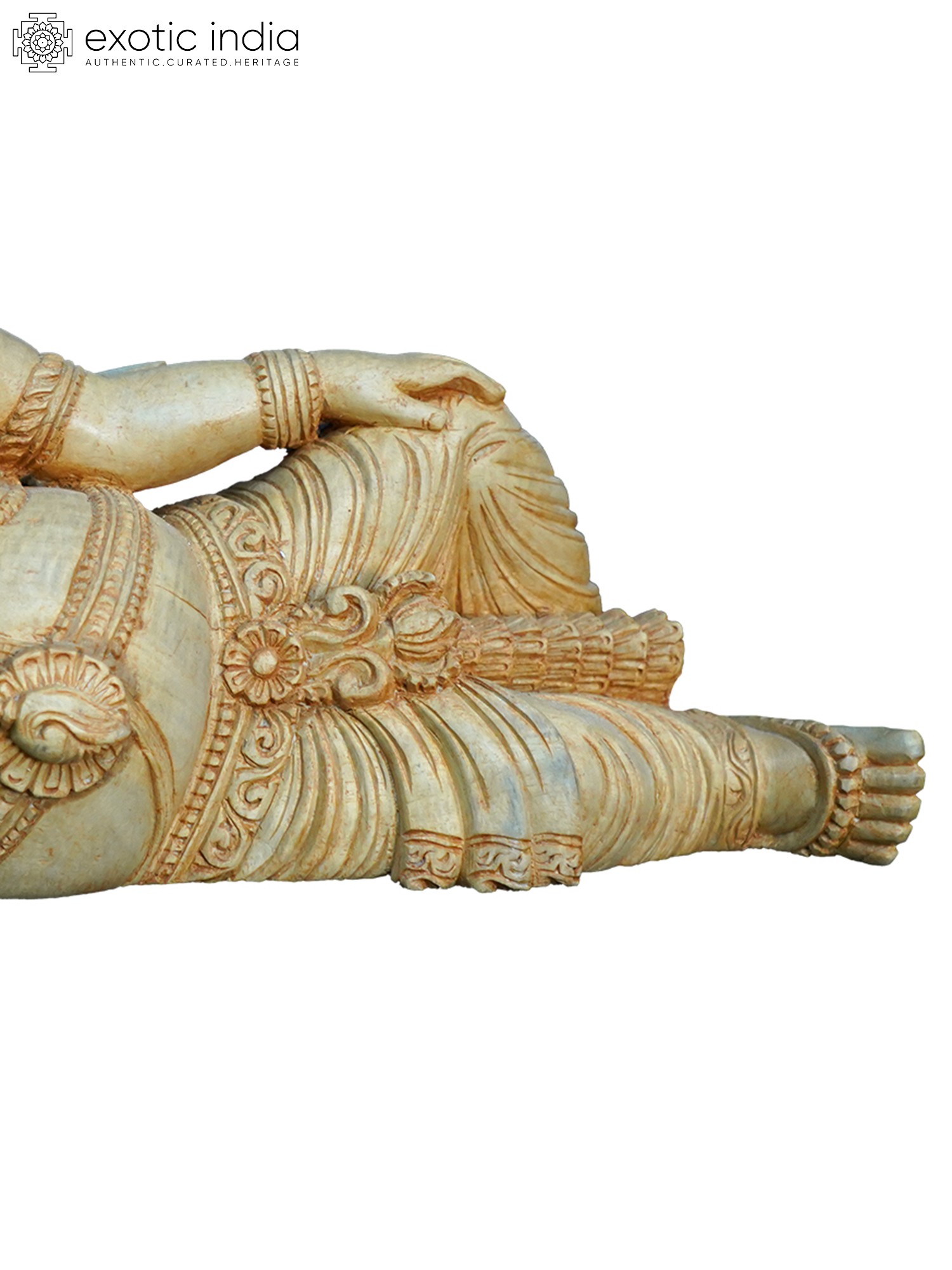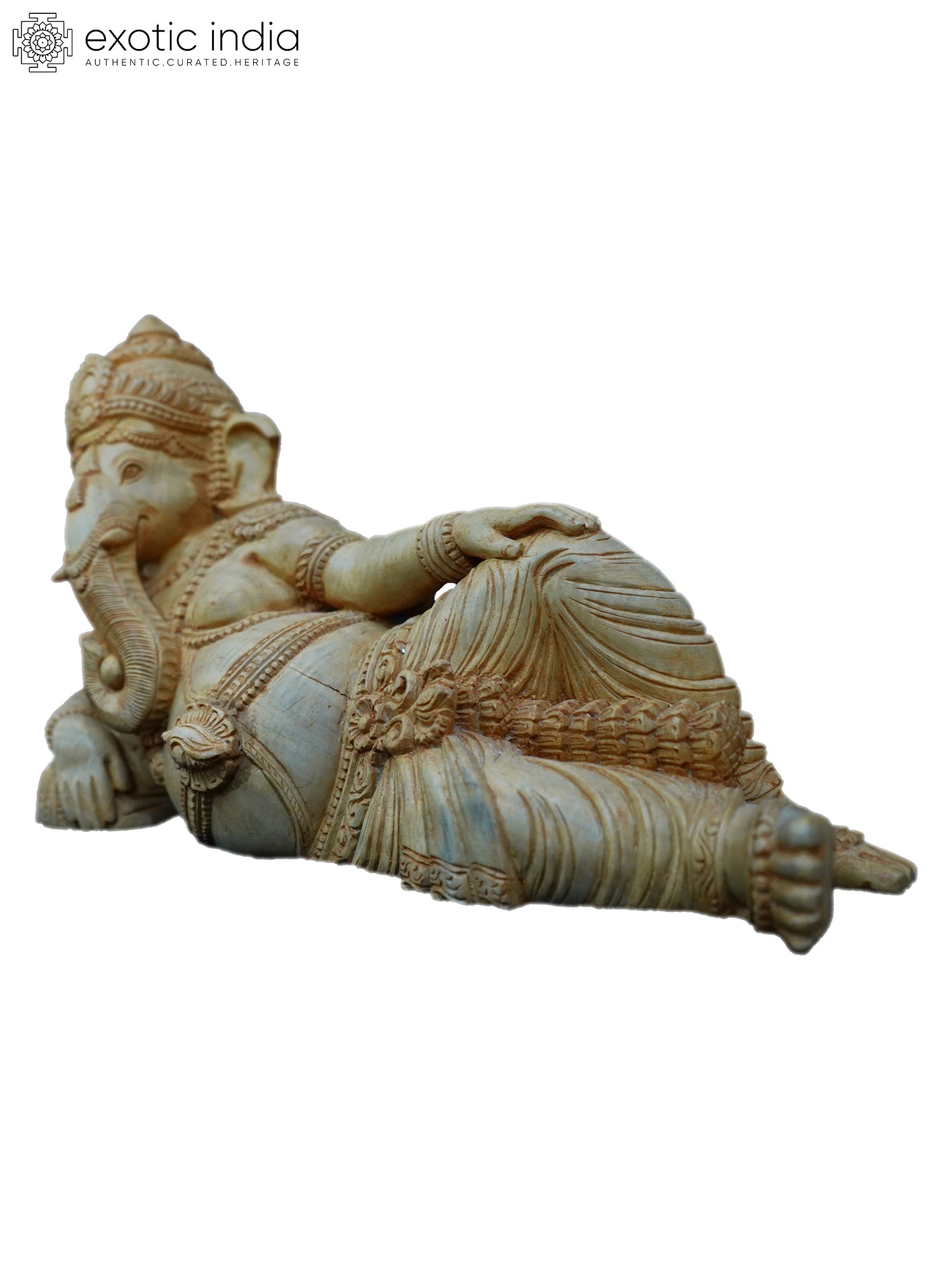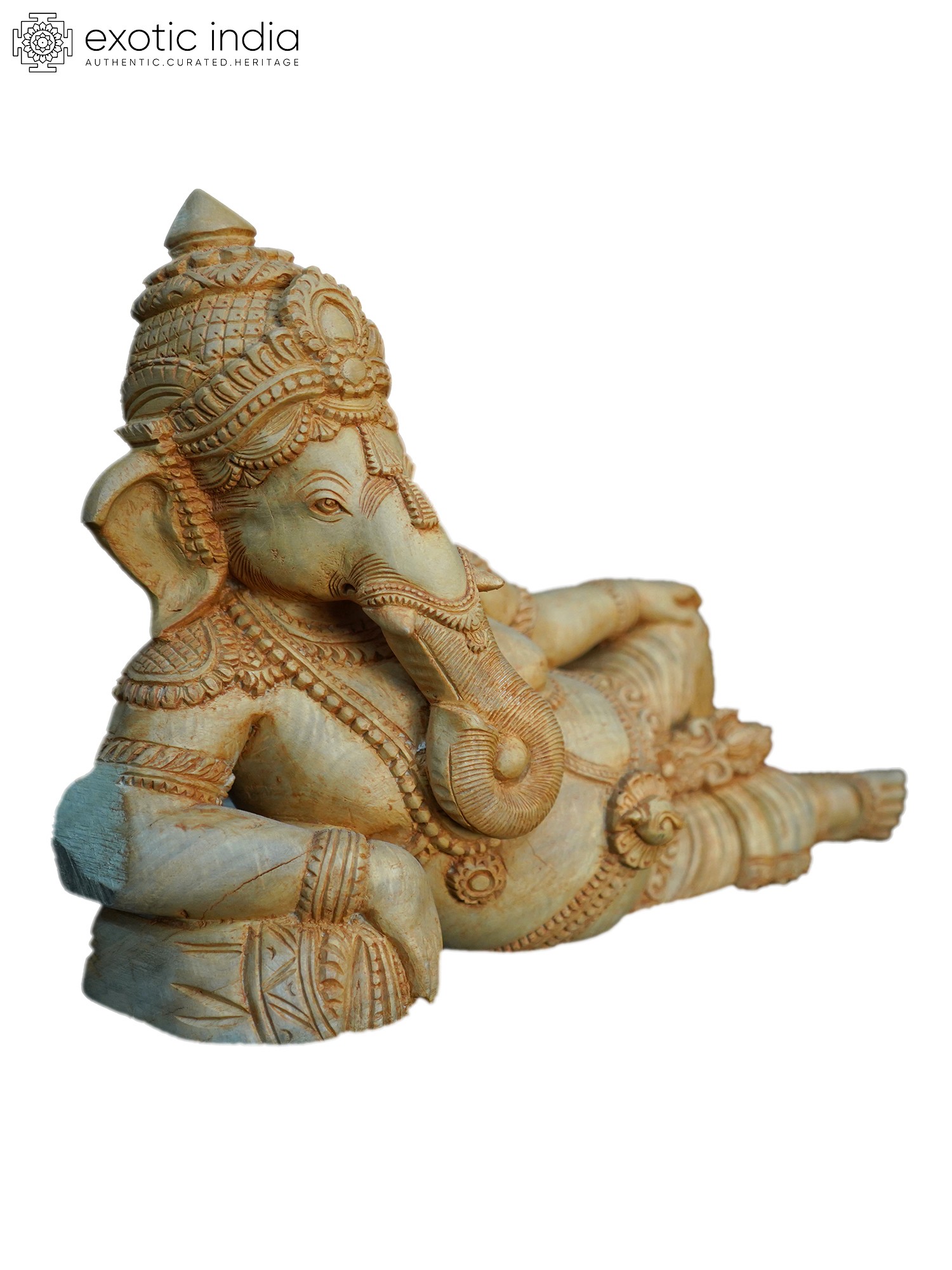 This divine representation is sculpted from white wood, chosen for its smooth texture and subtle grain, which lends itself beautifully to detailed carving. The skilled artisans have meticulously rendered Ganesha's form, capturing the relaxed posture and the intricate details of his adornments. Note the gentle curve of his reclining body, the folds of his dhoti, and the elaborate headdress, each element carefully shaped and refined. The light color of the wood enhances the overall aesthetic, creating a sense of purity and calm. The handcrafted nature of this statue ensures that each piece is unique, bearing the subtle marks of the artisan's hand, making it a truly special addition to your home or sacred space.