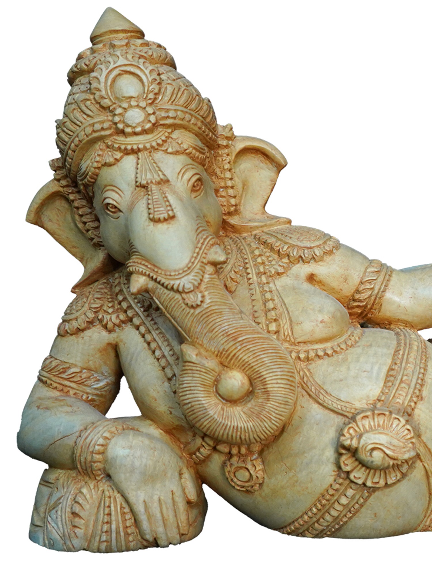 While Ganesha is typically depicted standing, seated, or dancing, the reclining form offers a unique perspective on the deity's character. The relaxed posture exudes a sense of tranquility, suggesting that Ganesha is at ease, having successfully navigated the challenges and obstacles that come his way. This pose serves as a reminder to find peace and contentment amidst the chaos of life, to trust in Ganesha's ability to clear the path, and to approach life with a calm and balanced mind. It is a visual representation of inner peace and the ability to find serenity amidst the challenges of the world. Place this statue in your home to invoke the blessings of Ganesha and to cultivate a sense of calm and auspiciousness in your life.