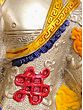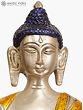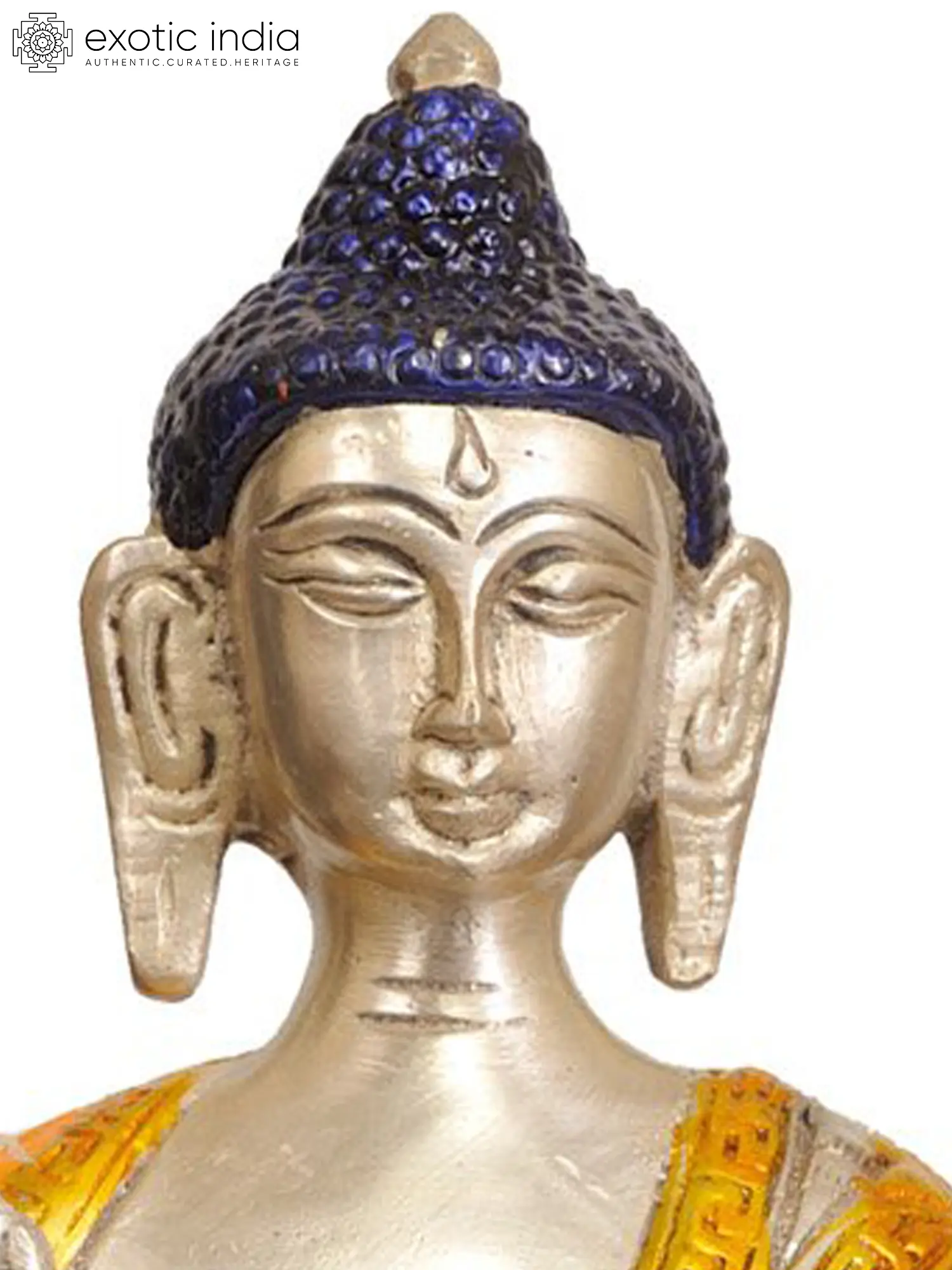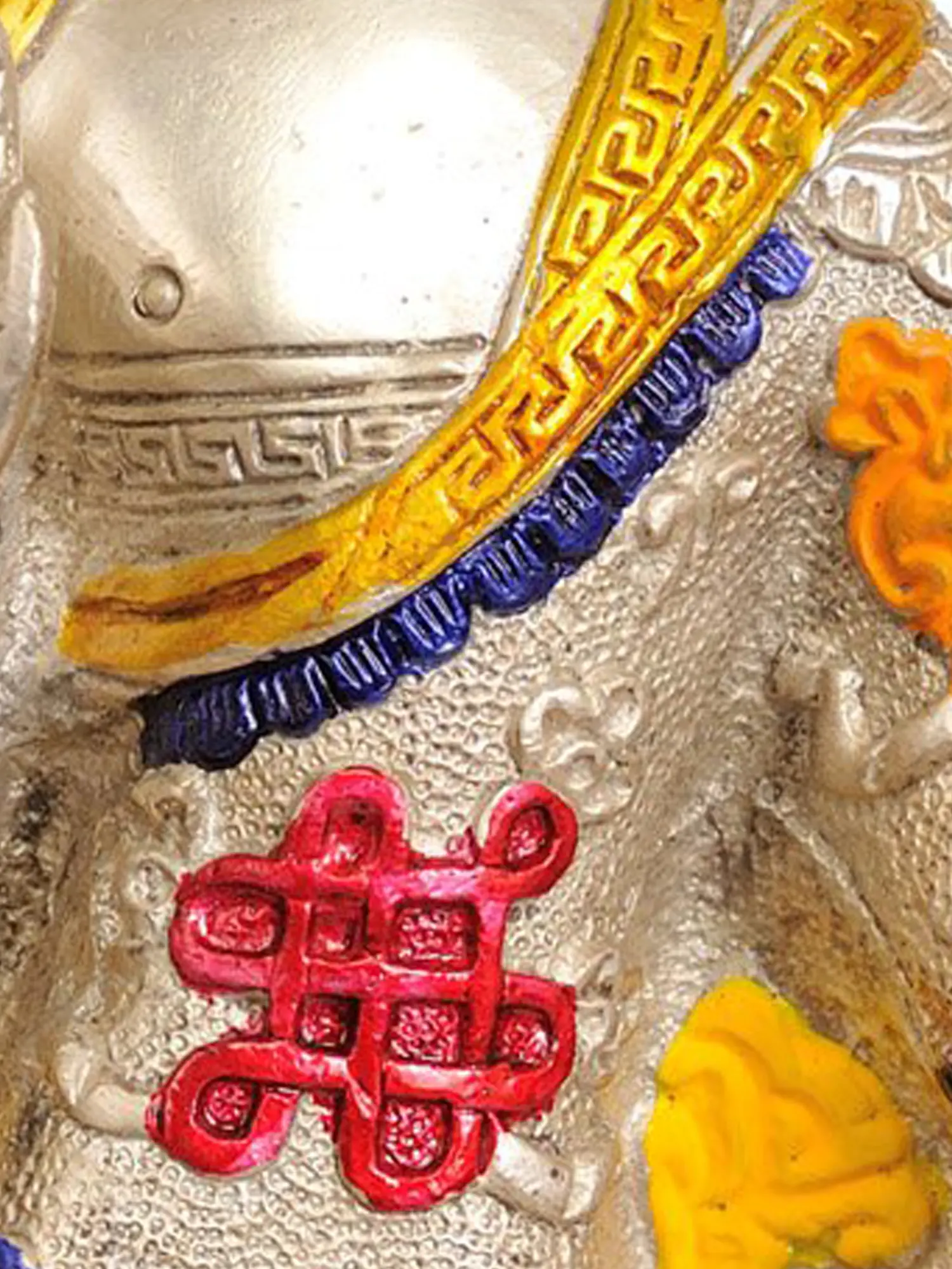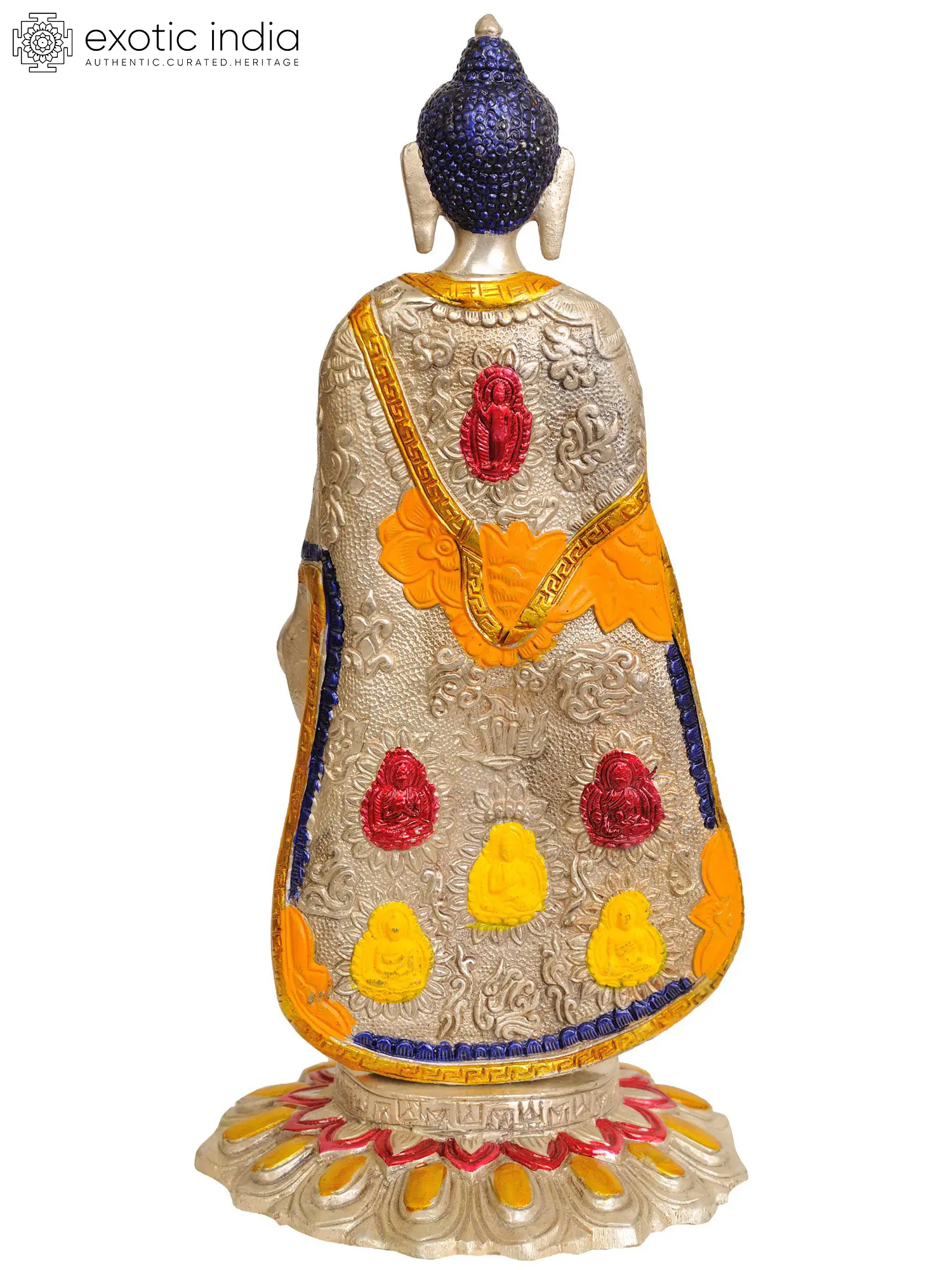 Crafted by skilled artisans in India, this statue is a testament to traditional craftsmanship and artistic excellence. The use of brass lends a timeless quality and a lustrous finish that will deepen with age. The robes of the Buddha are adorned with a tapestry of auspicious motifs, each carrying profound meaning within Buddhist traditions. The central knot, often referred to as the Endless Knot, is one of the eight auspicious symbols and represents the interconnectedness of all things, the unity of wisdom and compassion, and the eternal nature of the Buddha's teachings. The vibrant colors and intricate details of these symbols, such as the lotus flowers signifying purity and enlightenment, add a layer of visual richness and spiritual depth to the piece. The flowing mantle, rendered in a vibrant golden hue, further enhances the divine presence of the sculpted figure. ––––––––––