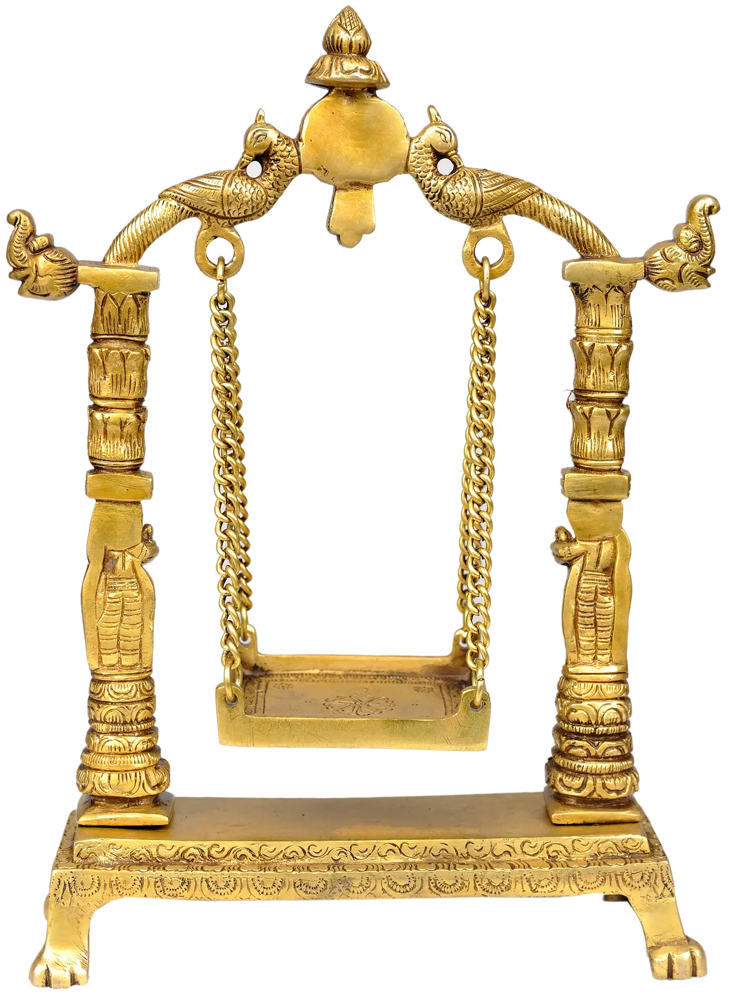 "Swing into the divine embrace." In the heart of India, swings are not just for children; they are a profound part of devotion. This Swing for Your Lord, handcrafted in brass, invites you to partake in a sacred tradition. Lord Krishna, the divine child, is often depicted on swings, symbolizing the playful aspect of divinity. Swinging Him gently, devotees experience a sense of closeness to the divine, as if cradling the universe in their arms. This swing, a beautiful blend of artistry and spirituality, invites you to sway with the rhythm of the cosmos and bask in the love of the divine.