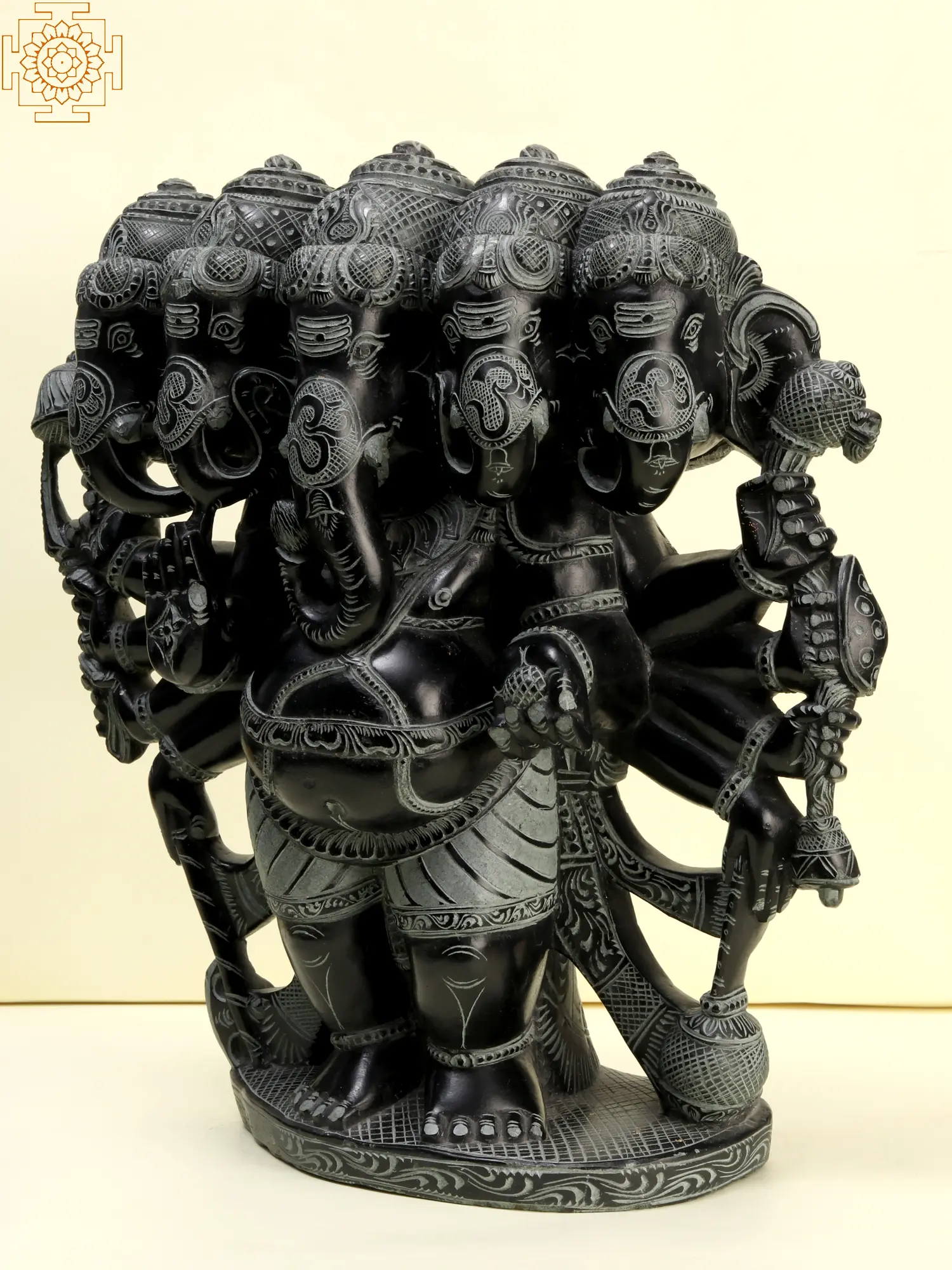 This magnificent statue captures the awe-inspiring form of Panchamukhi Ganesha, the five-faced manifestation of Lord Ganesha, the remover of obstacles and the patron of arts and sciences. Crafted from durable and resonant Katappa stone, this piece stands as a testament to the rich heritage of Indian craftsmanship. The deep, lustrous black of the stone provides a striking contrast to the intricate carvings that adorn every facet of this divine representation.