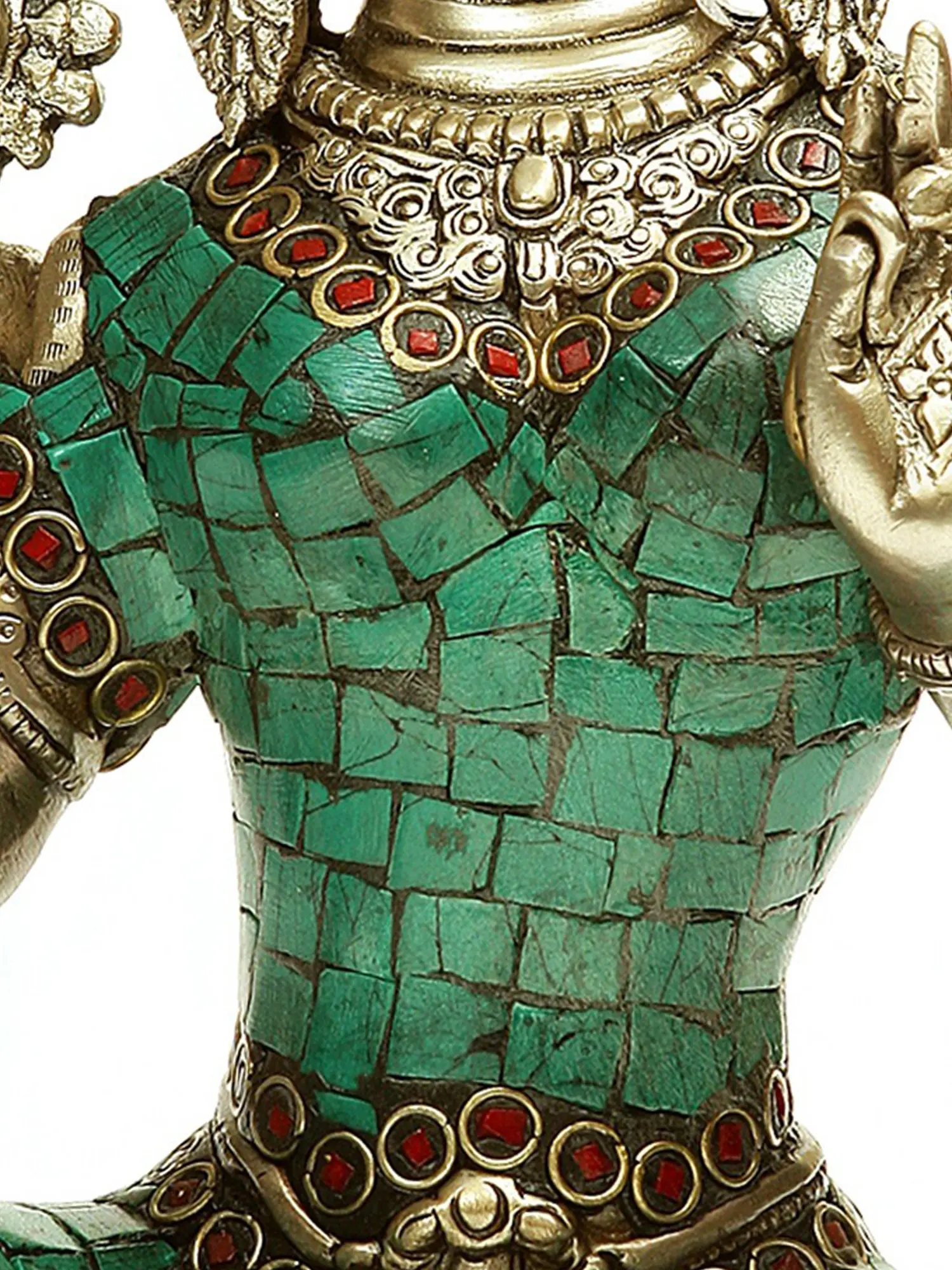 Every element of this sculpture is rich with meaning. Tara's serene facial expression conveys her boundless compassion and wisdom. The lotus blossoms that adorn her represent purity, spiritual awakening, and the potential for enlightenment that resides within each of us. The elaborate crown she wears symbolizes her divine status. Notice the intricate detailing, from the folds of her robes to the delicate ornamentation, reflecting the artistic skill involved in its creation. The piece features the vibrant mosaic of turquoise colored stone-work, complemented with red coral accents, covering the body, adding visual intrigue. The red coral accents draw attention to the borders of the stone-work and also to the necklace that she wears. This piece will be a beautiful addition to any sacred space, bringing with it the blessings of protection, compassion, and enlightened wisdom.