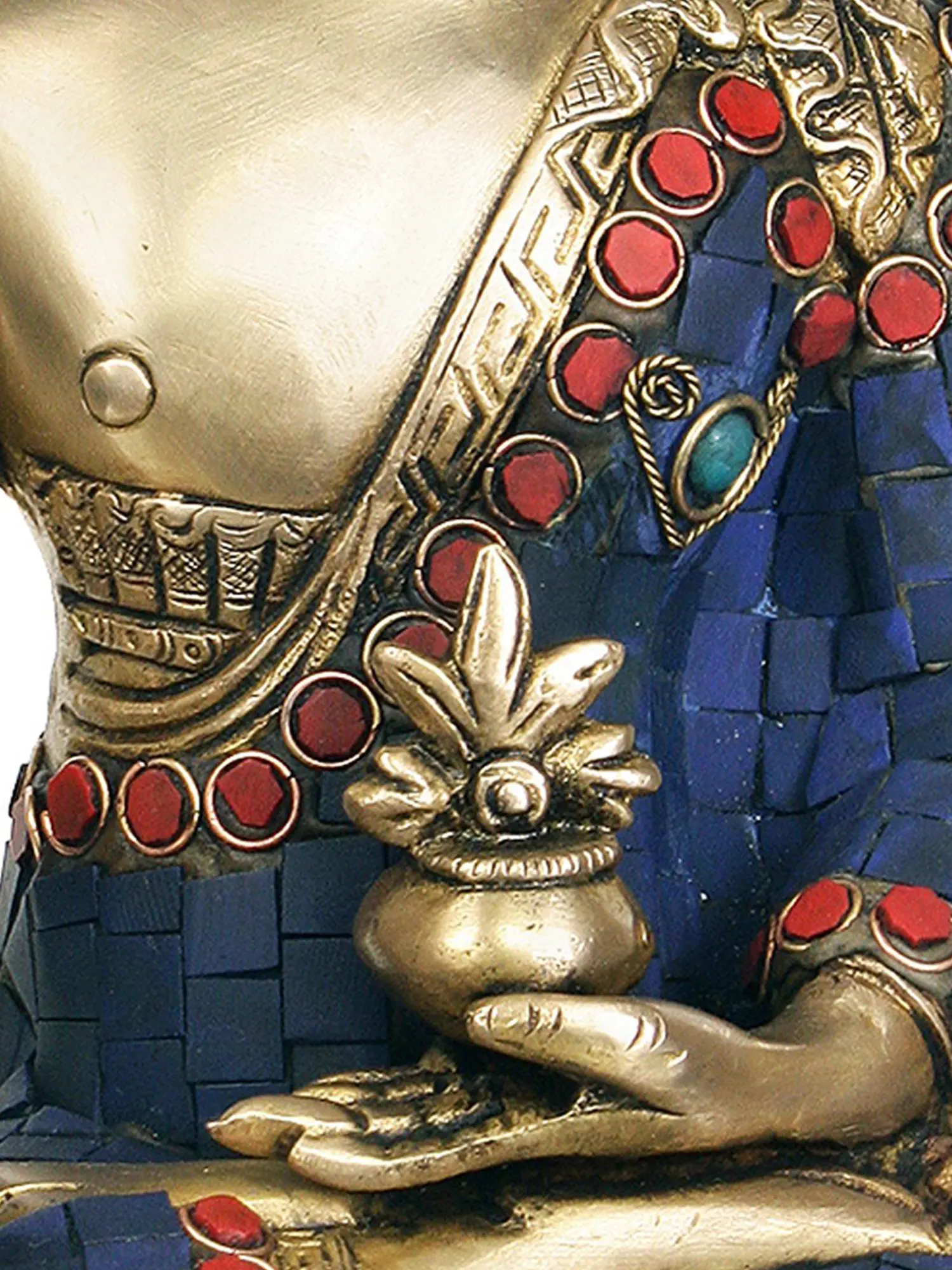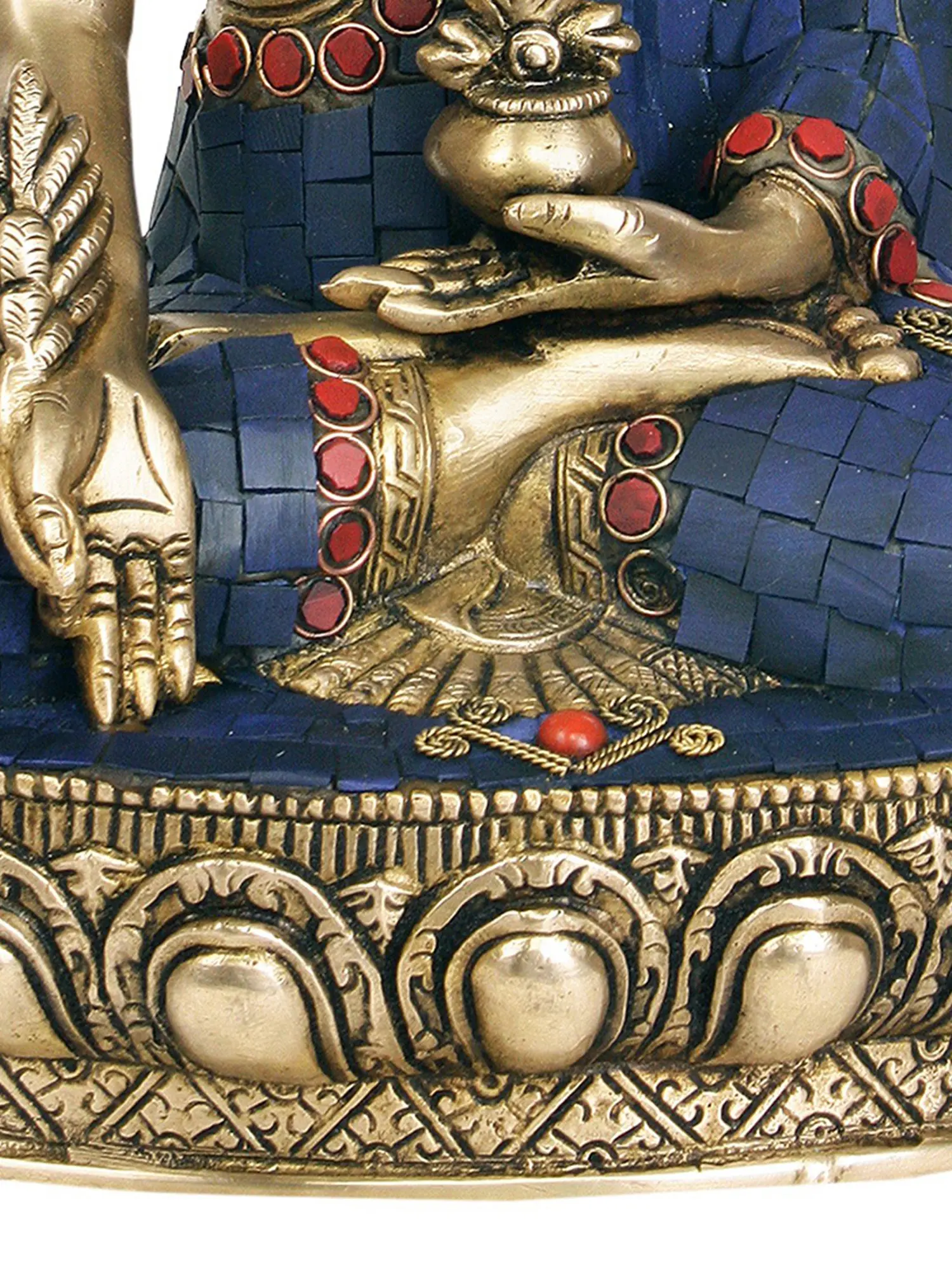 The right hand of the Medicine Buddha rests on his knee in the varada mudra, a gesture of giving and compassion. In this hand, he often holds the stem of a Myrobalan plant, a medicinal herb renowned for its healing properties. His left hand rests in his lap, holding a begging bowl filled with nectar, further emphasizing his role as a provider of nourishment and well-being. The intricate detailing on his robe and the lotus base upon which he sits further enhance the statue’s beauty and spiritual significance. Notice the exquisite inlays of vibrant colors, bringing a touch of richness and visual delight to this inspiring form. The use of brass lends a timeless quality to the piece, ensuring that it will remain a cherished part of your collection for years to come.