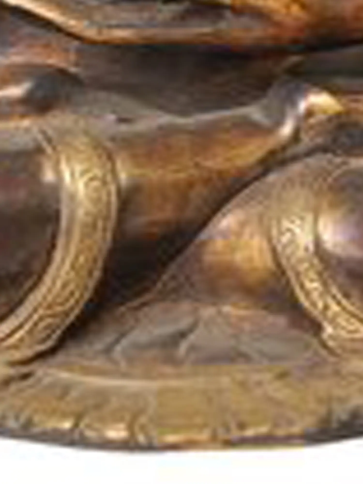 Behold this exquisite brass statue, a masterful depiction of the Medicine Buddha, known in Sanskrit as Bhaisajyaguru. This divine figure represents the celestial doctor who dispels the suffering of sickness and ignorance, offering solace and healing to all beings. In Tibetan Buddhism, the Medicine Buddha is a powerful symbol of spiritual and physical well-being, invoked to overcome obstacles, alleviate pain, and cultivate inner peace. The artistry of this 11-inch sculpture is a testament to the rich heritage of Indian craftsmanship. Each detail, from the serene expression on the Buddha's face to the delicate folds of his monastic robe, has been meticulously shaped by skilled hands. The warm, lustrous sheen of the brass evokes a sense of sacredness and timelessness, inviting contemplation and devotion. The Medicine Buddha is often depicted seated in the lotus posture, symbolizing spiritual enlightenment, and here, this pose is rendered with grace and stability.