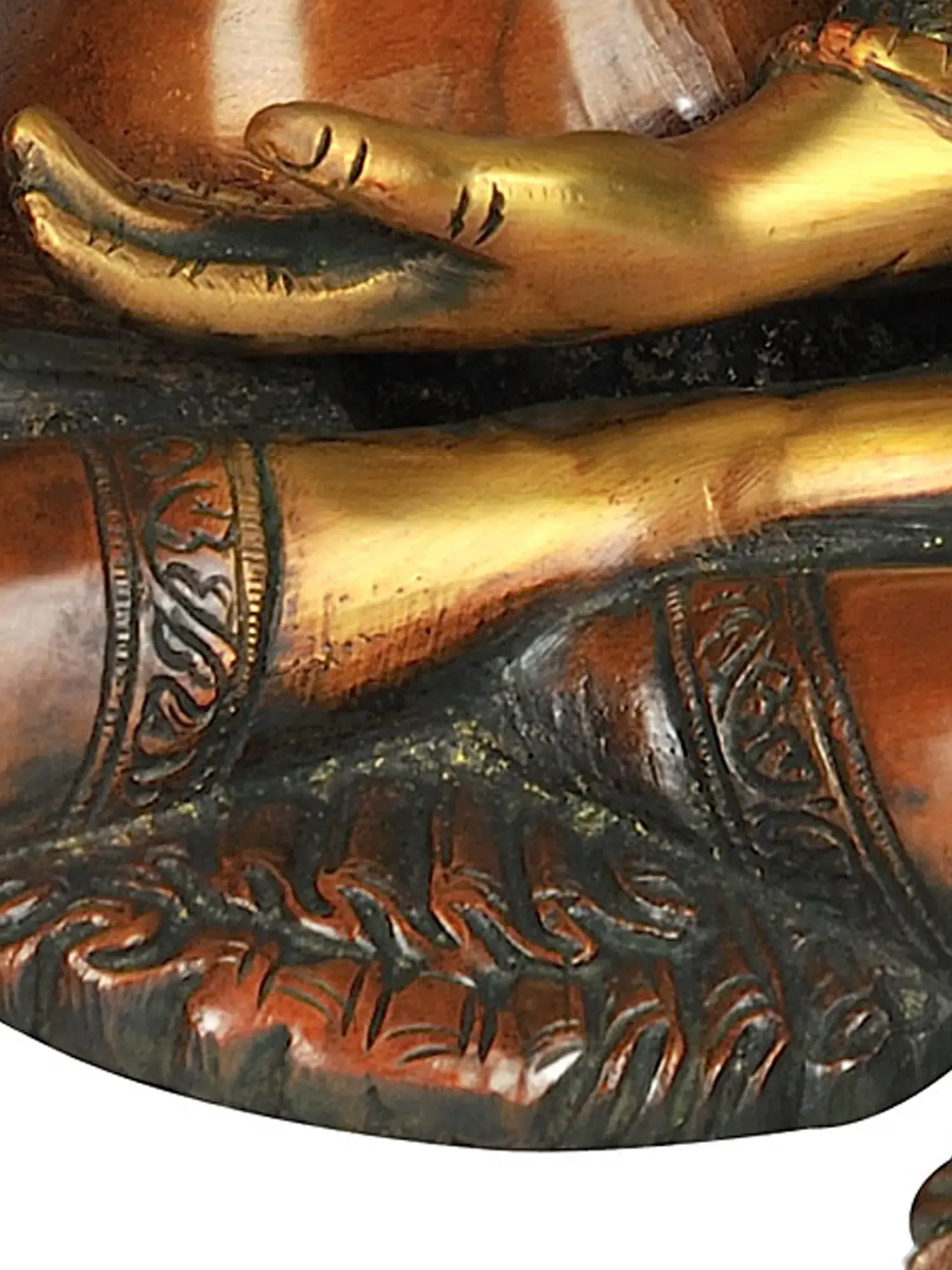In his left hand, the Medicine Buddha holds a lapis lazuli bowl filled with medicine nectar, symbolizing his ability to heal all diseases and ailments, both physical and mental. His right hand rests in his lap in the Varada Mudra, the gesture of giving and compassion, signifying his willingness to grant blessings and help all beings in need. The branch of the myrobalan plant held between his fingers is a potent symbol of healing, believed to possess medicinal properties capable of restoring balance and harmony within the body. The Medicine Buddha is said to have made twelve great vows upon attaining enlightenment, each dedicated to relieving suffering and bringing happiness to all sentient beings. These vows reflect his profound commitment to healing and compassion, making him a powerful symbol of hope and healing for Buddhists around the world. Meditating upon the Medicine Buddha or reciting his mantra are believed to bring physical and mental well-being, as well as protection from negative influences. This statue serves as a tangible reminder of the Medicine Buddha's compassionate presence and his unwavering commitment to healing. It is more than just an art object; it is a sacred representation of enlightenment and compassion, a beacon of hope for those seeking healing and inner peace. Its presence in a home or meditation space can create a tranquil atmosphere, fostering a sense of well-being and connection to the healing power of the Medicine Buddha. This handcrafted piece embodies centuries of artistic and spiritual tradition, a testament to the enduring power of faith and the pursuit of enlightenment.