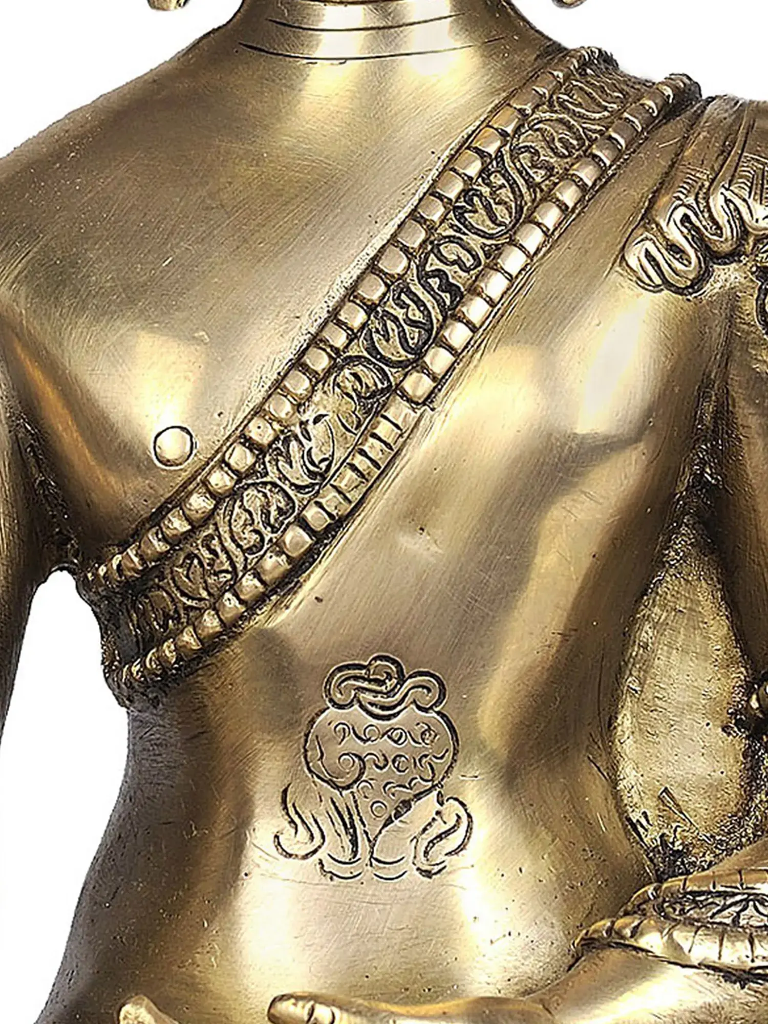 This brass statue presents the Medicine Buddha, also known as Bhaisajyaguru, a central figure in Tibetan Buddhism revered for his power to heal and alleviate suffering. The Buddha is depicted in a meditative pose, radiating an aura of serenity and compassion. His closed eyes suggest deep contemplation, inviting viewers to turn inward and find their own inner peace. Every detail, from the delicate folds of his robe to the serene expression on his face, has been rendered with meticulous care, reflecting the rich artistic traditions of India, where this masterpiece was crafted. The use of brass gives the statue a beautiful silver hue, highlighted by the golden borders that adorn his garment. The contrast between the silver and gold adds to the statue's visual appeal, creating a sense of depth and dimension. The intricate designs on the garment reflect the artistry and skill of the craftsmen who brought this figure to life.
