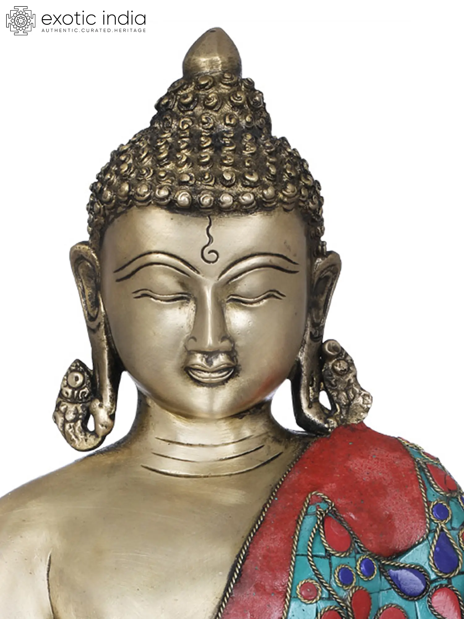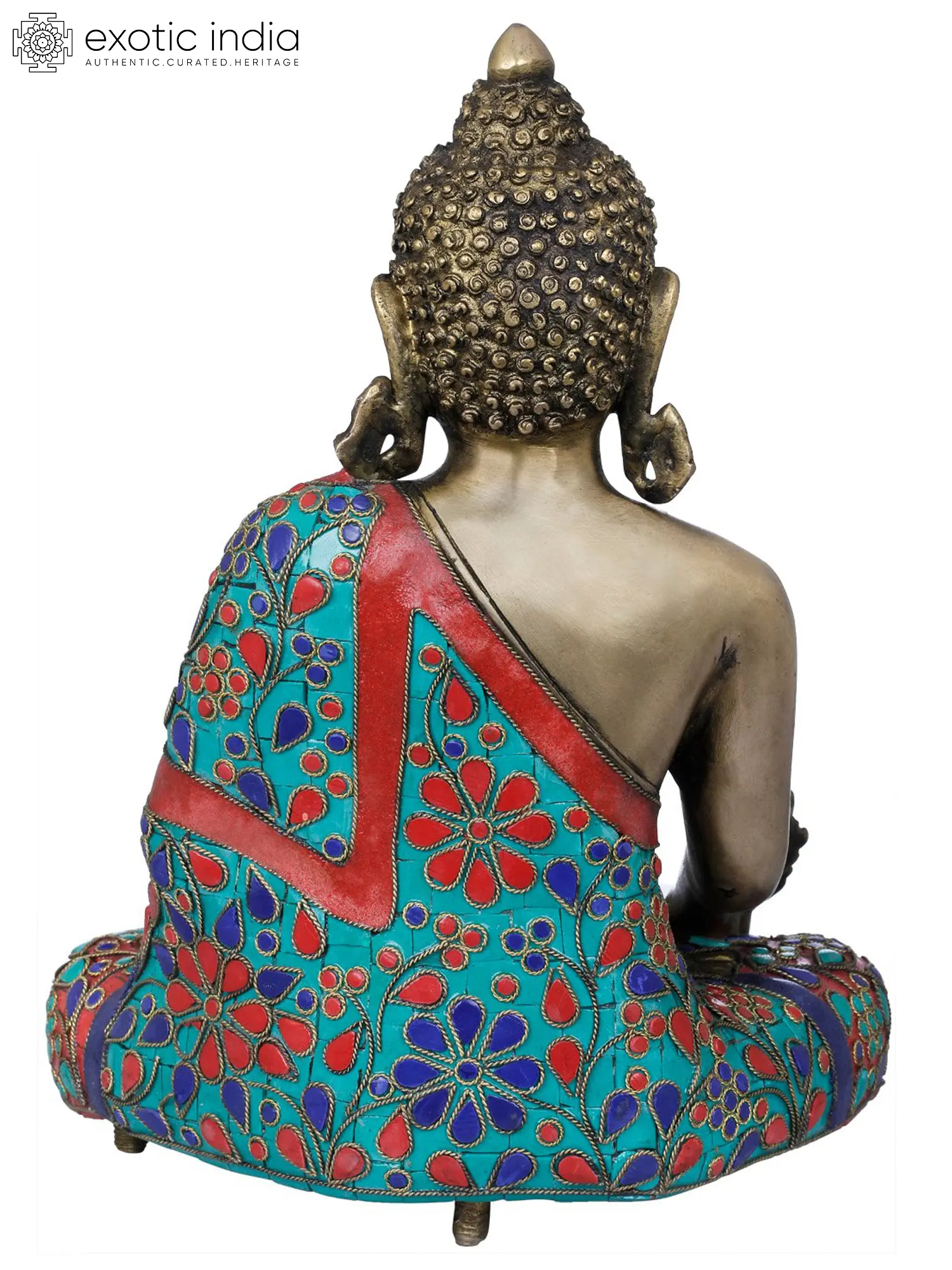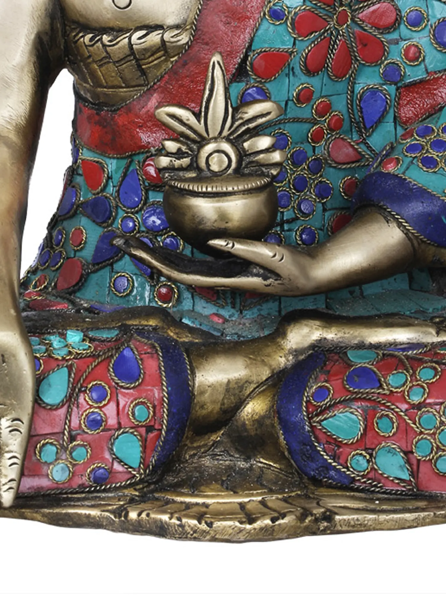 This exquisite brass statue captures the serene presence of the Medicine Buddha, Bhaisajyaguru, a pivotal figure in Mahayana Buddhism. Revered as the master of healing, he is believed to possess the power to overcome illness, ignorance, and suffering. The detailed craftsmanship, emanating from the heart of India, showcases the deep spiritual traditions and artistic heritage of the region. The intricate inlay work adorning the robe, featuring vibrant shades of turquoise, lapis lazuli, and coral, adds a layer of richness and symbolic meaning. Turquoise often symbolizes healing and protection, while lapis lazuli is associated with wisdom and enlightenment.