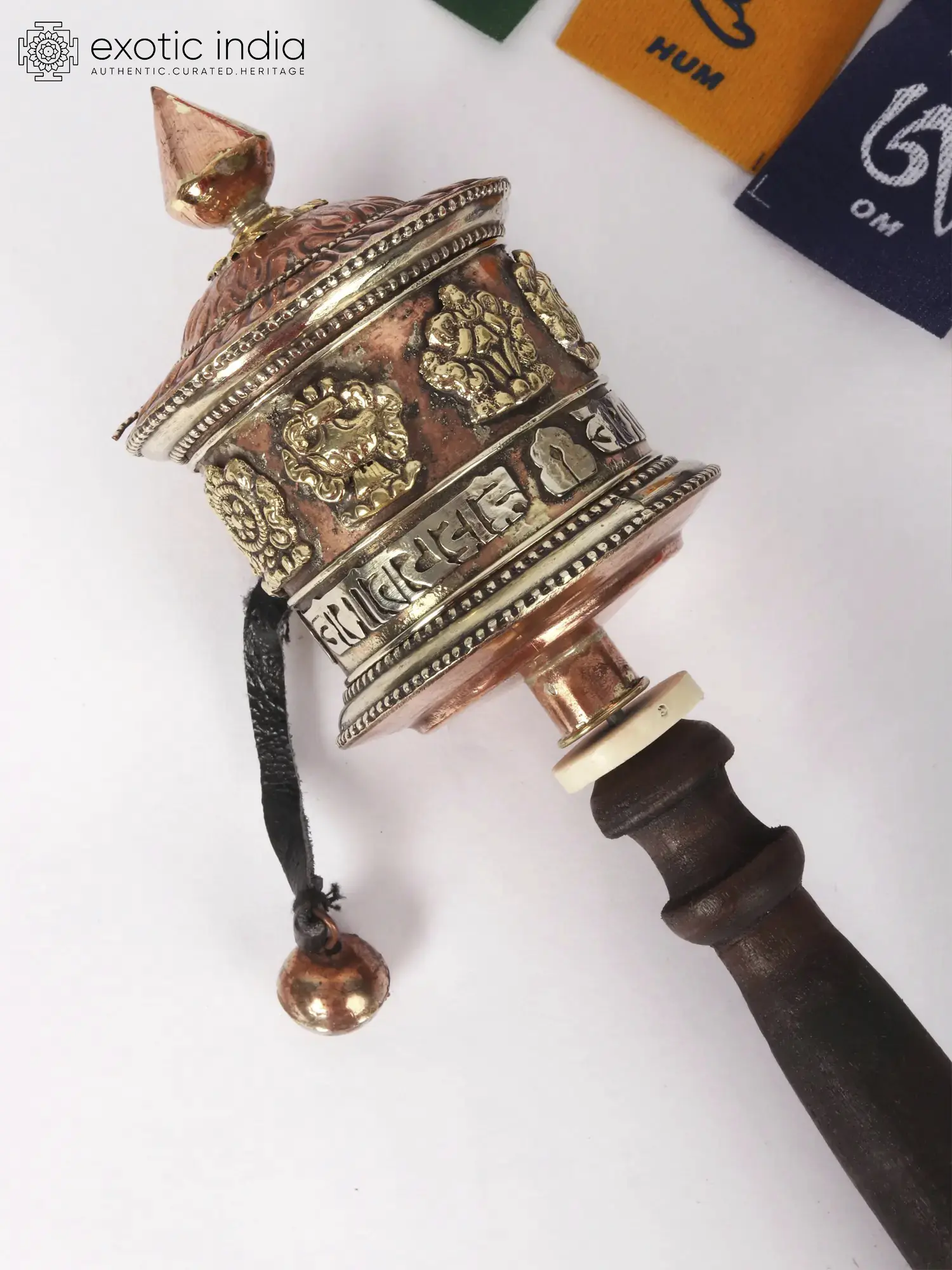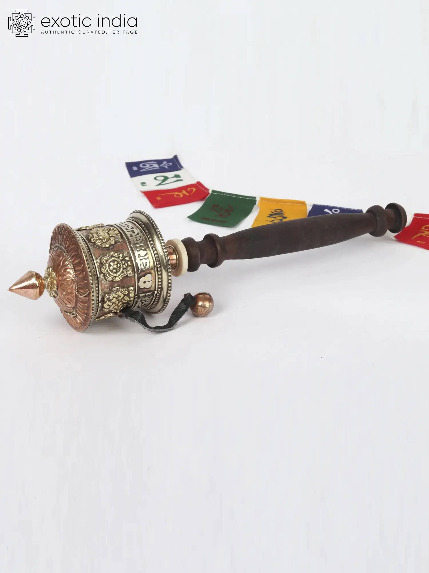 Fashioned from durable copper and smoothly finished wood, this prayer wheel is a testament to traditional craftsmanship. The warm gleam of copper, a metal revered for its purifying properties, is beautifully contrasted by the rich, natural tones of the wooden handle. The turning mechanism is designed for effortless motion, allowing for a smooth and continuous rotation as you engage in your spiritual practice. A small, resonant bell is attached, its gentle chime accompanying each turn, adding an auditory dimension to the meditative experience. The detailed engravings and applied ornamentation speak to the dedication and skill of the artisans who brought this sacred object to life, keeping alive centuries-old traditions passed down through generations in the heart of the Himalayas.