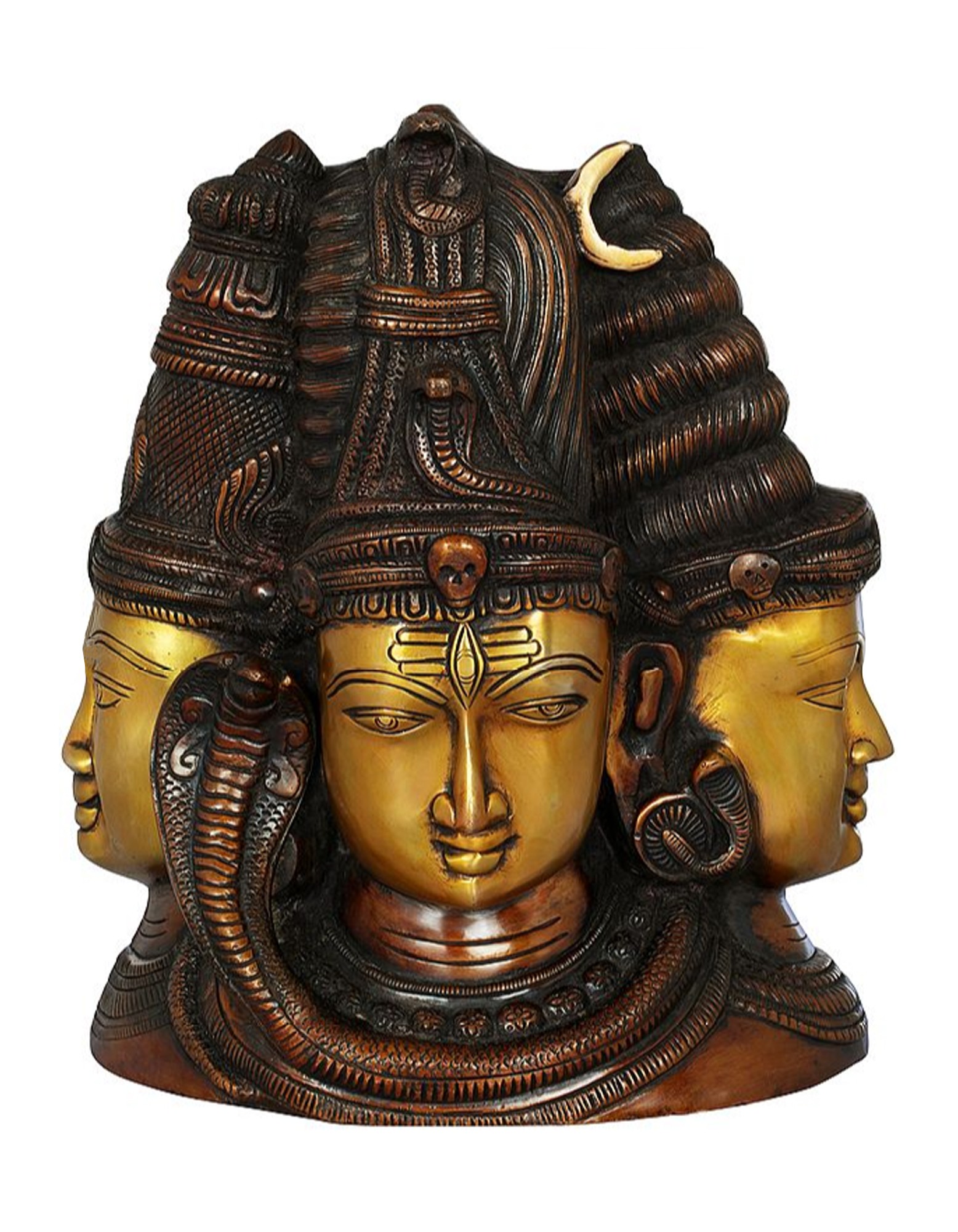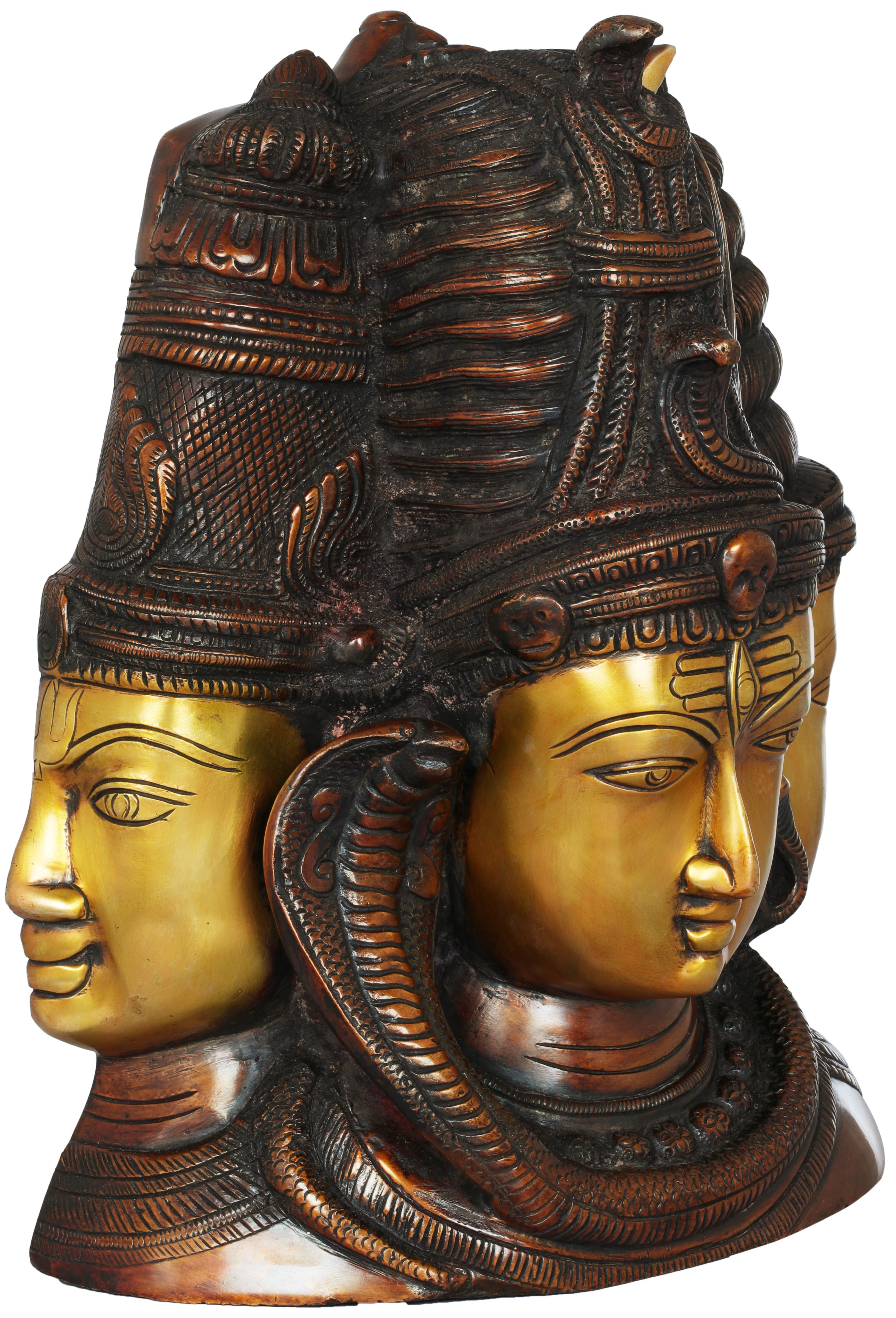This handcrafted brass idol beautifully unites the core deities of the Hindu pantheon in one magnificent piece.