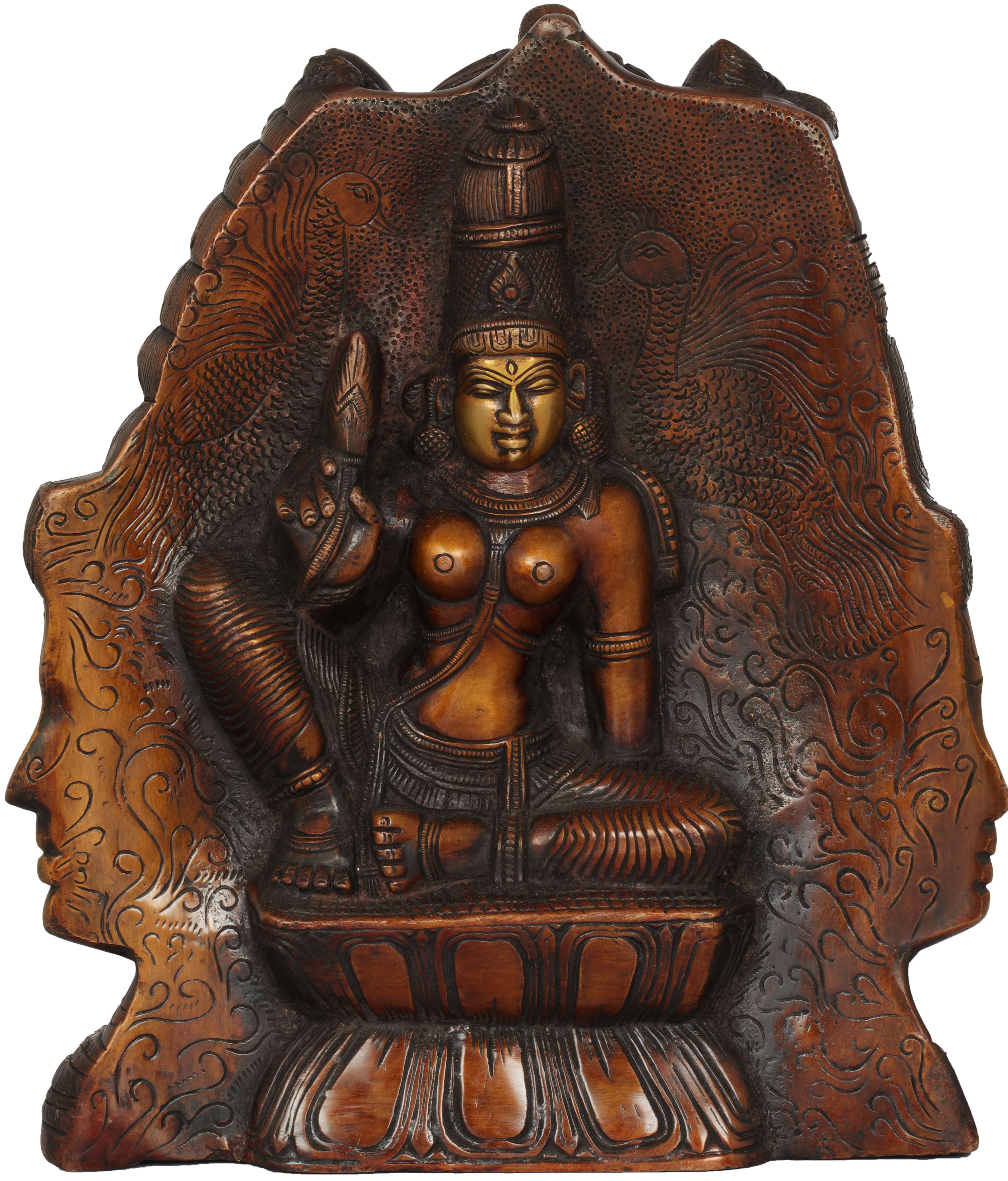 In this textual image of Tri-Murti and its Elephanta model the artist of this brass-statue has effected subtle changes so much so that it might be treated as a different image. The representation of Devi on the back, instead of an aspect of Sadashiva, is an absolutely new dimension of the image meditated neither in texts nor in any earlier models. It is for certain a product of artist’s own imagination. In the artist’s form of Tri-Murti Shiva’s own face is in the centre.