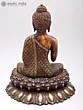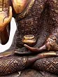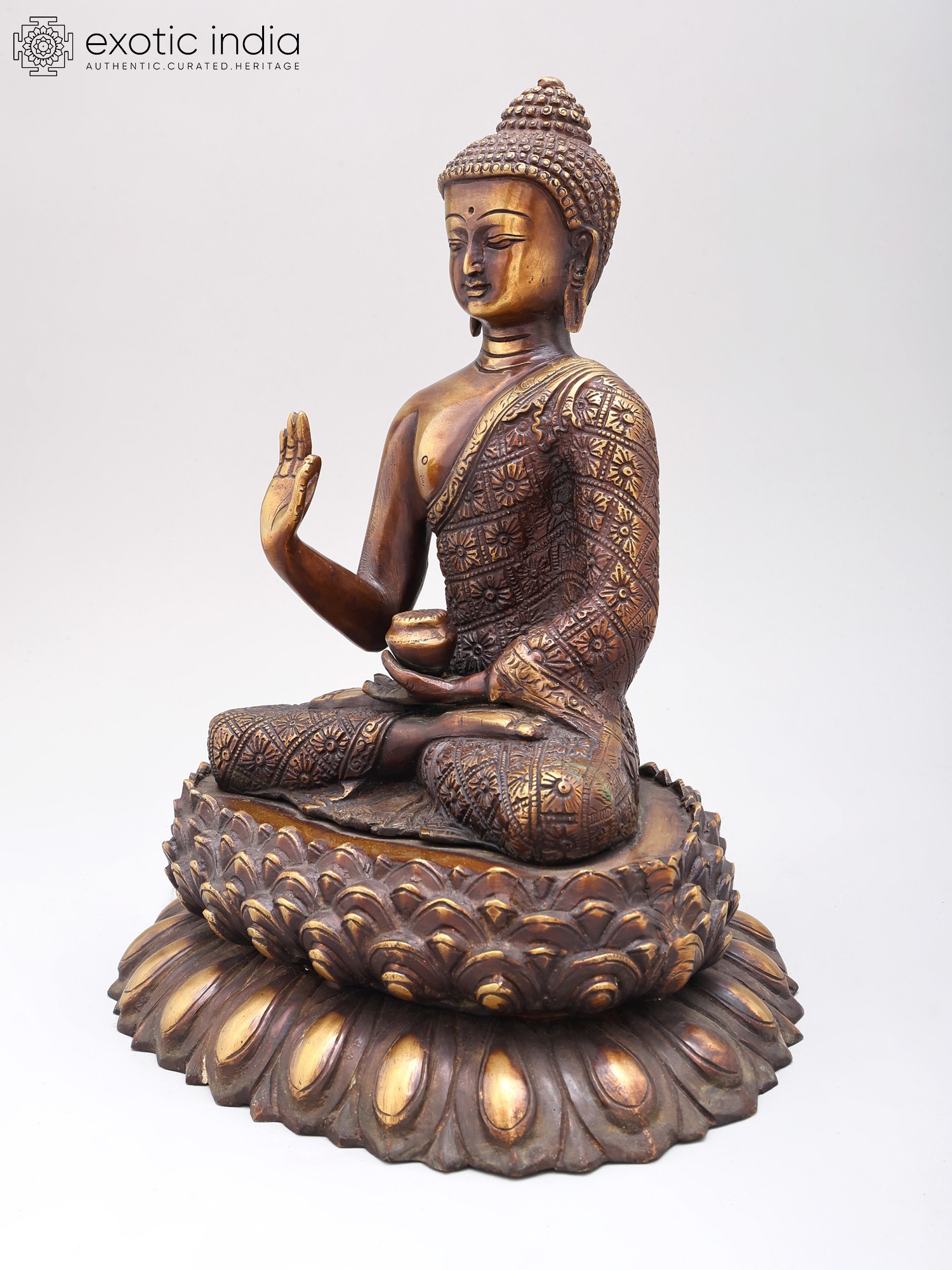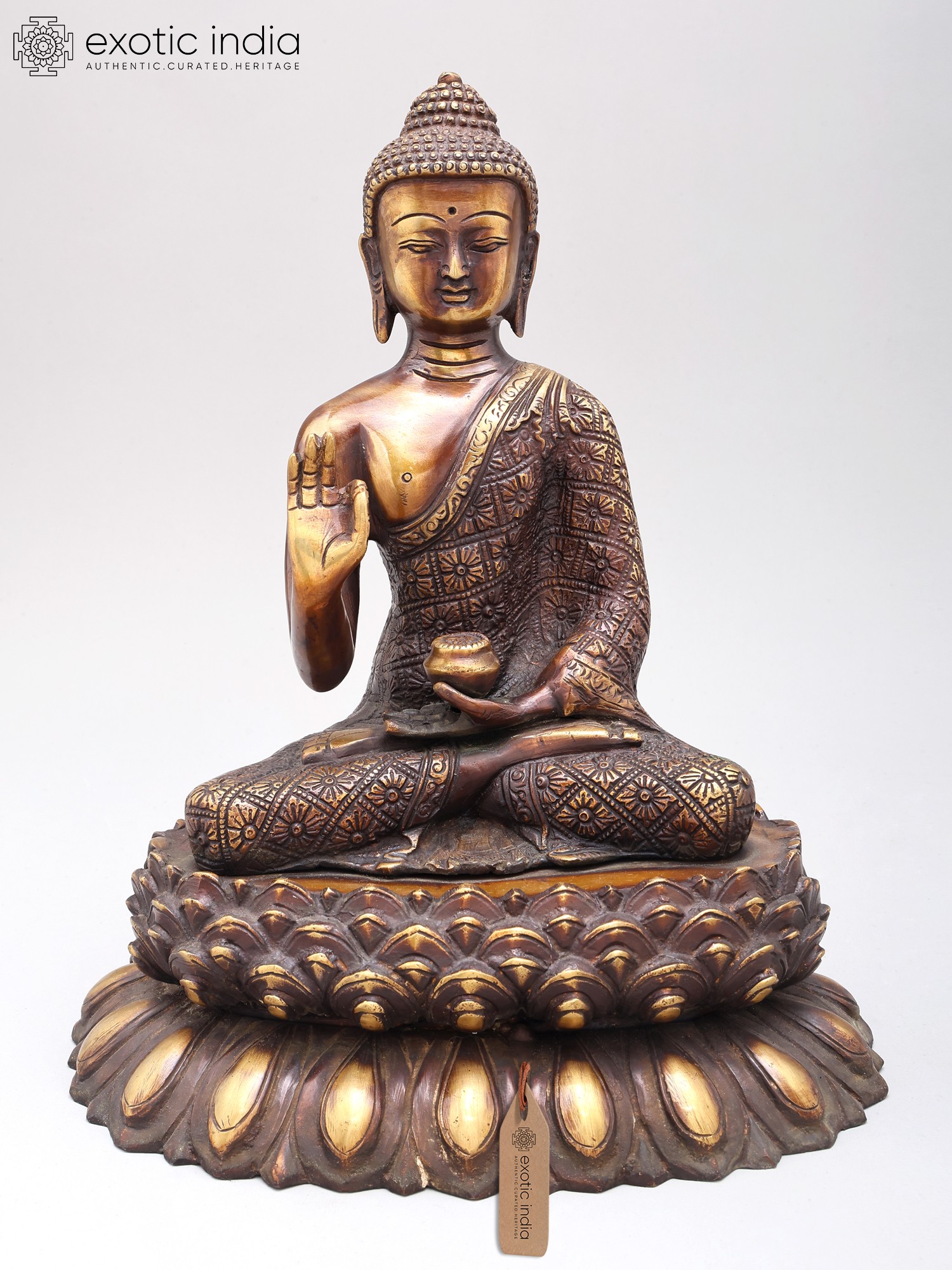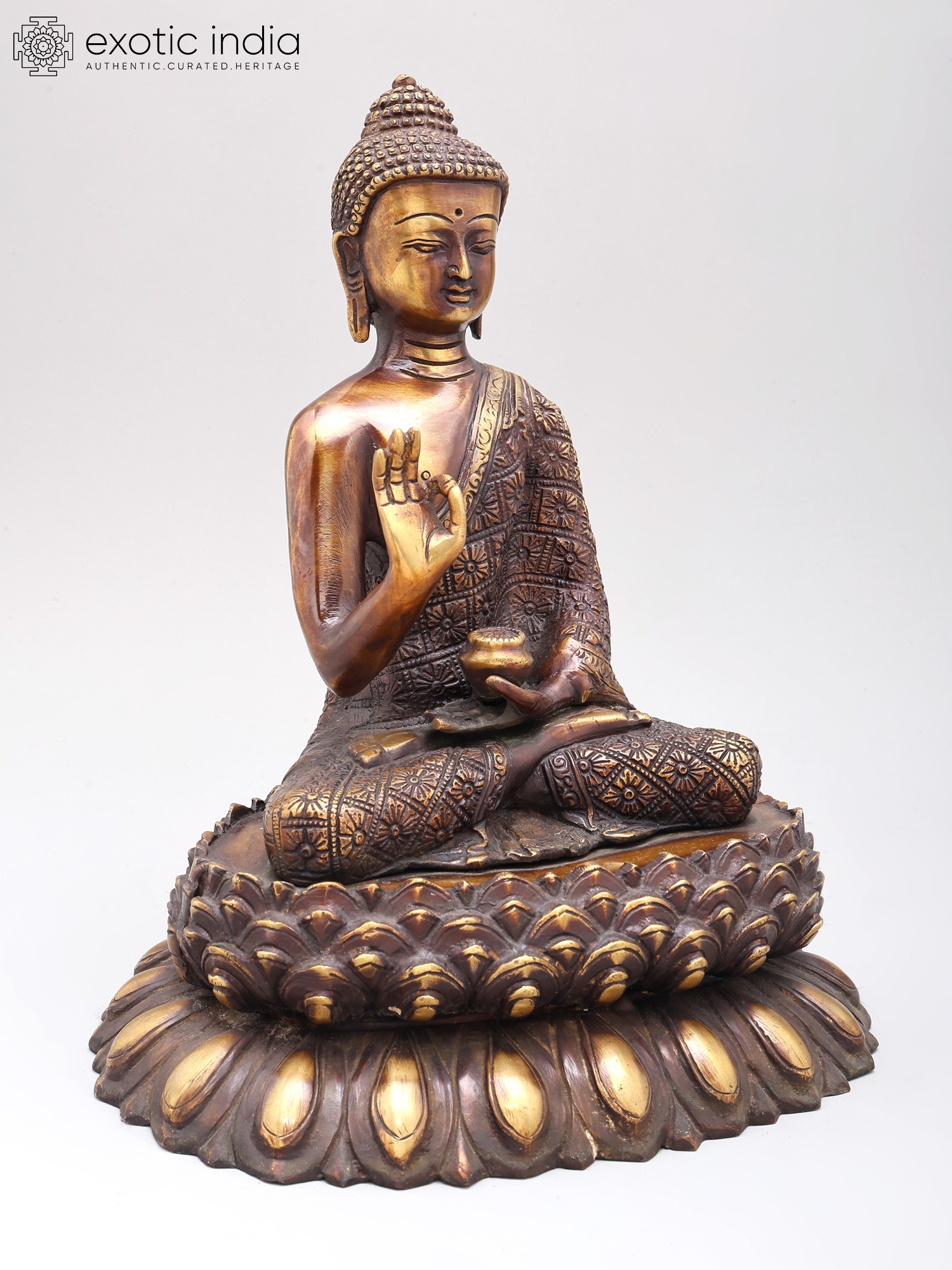 In the left hand which He rests on His lap, He cradles the almsbowl, a remnant of His days of mendicancy; the right hand He raises in the vitarka mudra, which is the wisdom-dispensing mudra.