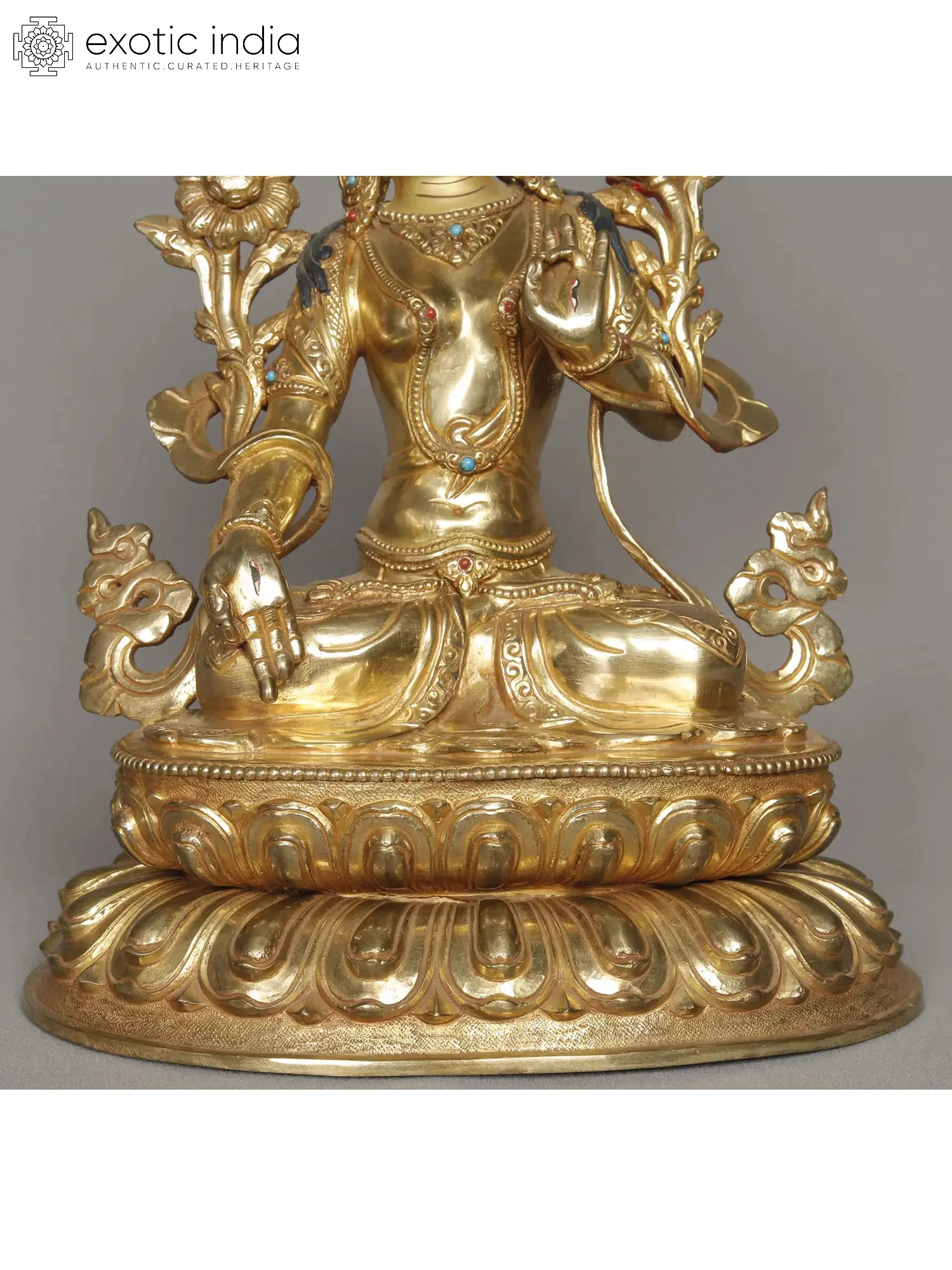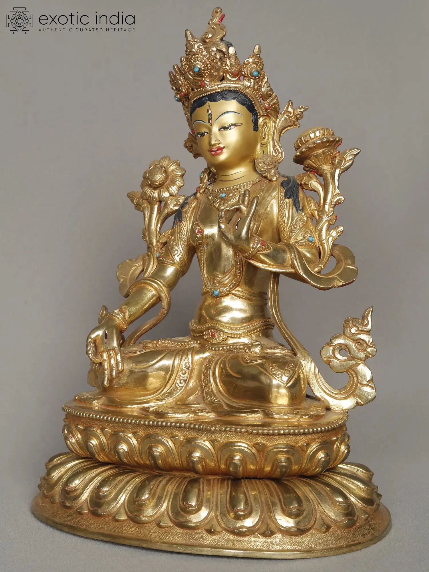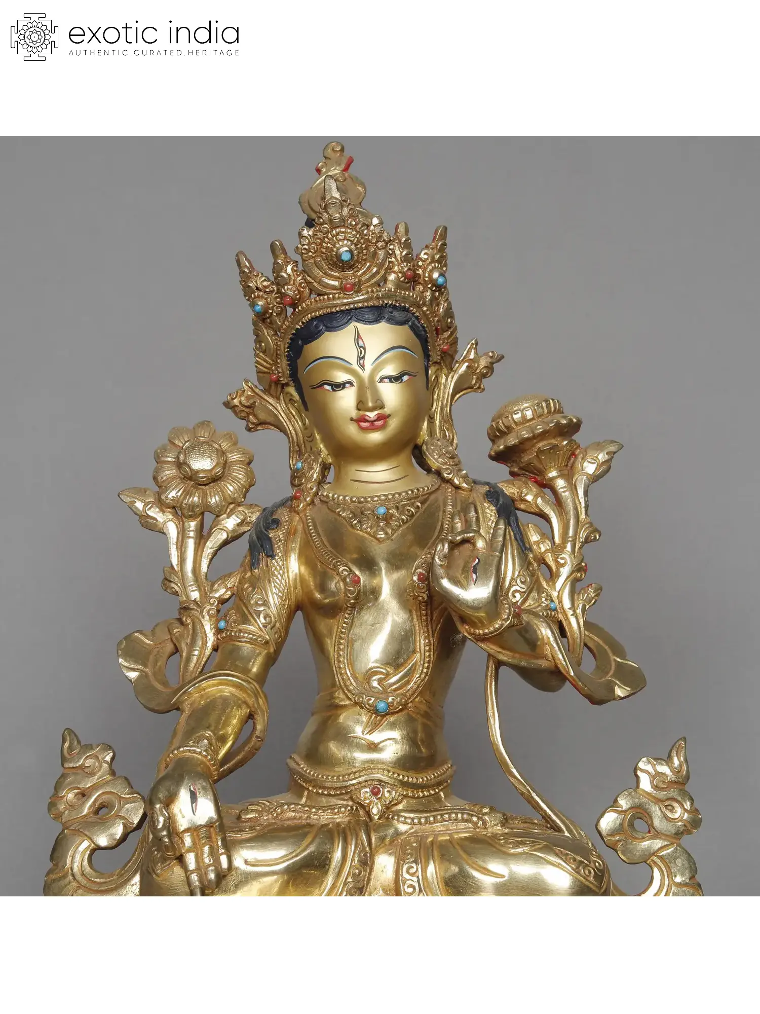 White Tara, a revered figure in Buddhism, embodies the essence of compassion, wisdom, and long life. Her radiant white complexion symbolizes purity and the highest form of enlightened wisdom. In the sculpture, you see her right hand in "varada mudra," which signifies her benevolence and granting of boons to those who seek her guidance. This compassionate gesture assures devotees of her readiness to fulfill their heartfelt wishes and provide spiritual assistance. In her left hand, she can be seen holding a lotus flower, representing her immaculate nature and transcendence over the impurities of the world.