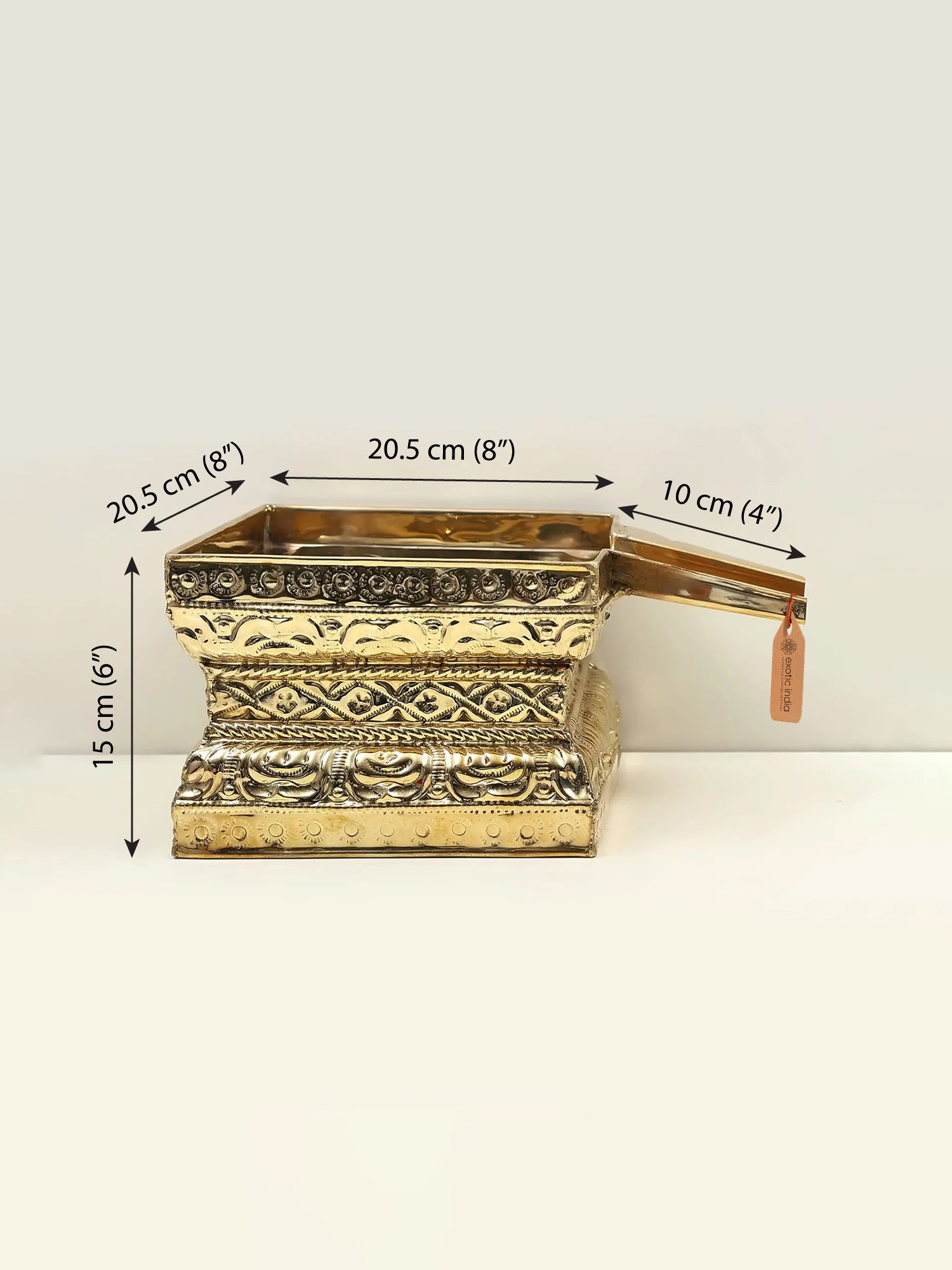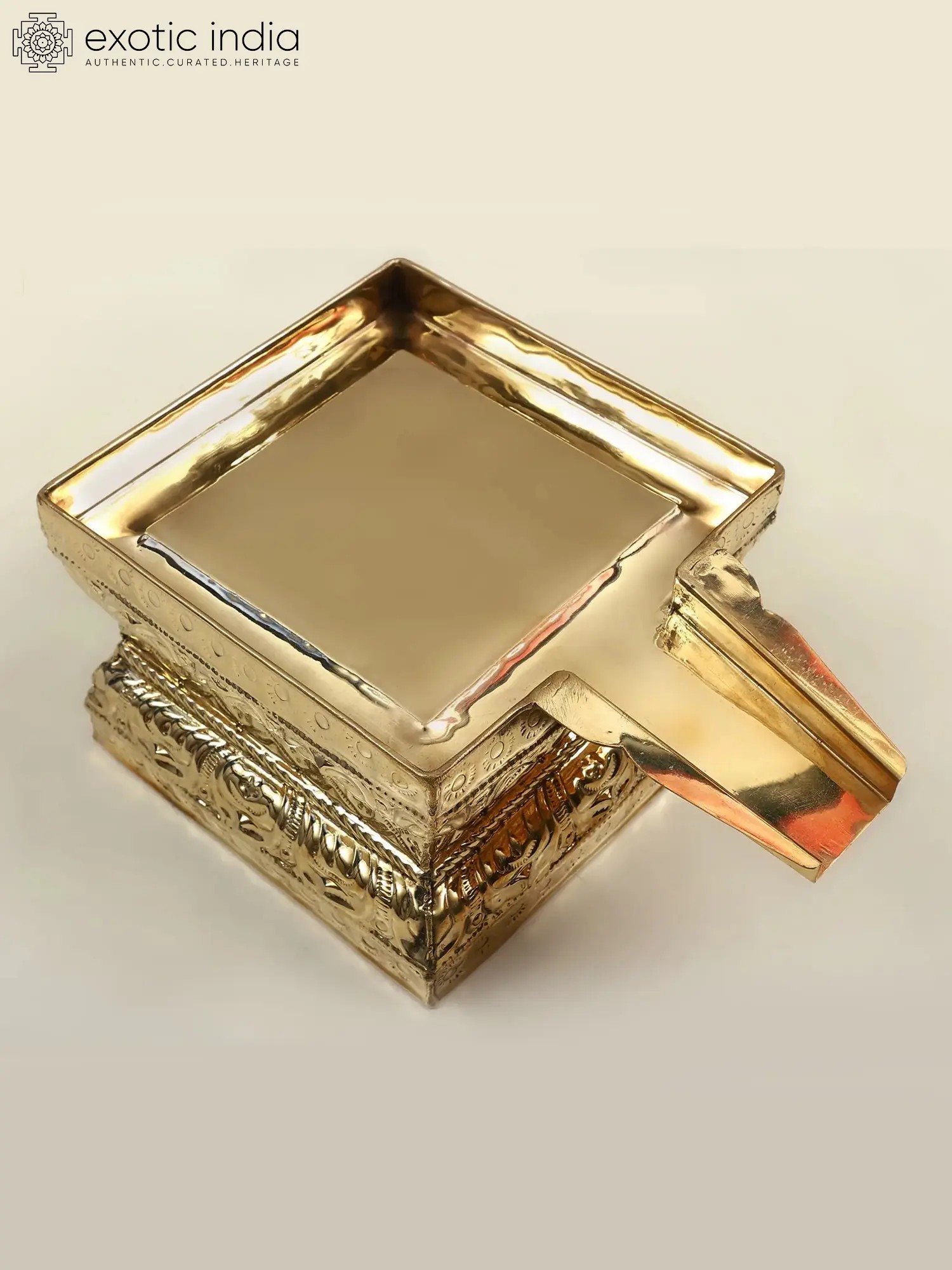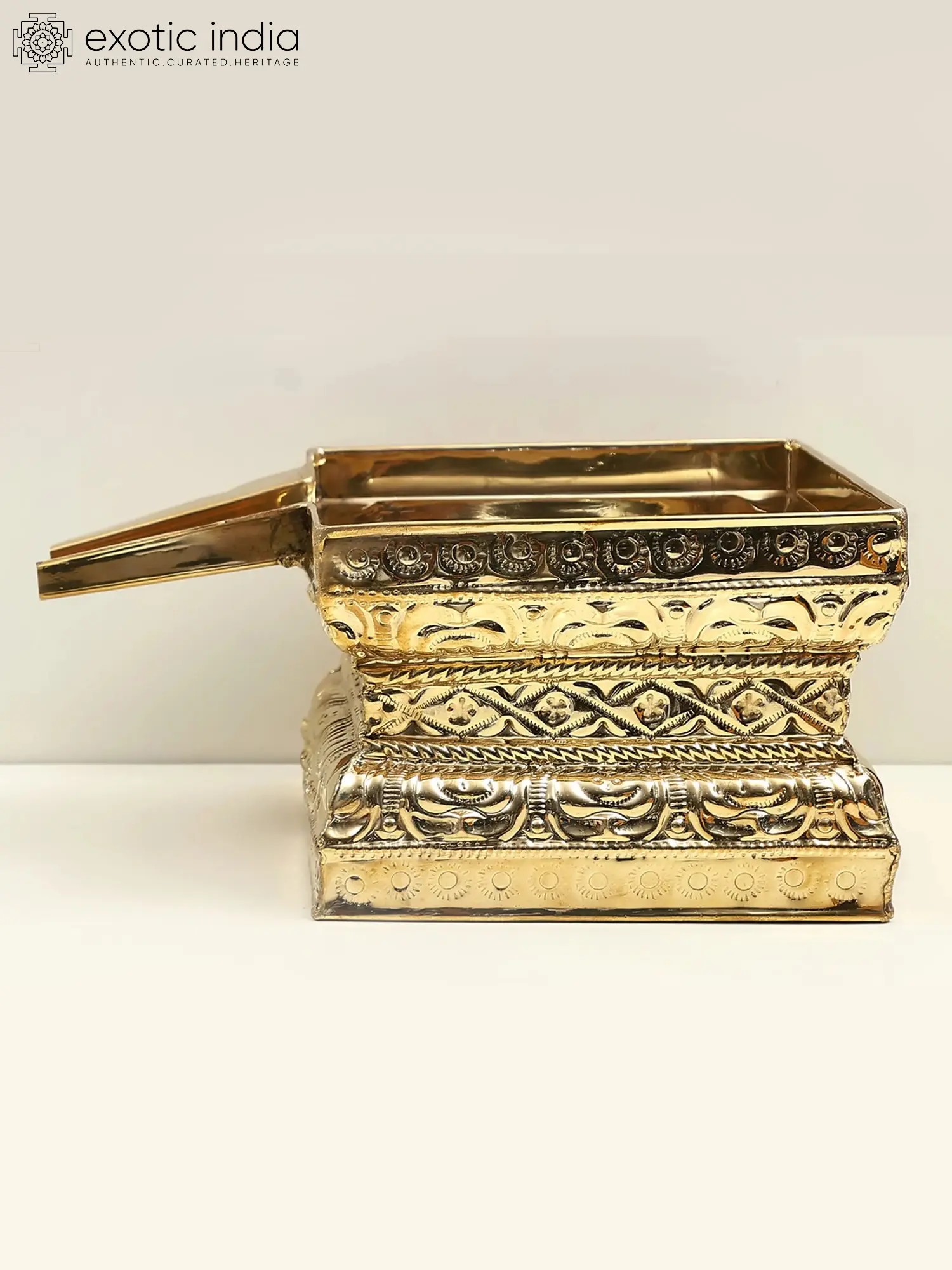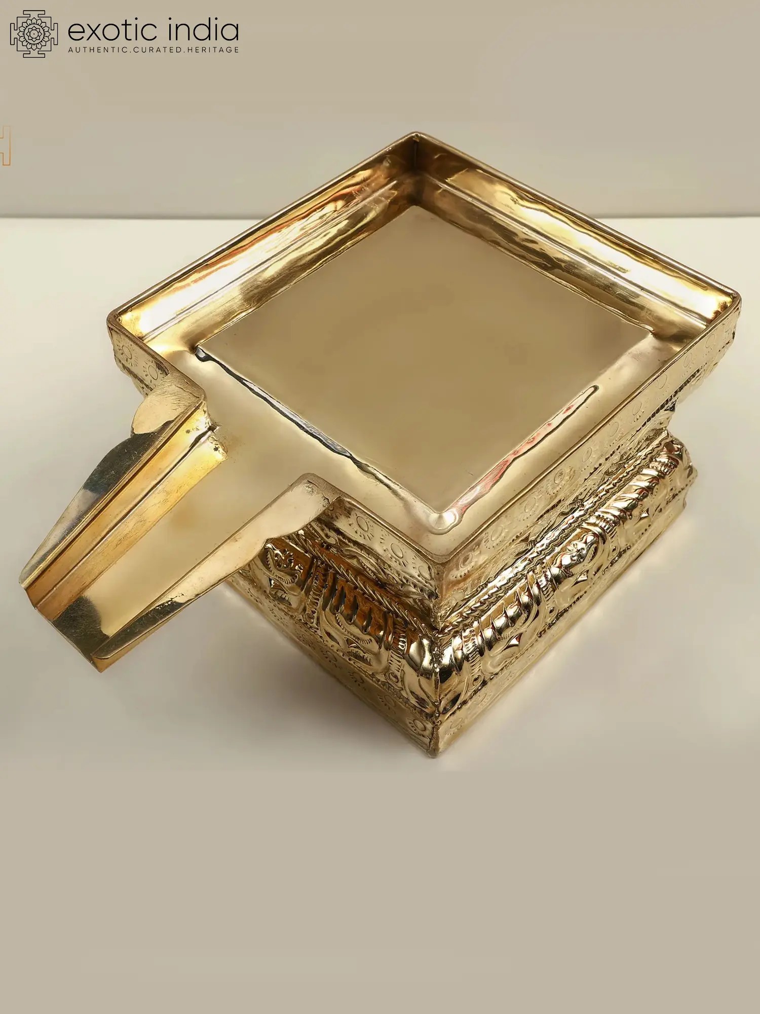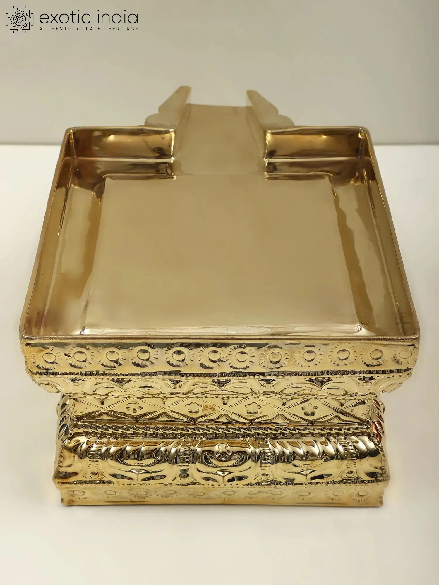 These trays come in different sizes, shapes, and designs depending upon the number and size of the deities to be bathed. The Abhishek Patra that you see here is made of brass and is rectangular in shape with fine finishing.