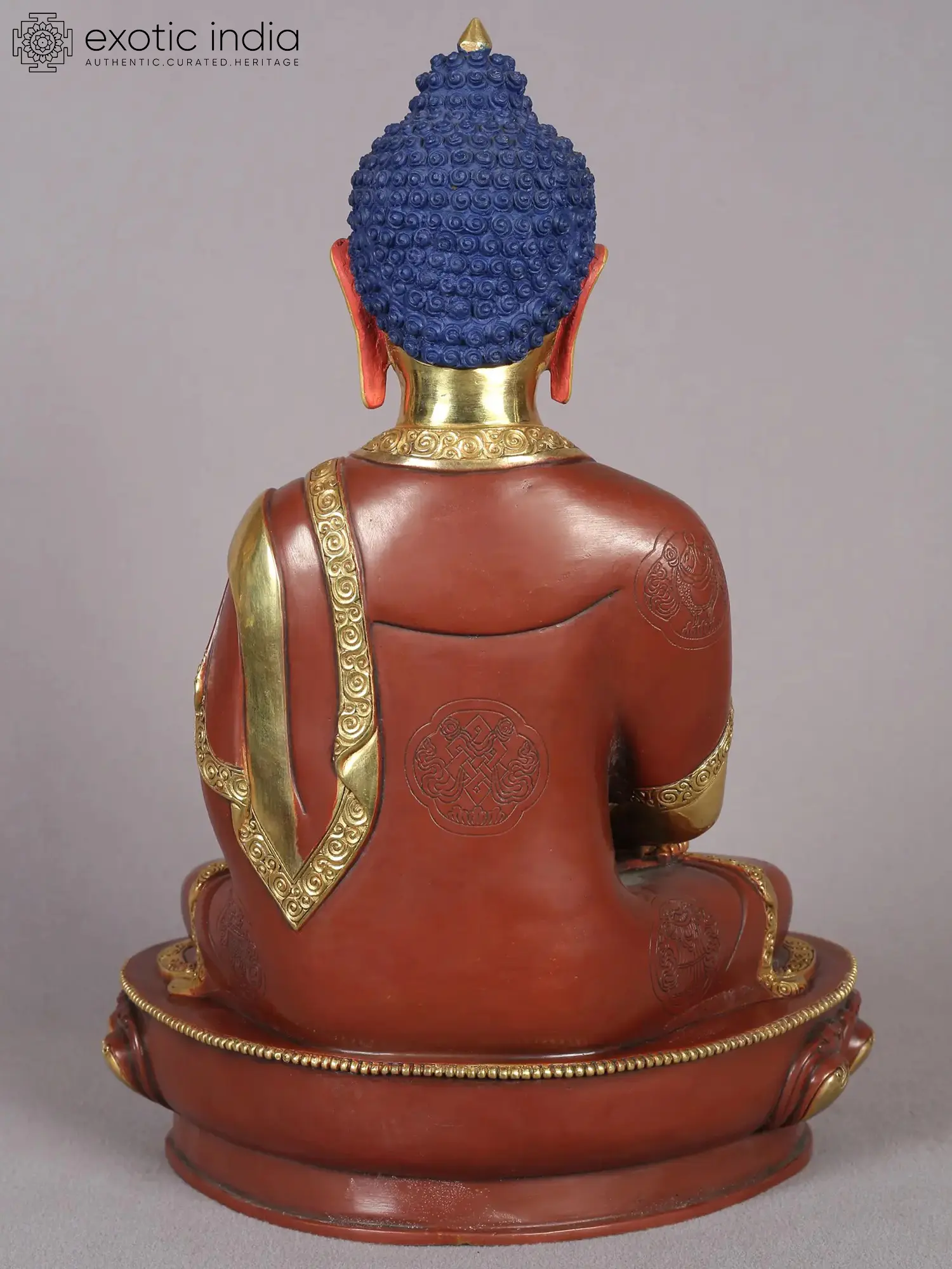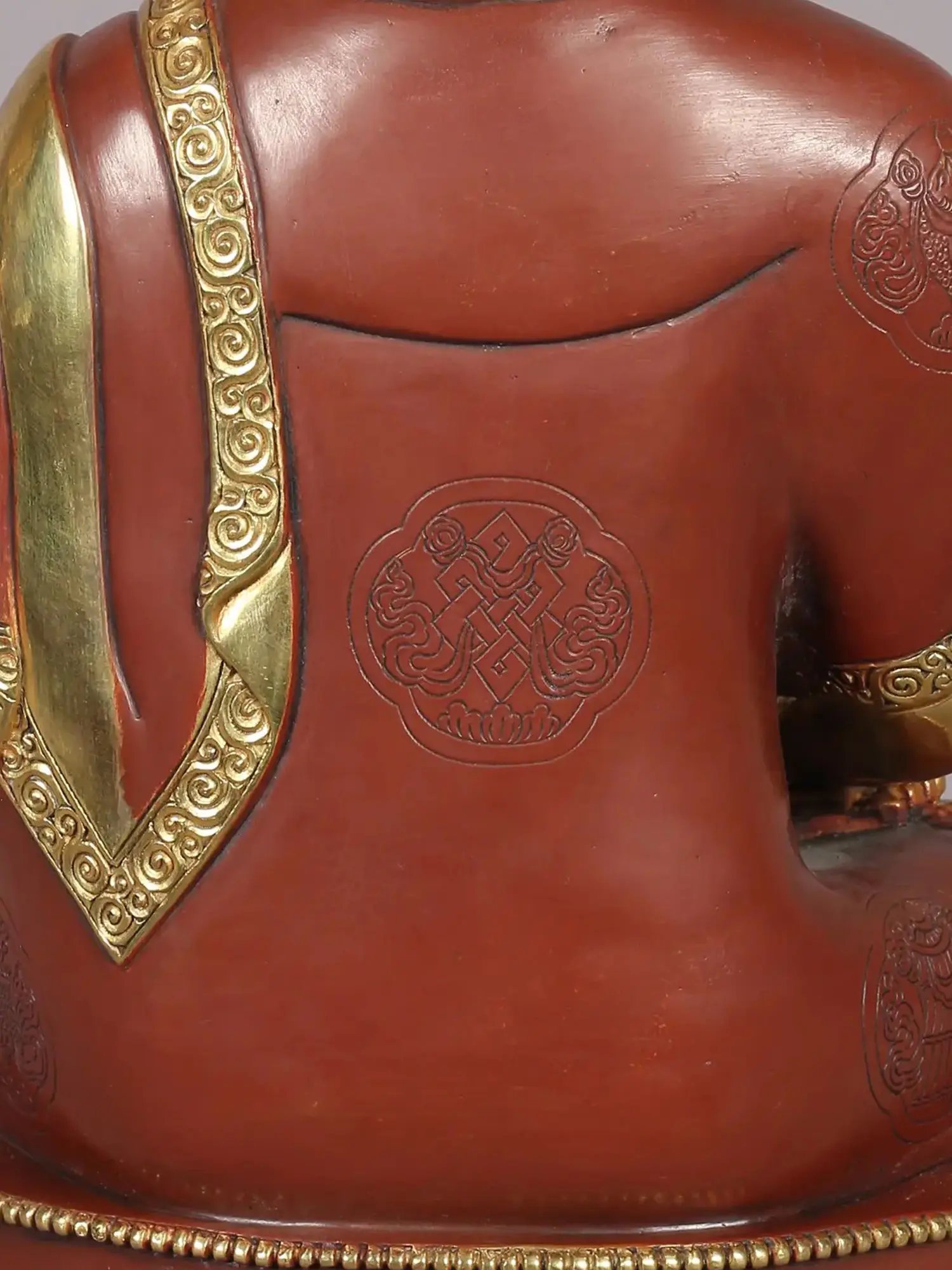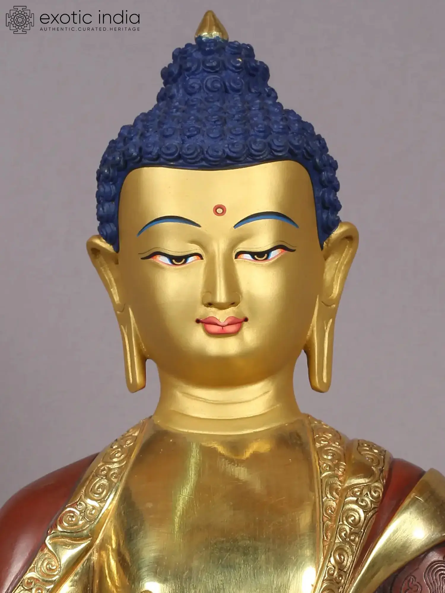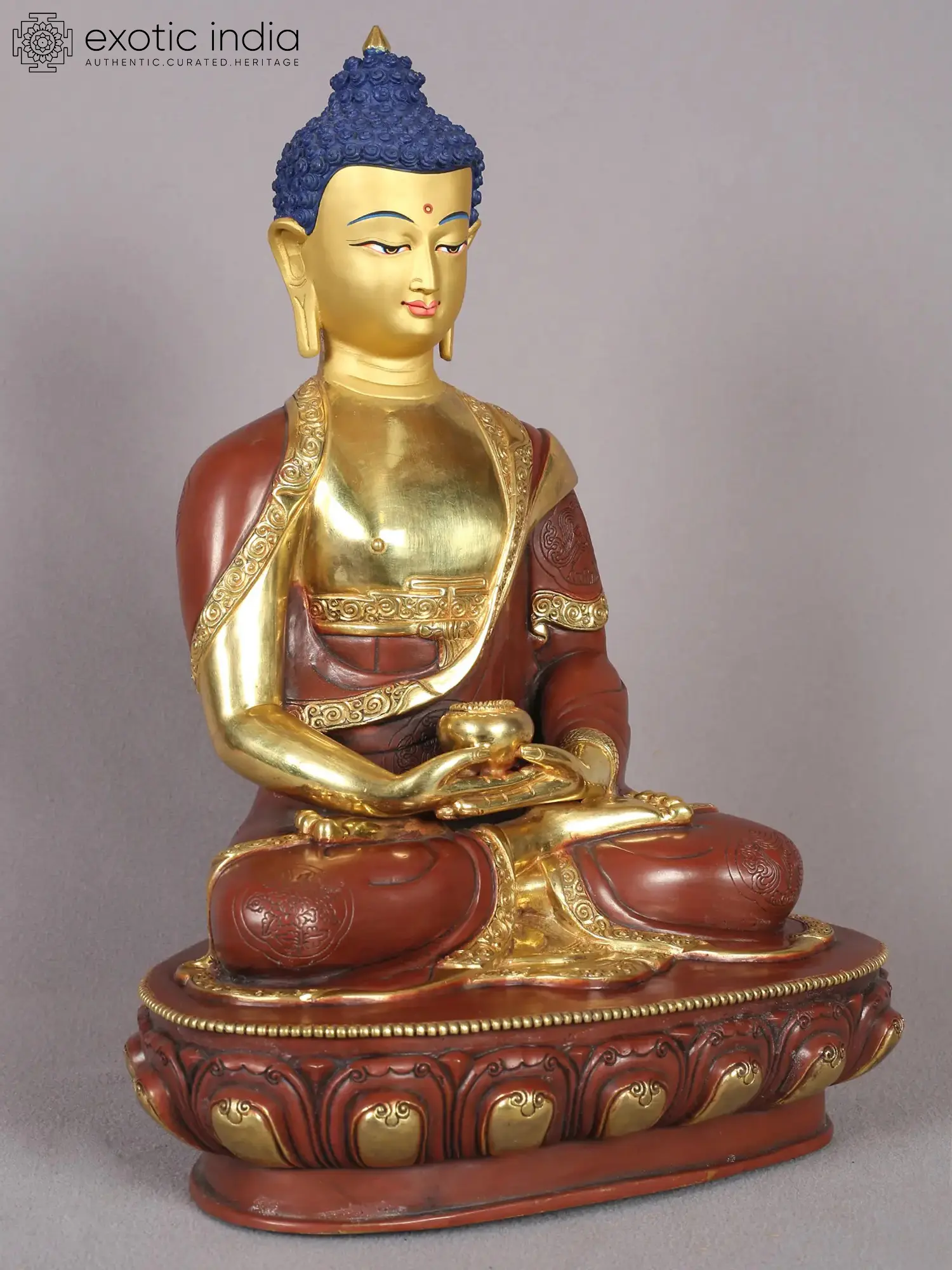 Amitabha, who shines eternally with the light of enlightenment, is invoked visually in this gilded copper statue from Nepal, bathed in pure gold and contrasted with the deep hue of copper. Mesmerizing symmetry is visible on Amitabha’s curls, and facial features, and a balance is felt in his gentle physique draped in luxurious robes etched with the Asthamangala or eight auspicious signs of Buddhism. The serenity of Amitabha in this statue comes from his benevolent eyes and youthful countenance, which make this a supremely aesthetic and divine artwork.
