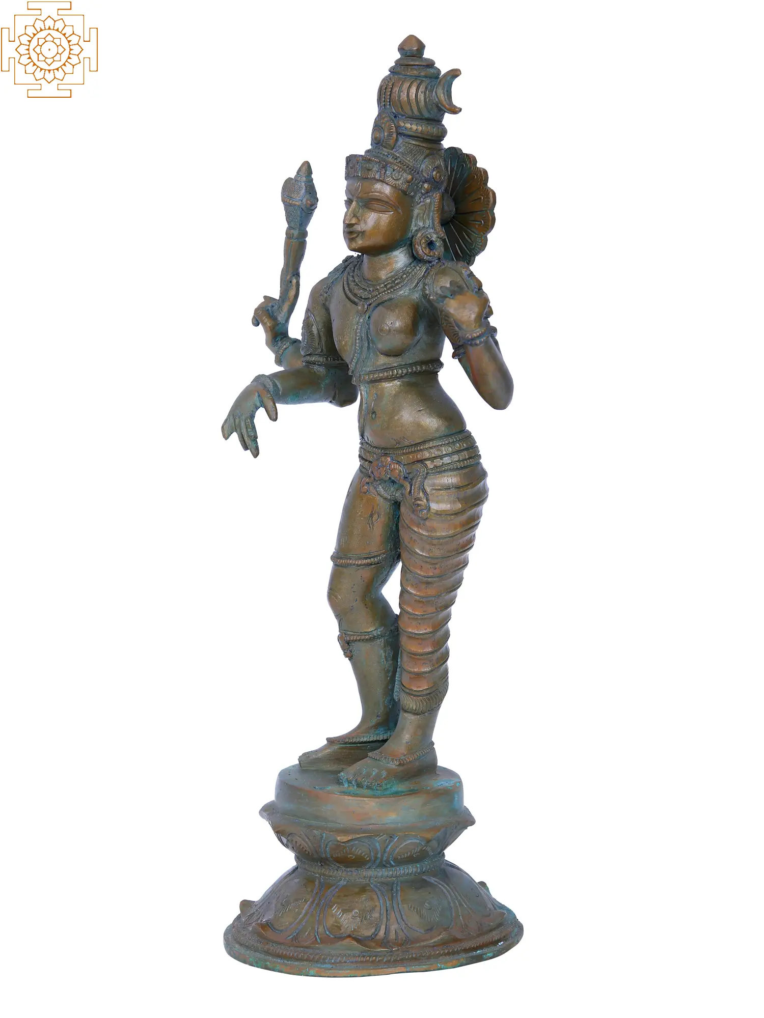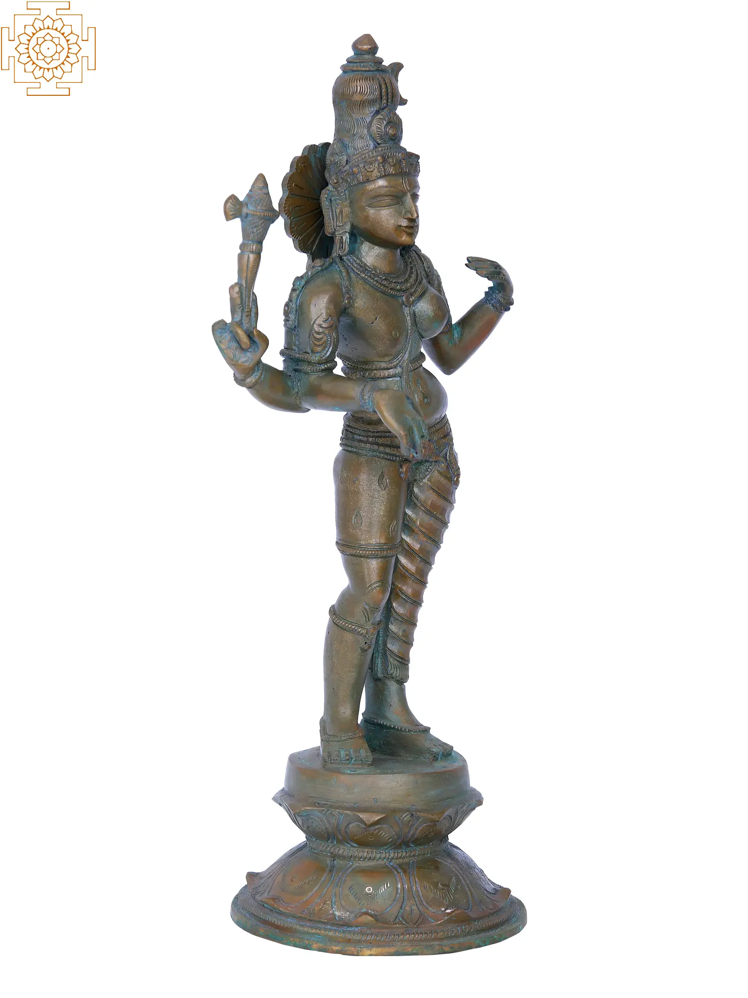 This exquisite bronze sculpture captures the divine androgynous form of Ardhanarishvara, a powerful manifestation of Lord Shiva and his consort Goddess Parvati. The deity embodies the fundamental principle that the masculine and feminine are inseparable, two halves of a whole that create the universe. Ardhanarishvara represents the ultimate union of consciousness and energy, the static and the dynamic, the destroyer and the nurturer. The posture of the deity, poised with a graceful elegance, speaks volumes about the harmonious balance it represents. The right side, embodying Shiva, displays a strong, stoic presence, while the left side, representing Parvati, emanates feminine grace and allure. This duality is not a conflict but a perfect symbiosis, a testament to the idea that creation and destruction, masculine and feminine, are interdependent forces that sustain the cosmos. In Hindu mythology, it is said that the universe could not have been created without this unified divine essence.
