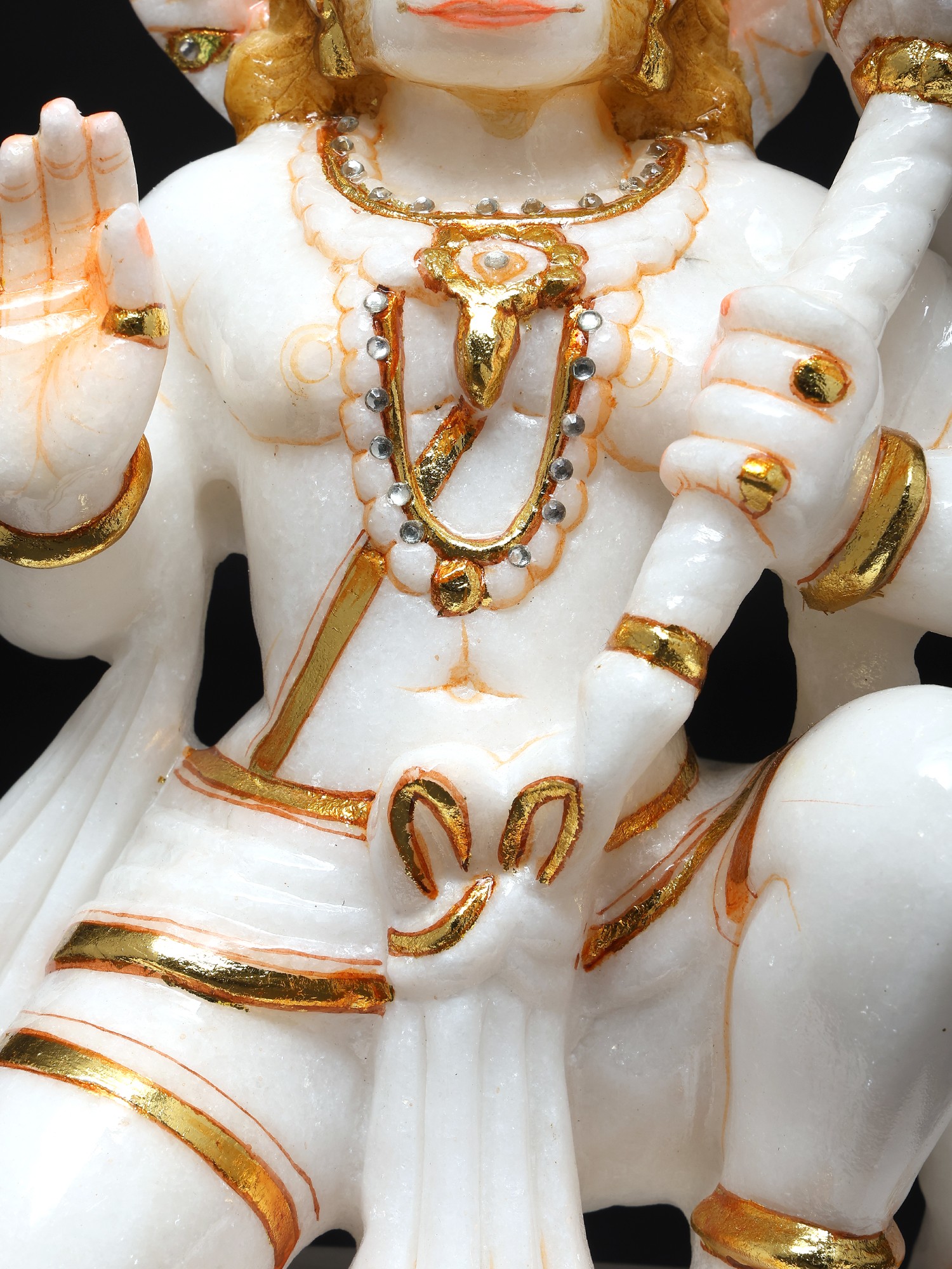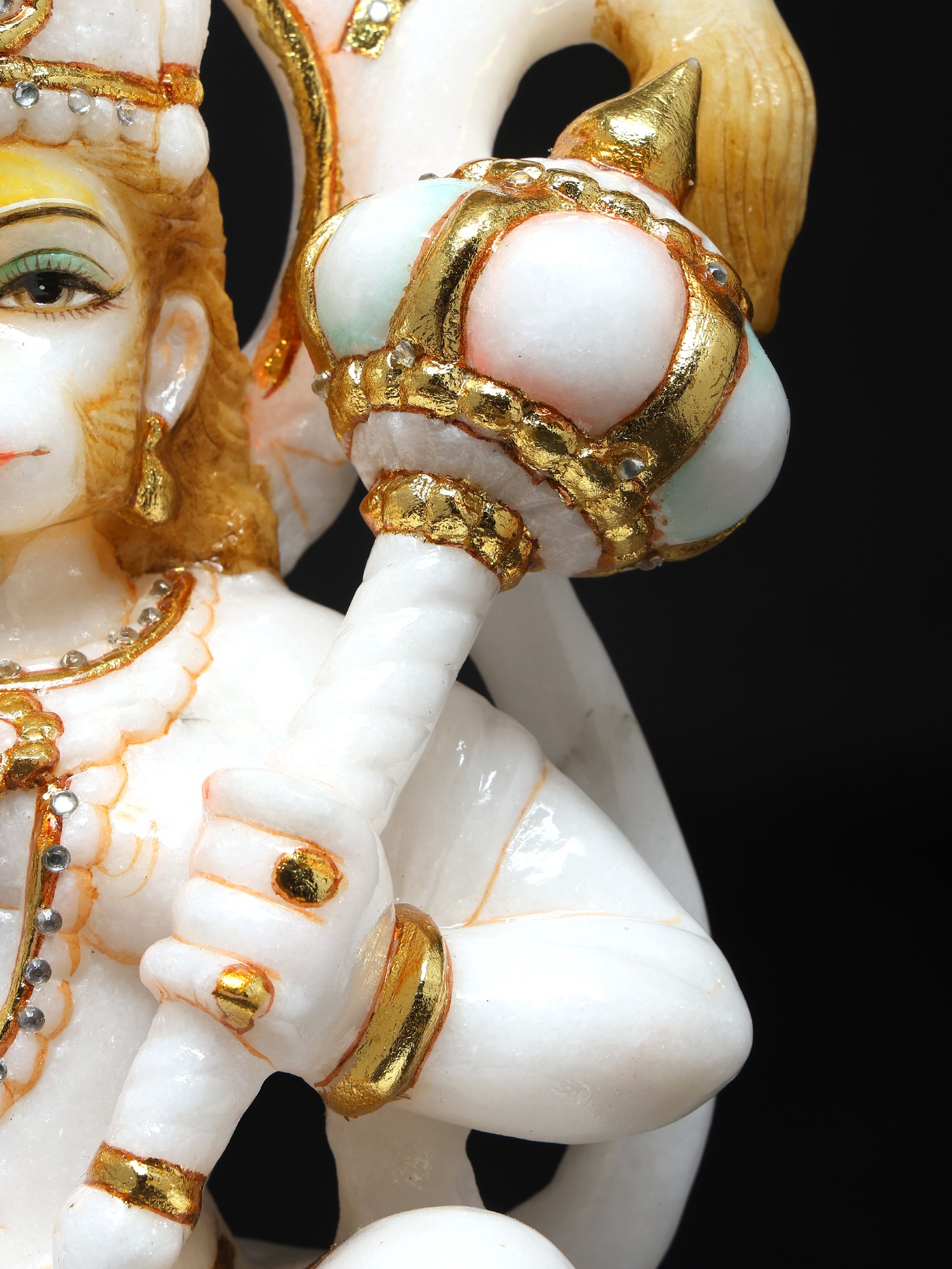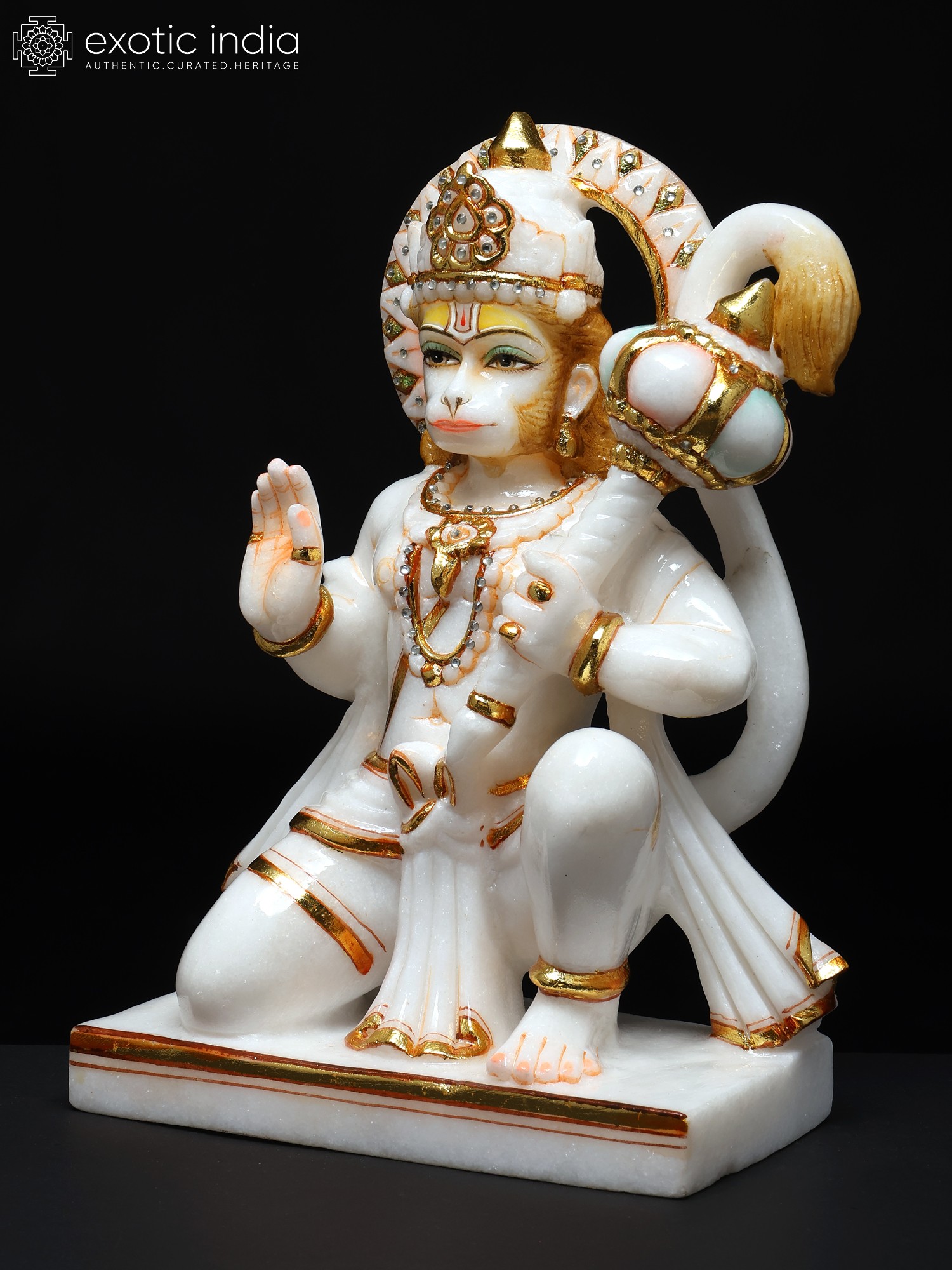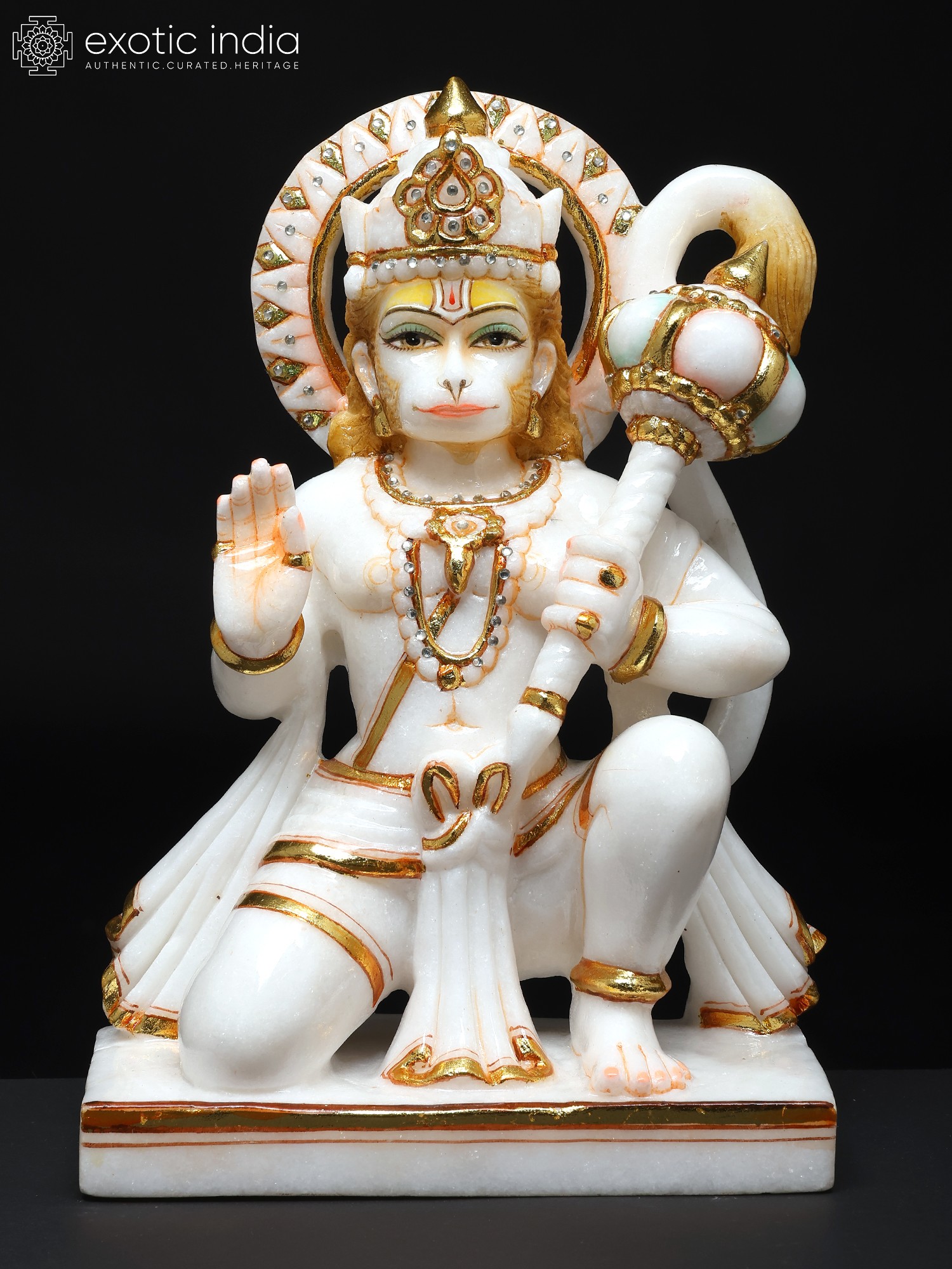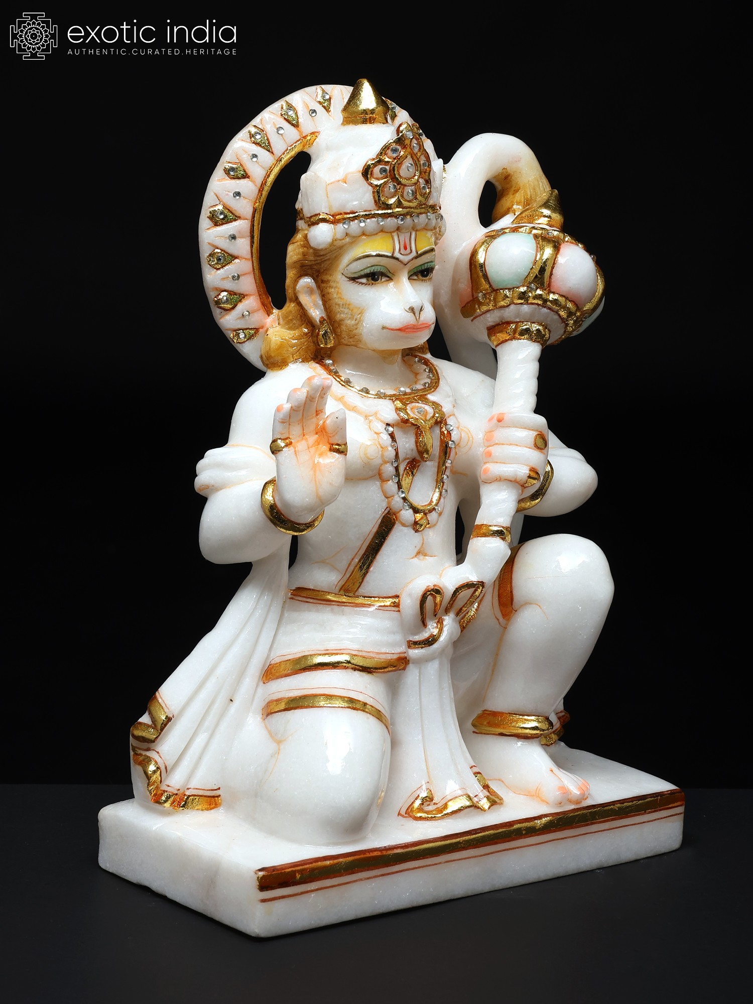 Invite the divine presence of Lord Hanuman into your home with this exquisite white marble statue. Handcrafted with meticulous attention to detail, this 12-inch sculpture captures the essence of the powerful and devoted deity, known for his unwavering loyalty, immense strength, and selfless service. The serene yet commanding posture of Hanuman Ji, depicted here in a kneeling stance, holding his mace (Gada) and offering blessings with his raised hand, conveys a sense of peace, protection, and spiritual fortitude. The pure white marble, sourced for its pristine quality and subtle veining, serves as a canvas for the divine form. Intricate gold accents adorn the statue, highlighting Hanuman Ji's regal crown, ornate jewelry, and the flowing drapery of his attire. These golden embellishments not only add a touch of opulence but also symbolize the sacredness and divine aura surrounding this revered figure. The eyes, delicately painted, seem to hold a profound wisdom and compassion, reflecting his deep spiritual connection. ––––––––––––––––––