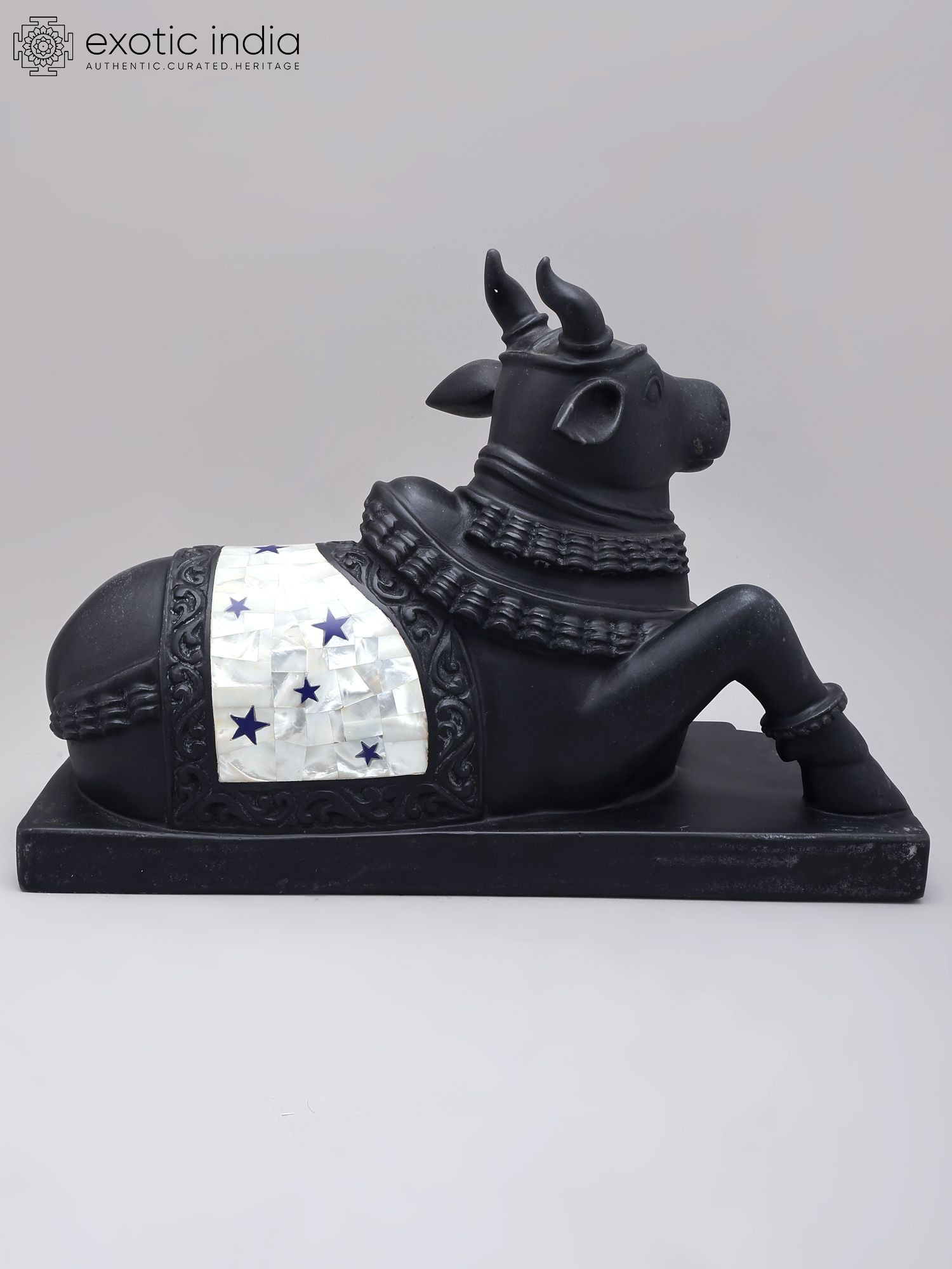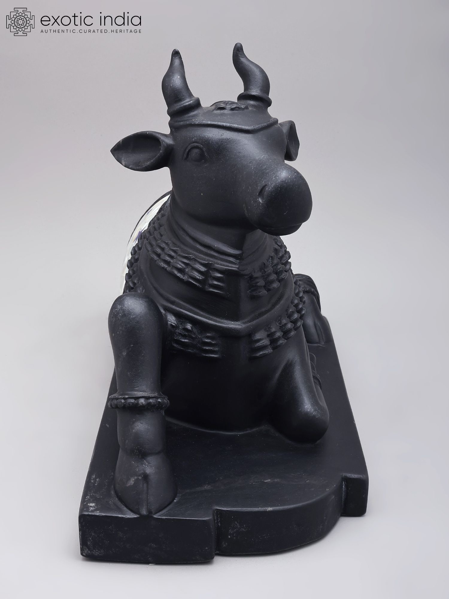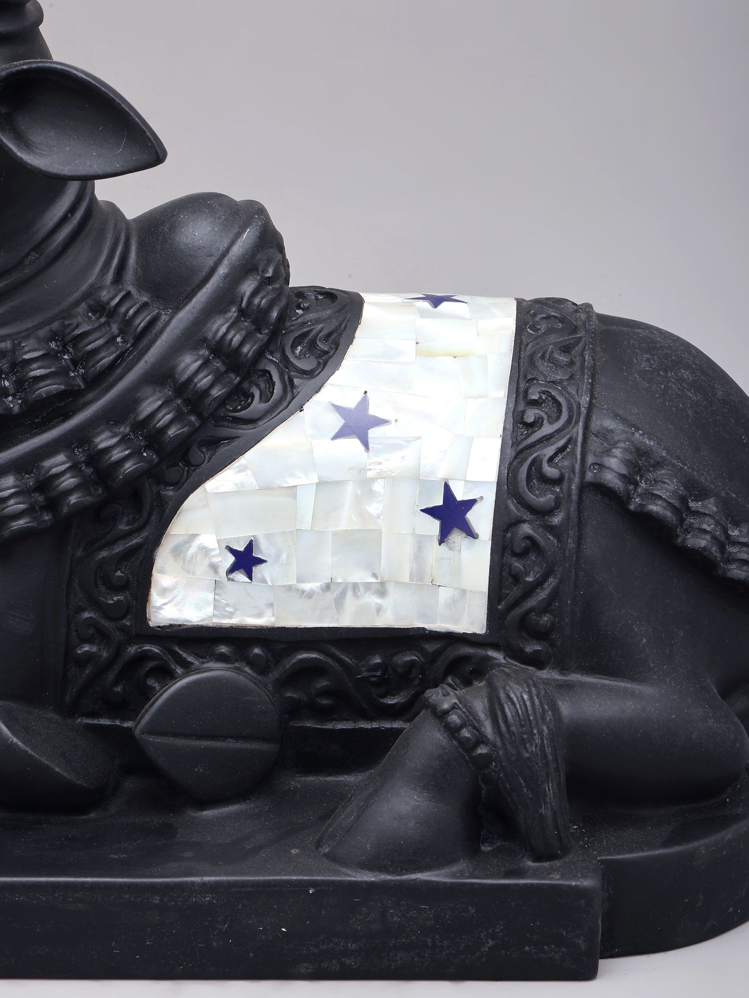 This black marble Nandi statue represents the sacred vahana (mount) of Lord Shiva.