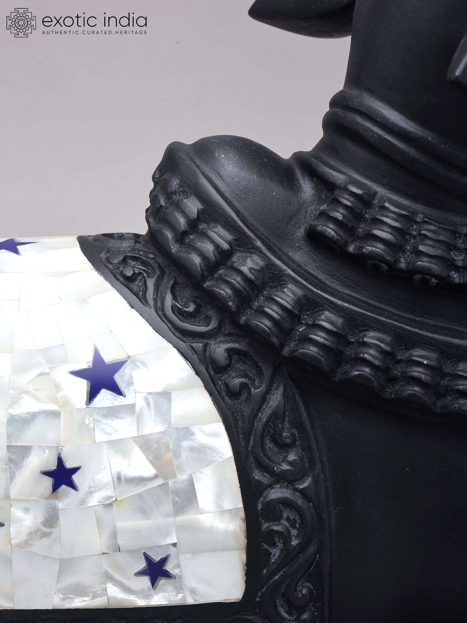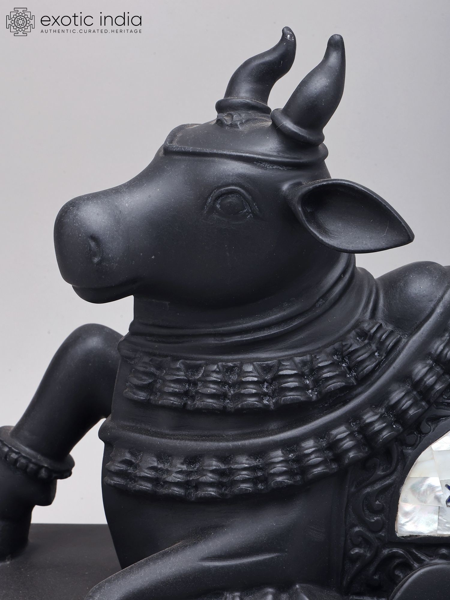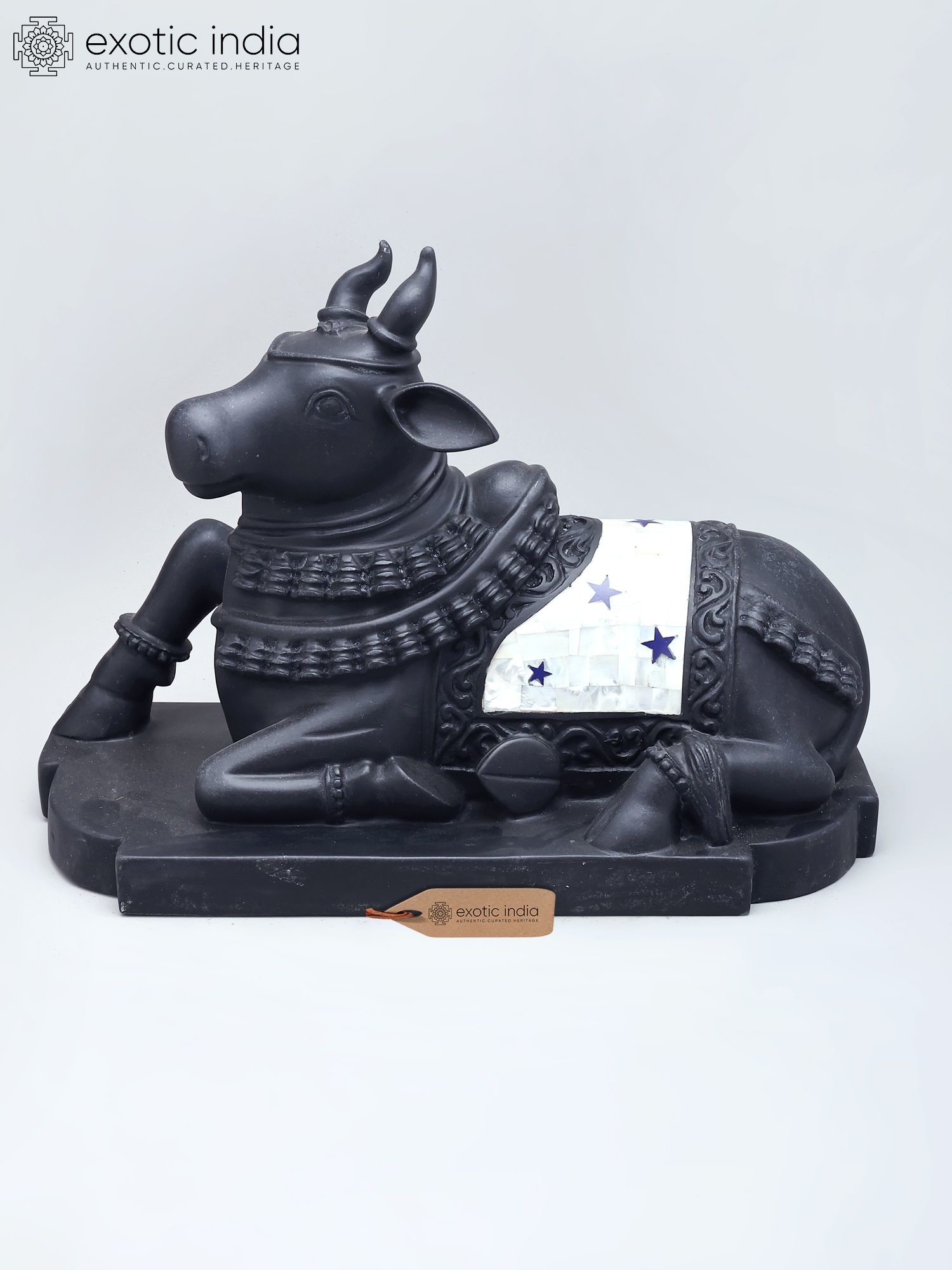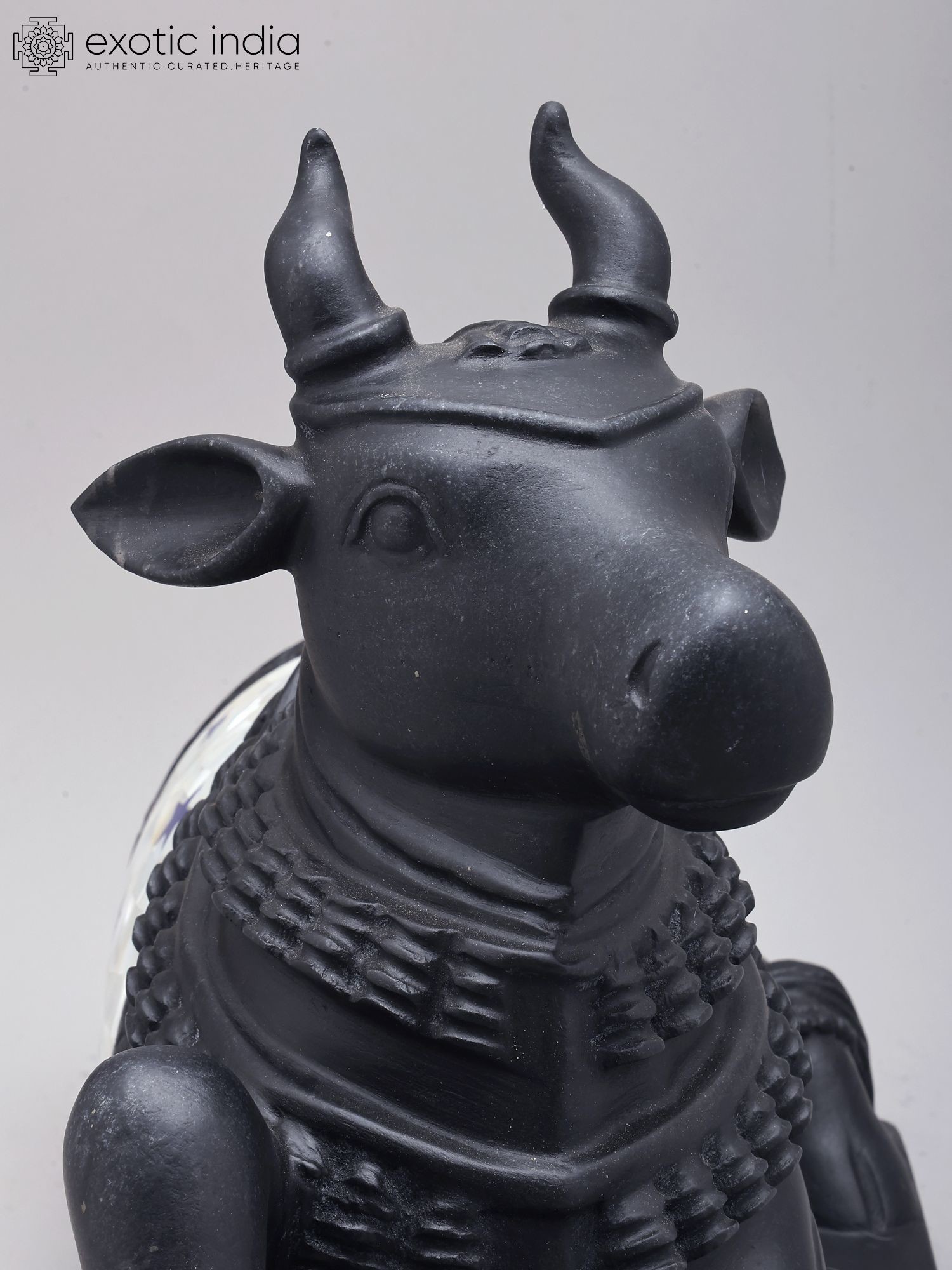 This black marble Nandi statue represents the sacred vahana (mount) of Lord Shiva.