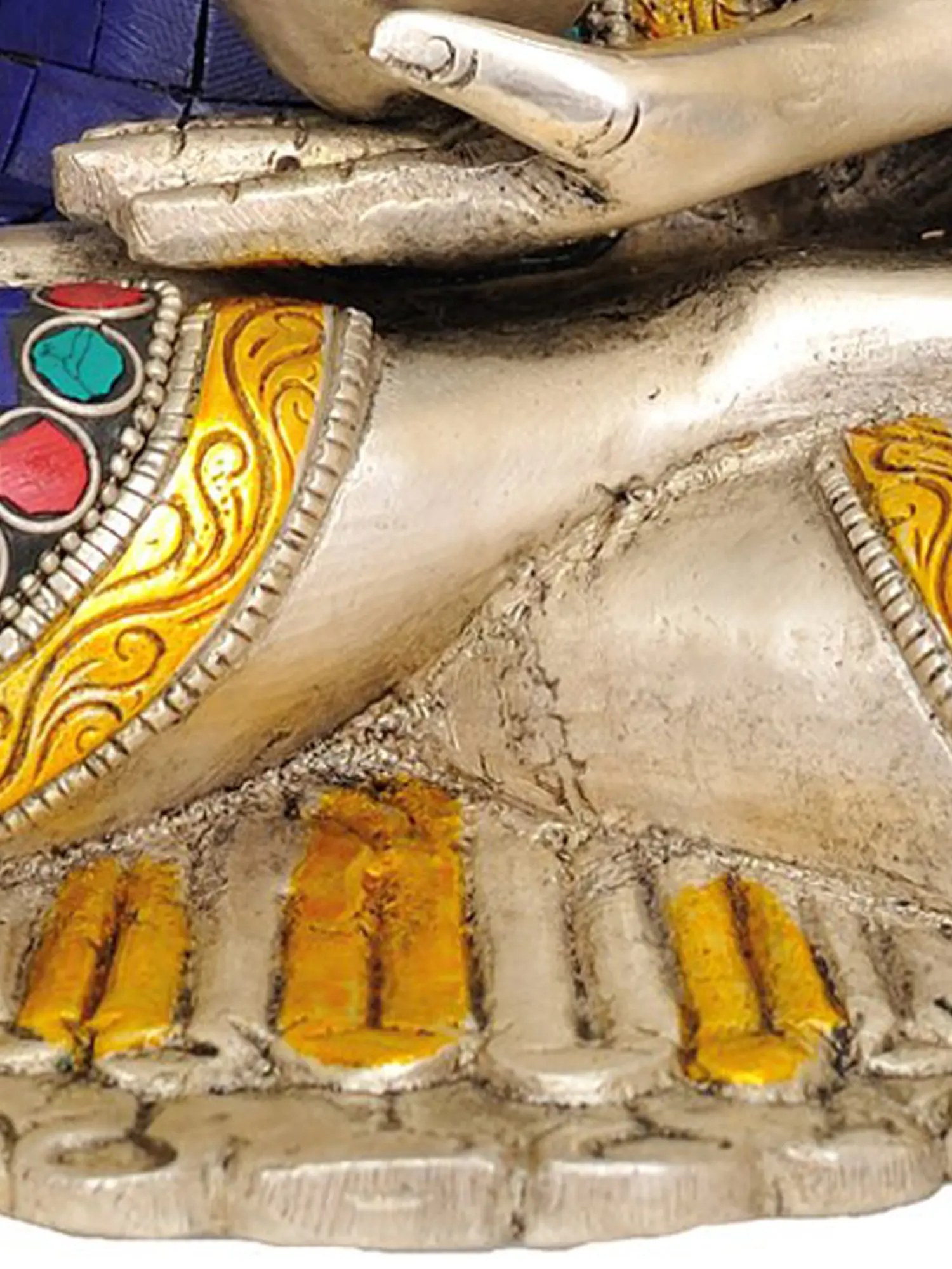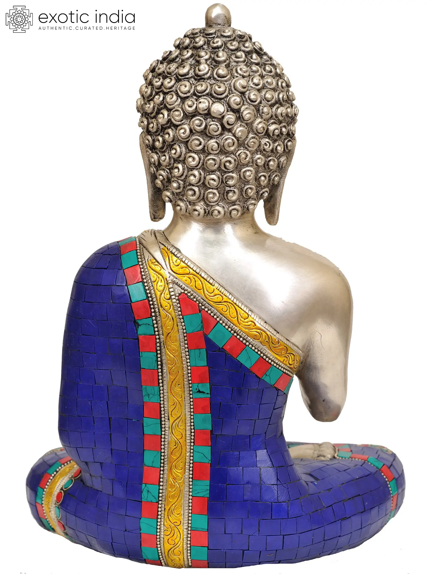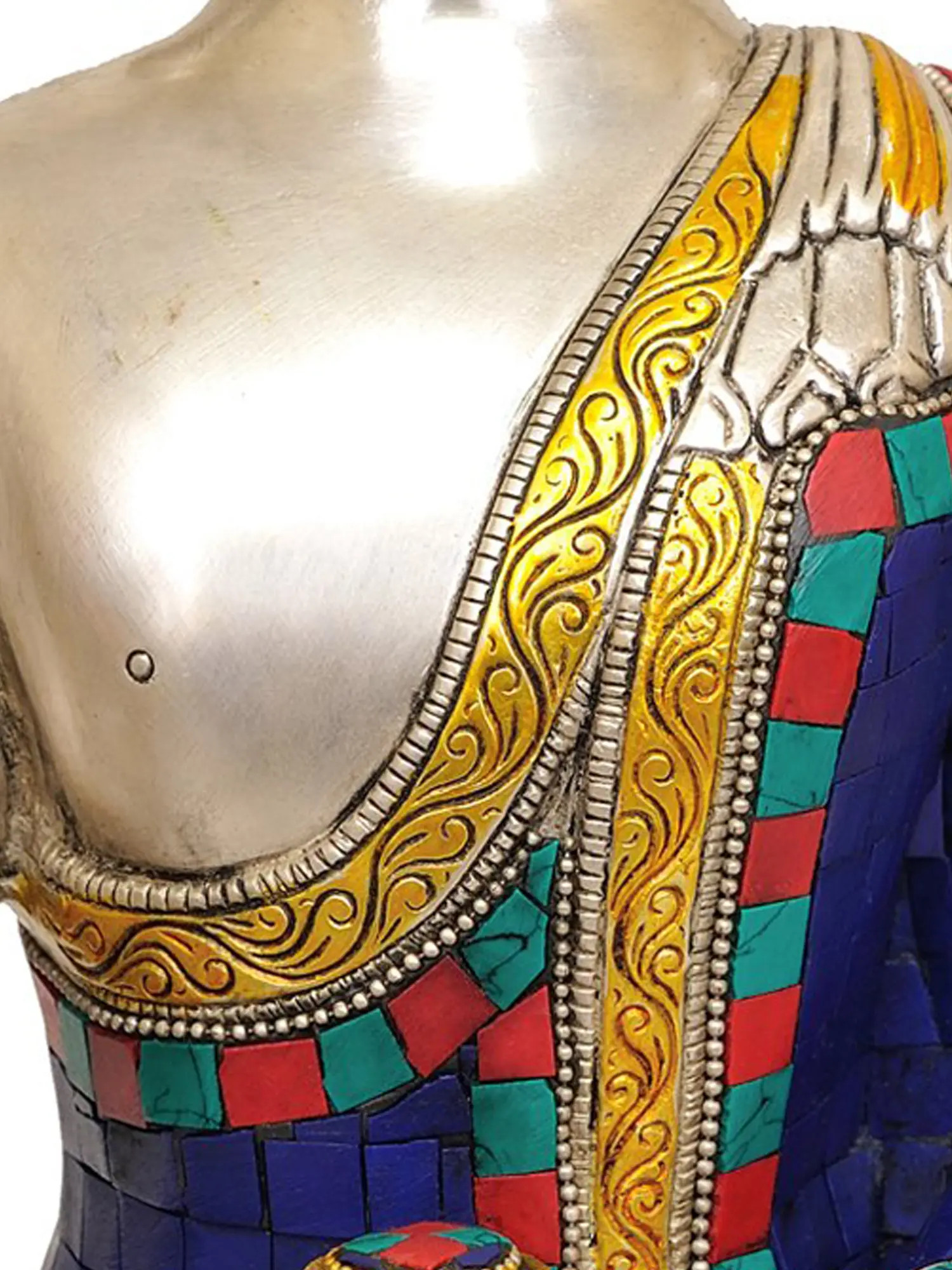 The use of brass, a material revered for its durability and lustrous finish, lends this statue a timeless quality. The intricate inlay work, featuring vibrant stones, adds a layer of opulence and signifies the richness of Buddhist philosophy. Each inlaid stone is carefully placed, creating a mosaic of color that enhances the visual appeal and spiritual depth of the sculpture. The rich blue of the robe, reminiscent of lapis lazuli, often associated with wisdom and truth in various cultures, is beautifully complemented by accents of red and green, suggesting vitality and growth. The golden border, meticulously etched with traditional patterns, speaks to the enduring legacy of Indian artistry and craftsmanship.