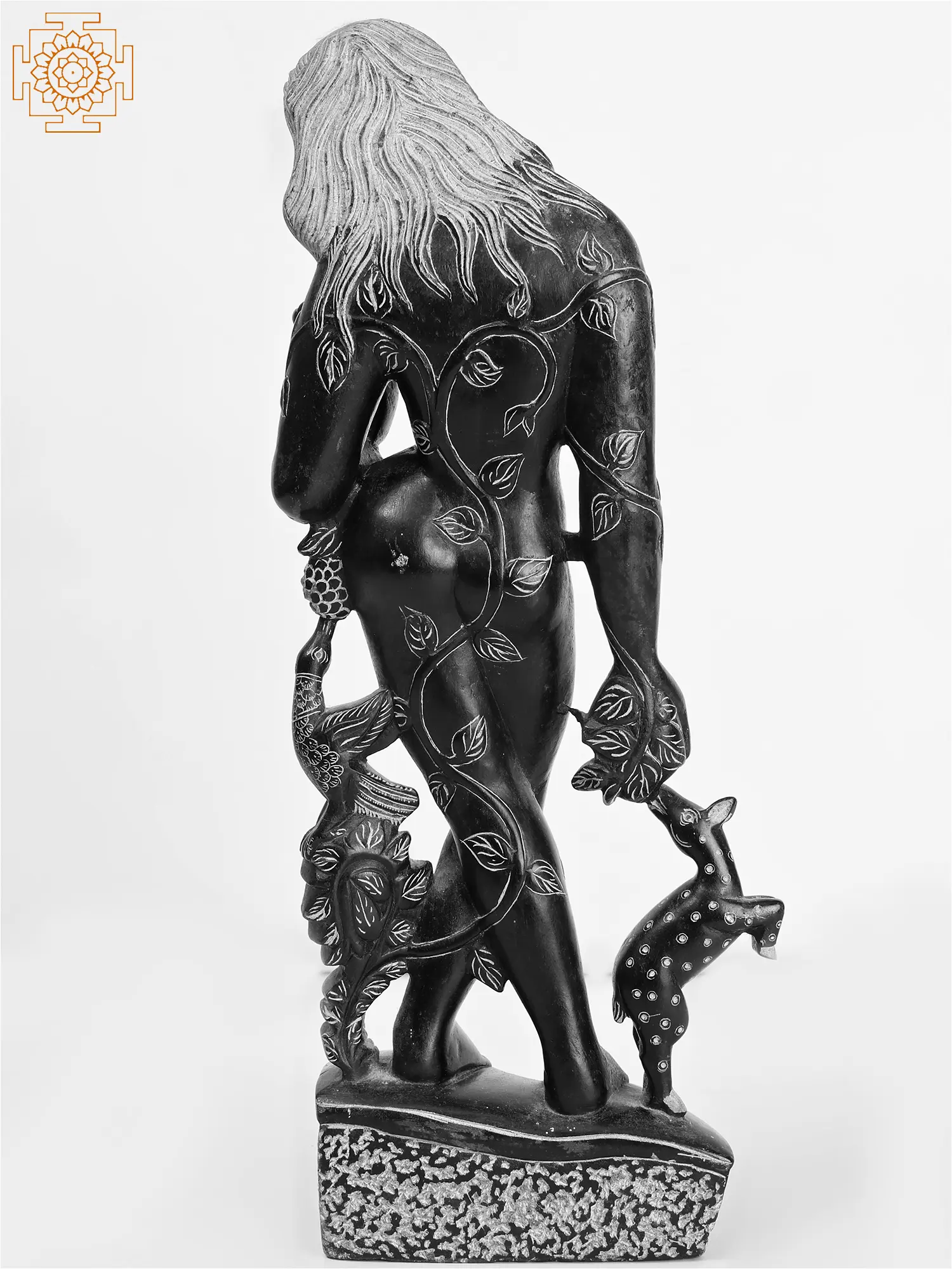 Wound around the soft curves of Shakuntala’s form is a lengthy sprig of leaf-laden vine. Etched into the graciously sculpted Kadappa stone, they are discernible by the silvery grey colour, which accentuates the deep, natural black colour of the limestone.