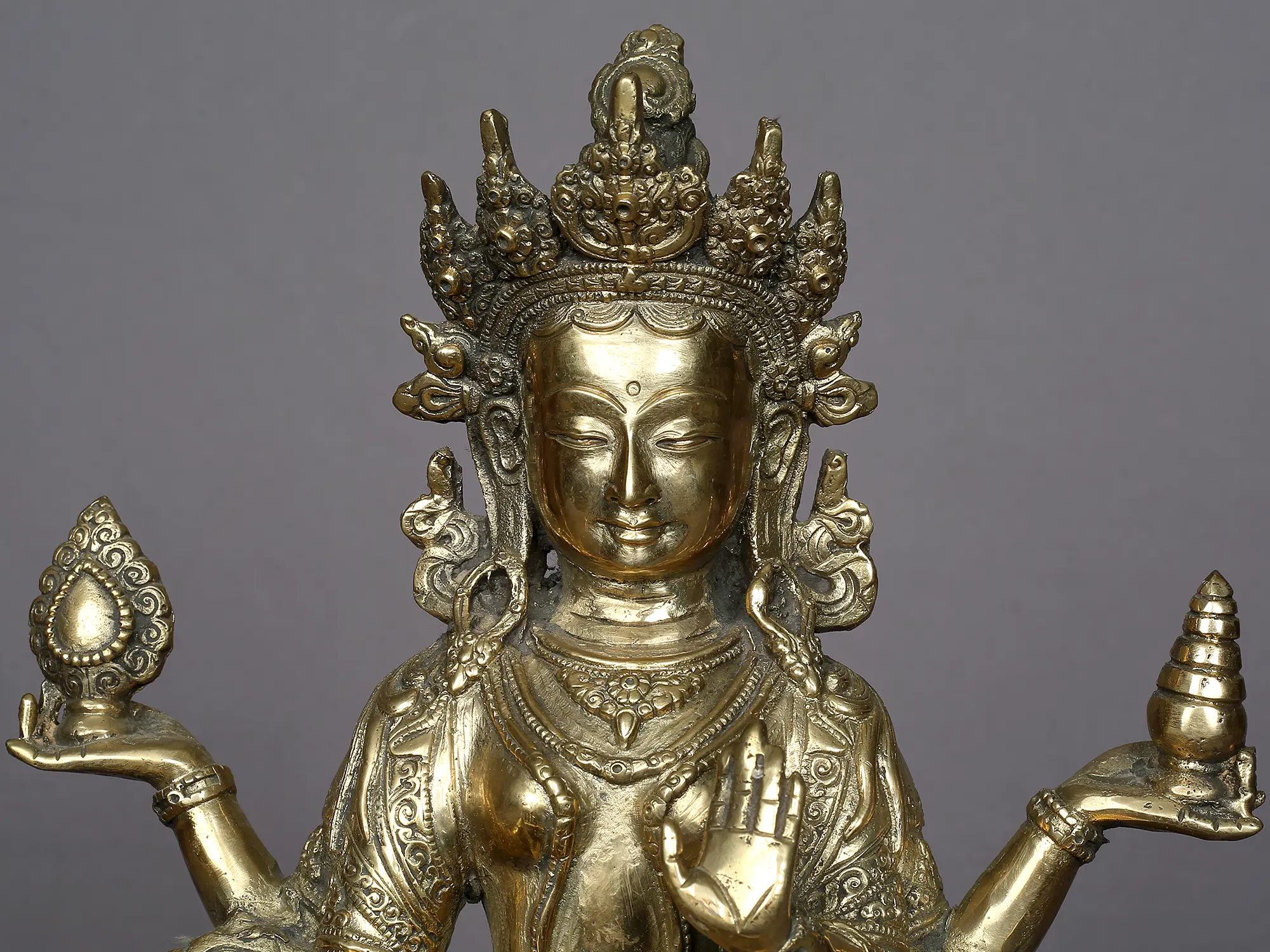 Lakshmi or Laxmi in Newari culture is similar to her aspect in Hinduism of India, where she is revered as a mother-goddess, who bestows auspiciousness and wealth. In the iconography of Nepal however, Lakshmi is represented in a Buddhist idiom, adorned with traditional ornaments, wearing the characteristic brocades of Buddhist deities, and with facial features that match the expressions of Green Tara. This glistening copper statue of Lakshmi from Nepal shows the goddess in her Chaturbhuja or four-armed form, wearing the five-pronged crown, silken scarf, and dhoti, with a narrow waist and youthful features.
