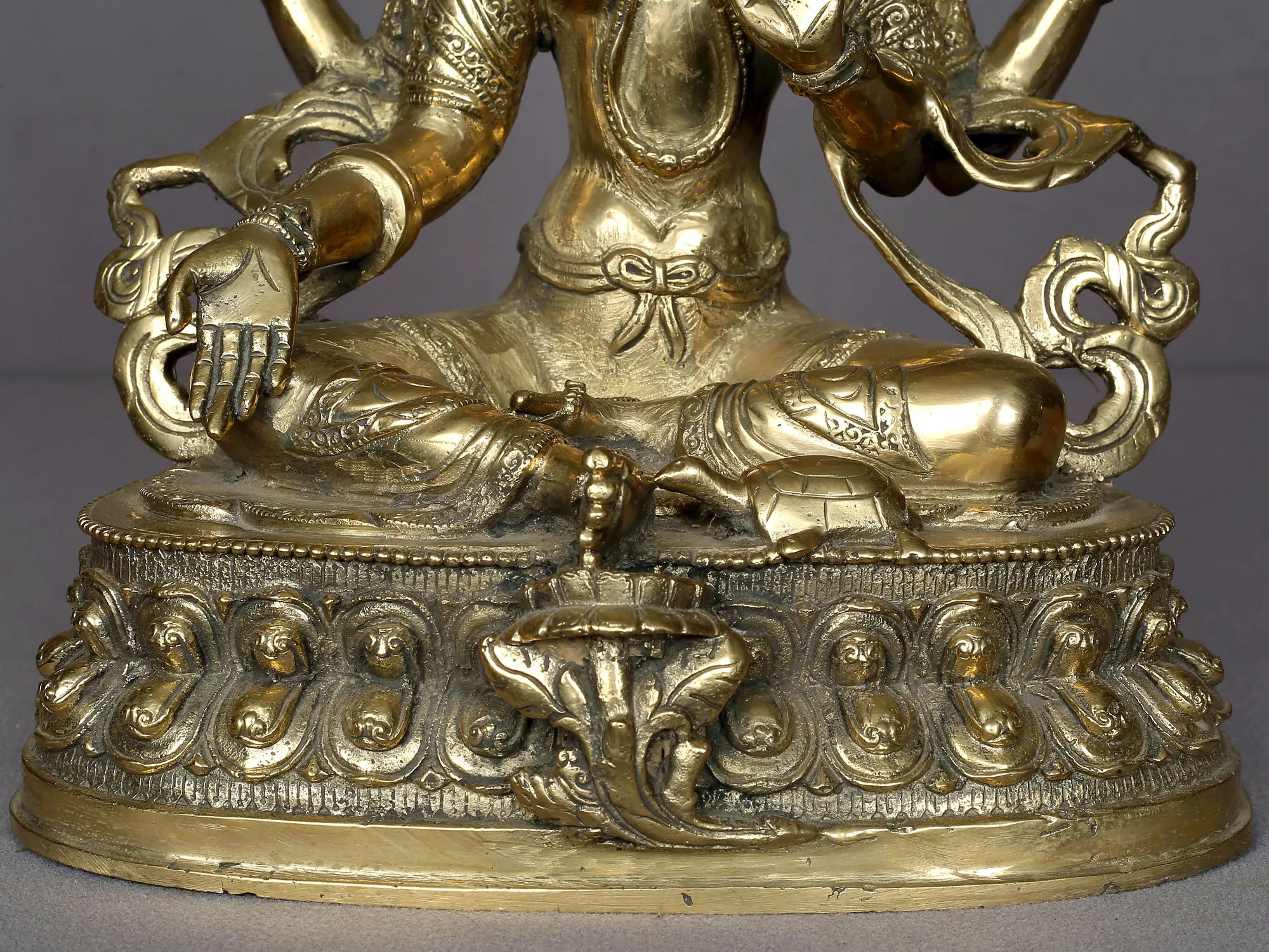 She carries the Nepalese attributes- mirror and sindoor (vermillion) container, an essential part of many rituals in Newari Hindu culture. Her primary hands are in Abhaya and Varada, the gestures of fearlessness and giving boons respectively. She sits on an ornate lotus throne, with her extending leg balanced by a smaller lotus flower, accompanied by her mount Kurma or tortoise, a part of her iconography in Nepalese art.