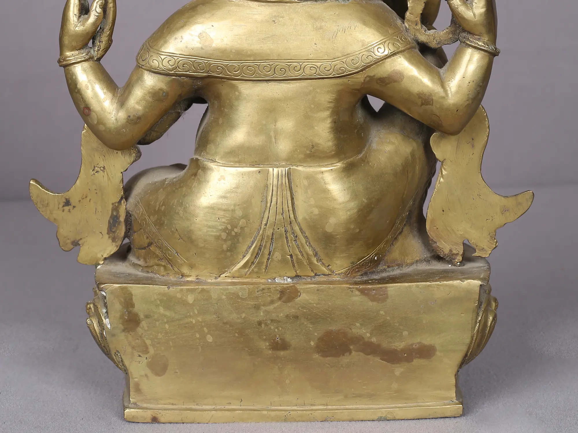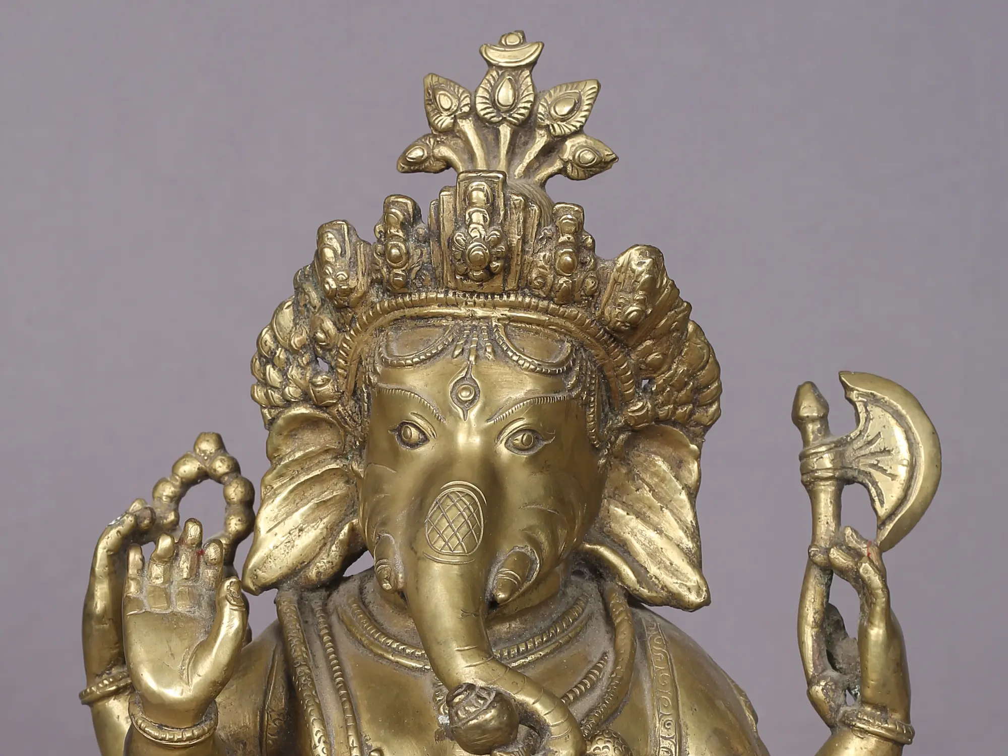 Lord Ganesha is revered for his wisdom and knowledge, often regarded as the foremost deity bestowing luck and blessings upon our lives. Lord Ganesha holds his ax of dispelling ignorance in his left hand, seated in a relaxed posture atop a moon disc resting on a lotus.