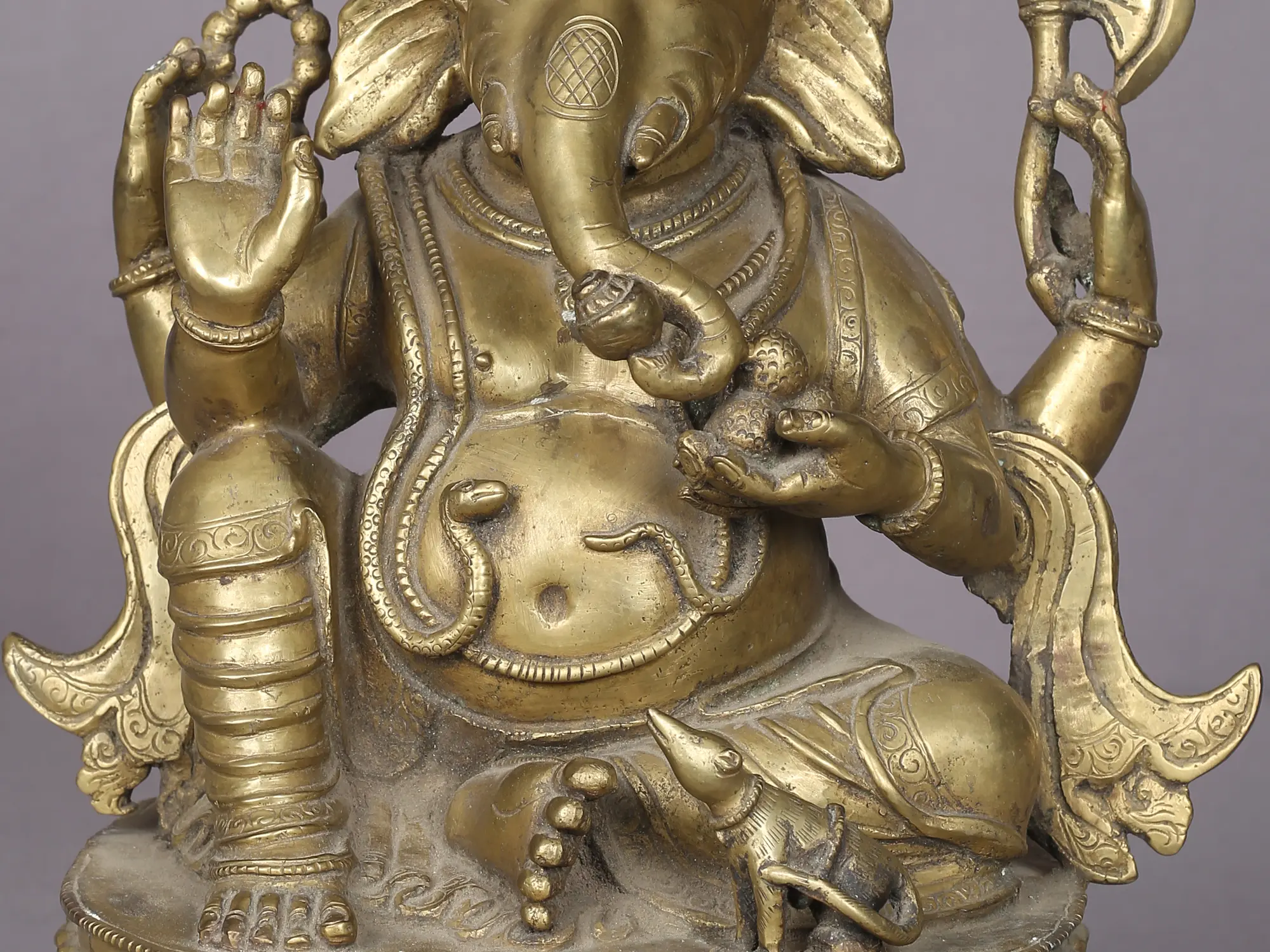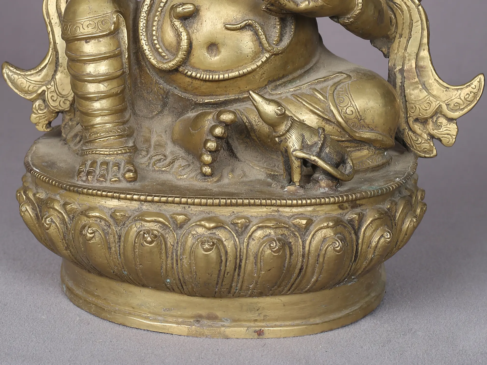 He is seated with his constant companion, the mushak, which symbolizes the all-encompassing omniscient Brahman. This creature, dwelling in the hidden depths of the earth, represents ignorance's fear of light and knowledge, emphasizing the importance of remaining vigilant and illuminating our inner selves. The mouse's agility reflects our sensory nature and its hyperactive qualities. Always found by the Lord's side, the mouse acts as an intermediary for devotees, conveying their whispered wishes to Ganesha for their fulfillment.